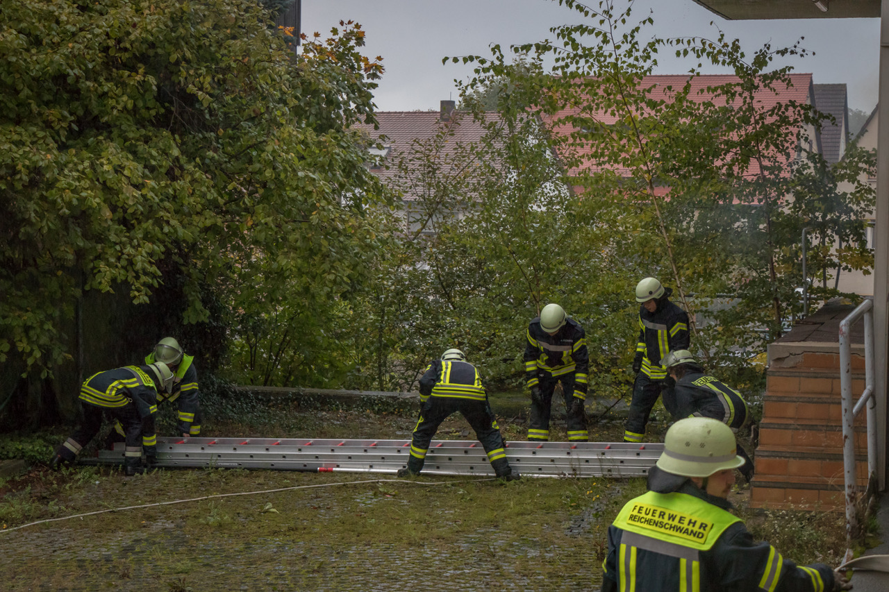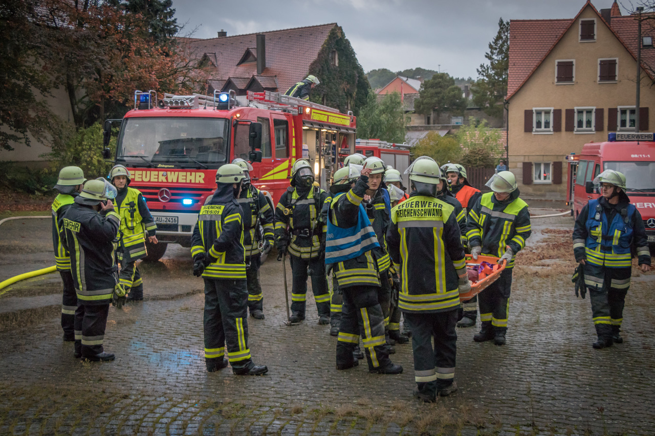 Während sich Speikern um Wasserversorgung und Außenangriff kümmerte, rückten die Einheiten aus Reichenschwand zur Menschenrettung und Brandbekämpfung in den zweiten Stock vor. Zwei Jugendliche wurden mit Brandfluchthauben ins Freie gebracht - eine dritte Person, welche abgestürzt war, musste mit einer Schleifkorbtrage aus einer Tiefe gerettet werden.
