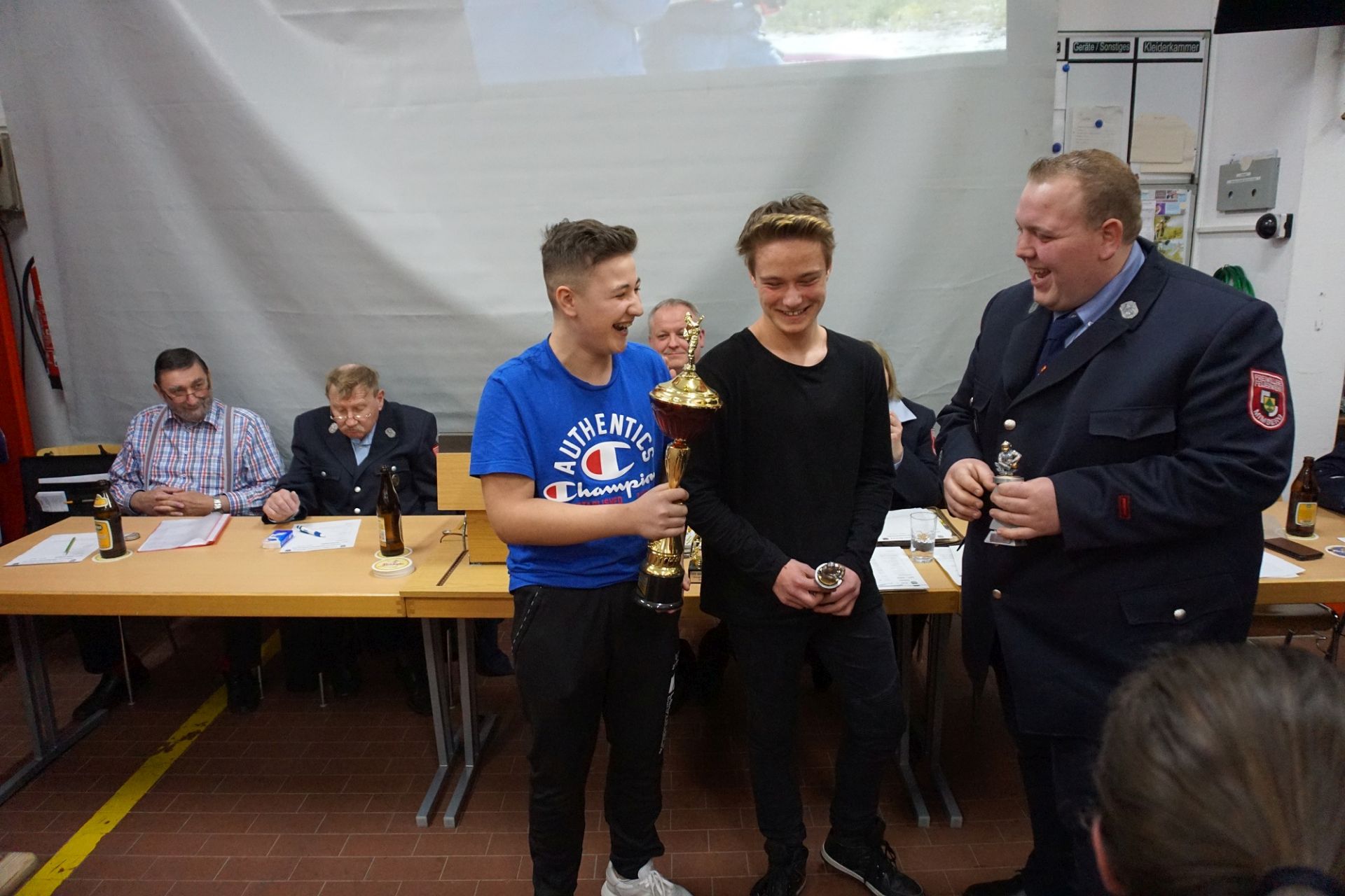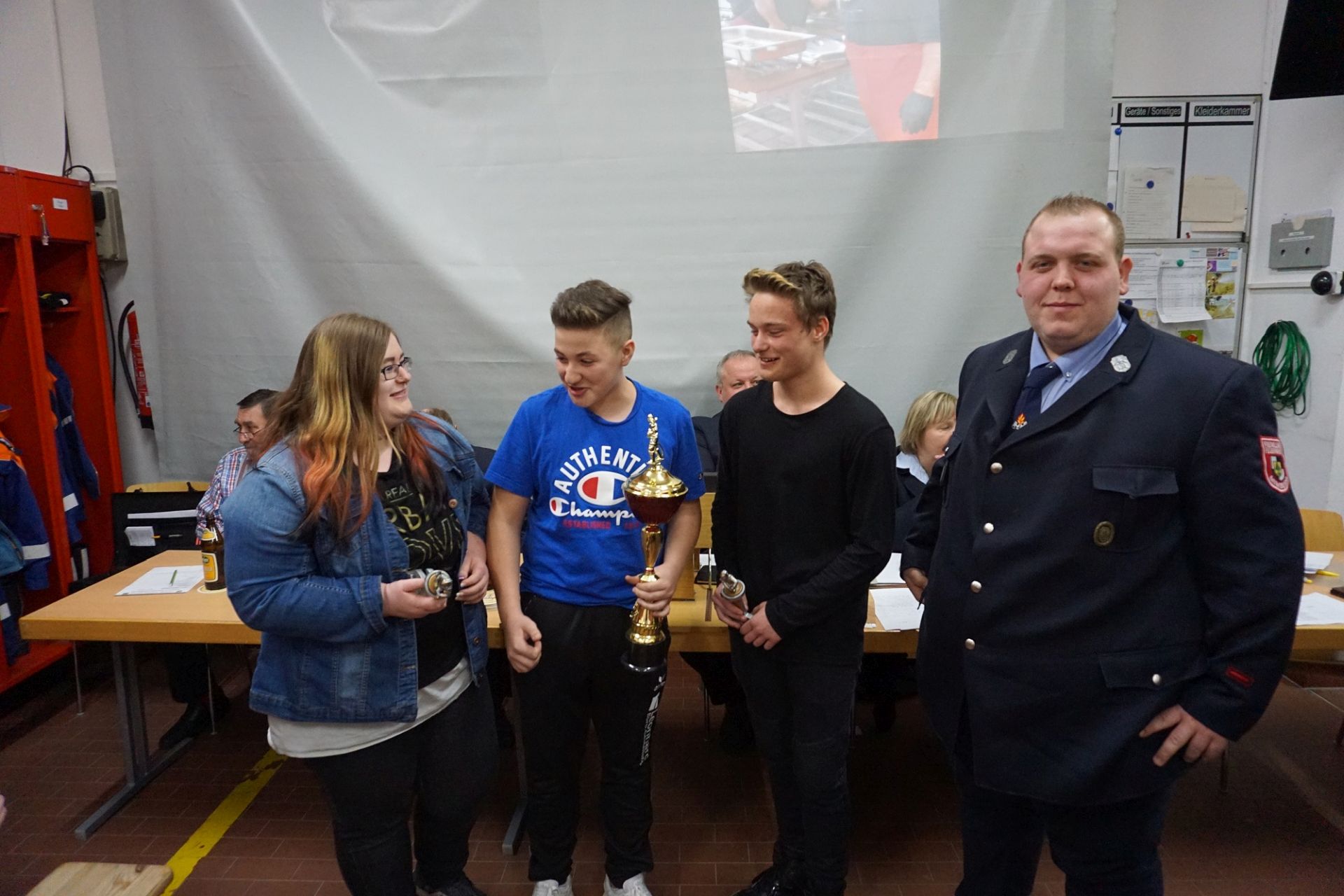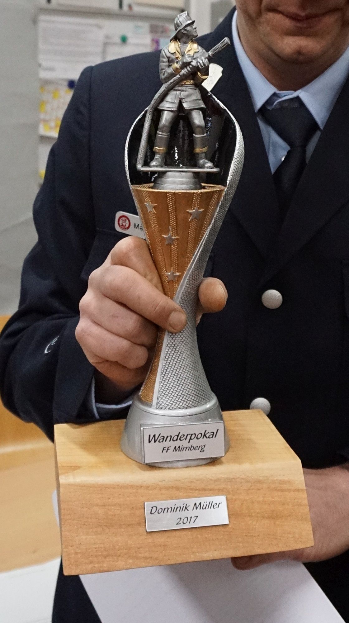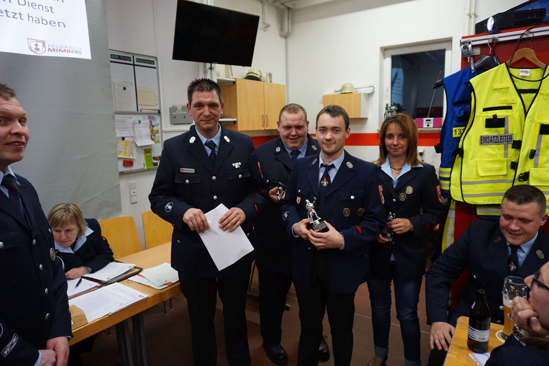 Ein Überraschung der besonderen Art hielten noch die beiden Kommandanten Maik und Christian Heyden sowie Christopher Eckersberger parat. Sie verliehen kleine Pokale für die aktivste Übungsteilnahme an ihre Aktiven und Jugendlichen. Zusätzlich gab es noch für die jeweils häufigste Übungsteilnahme einen Wanderpokal, welchen es im nächsten Jahr zu verteidigen gilt. Die Pokale gingen in diesem Jahr an die Kameradinnen und Kameraden Christopher Eckersberger und Alexandra Schramm 3.Platz, Michael Meier 2. Platz und Dominik Müller 1. Platz, bei den Jugendlichen Hafner Nadine 3. Platz, Heger Nadja 2. Platz und Hübner Lukas und Hafner Dominik, welche zu zweit den Platz eins belegten.