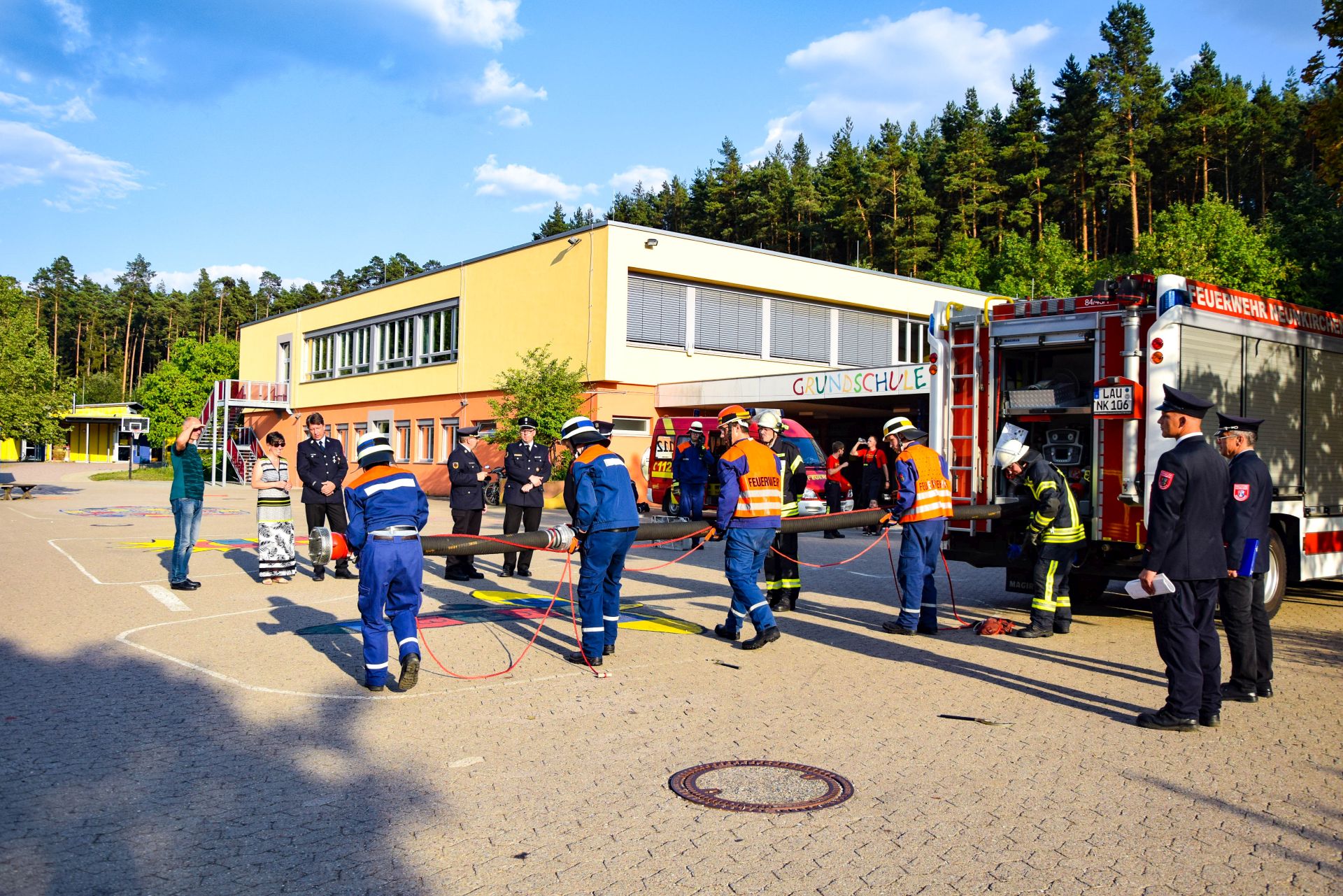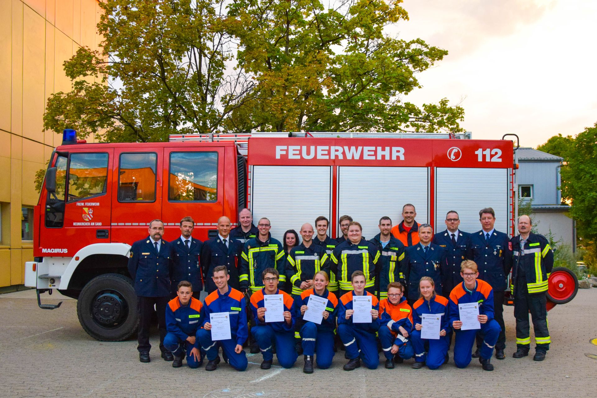 Neunkirchen (DB 2) - Am Donnerstag, den 26.07.2018 standen für die Feuerwehr Neunkirchen zwei Prüfungen auf dem Plan. Neben der Prüfung für das Basismodul 1 der Modularen Truppausbildung wurde auch die Leitungsprüfung „Die Gruppe im Löscheinsatz“ abgenommen.