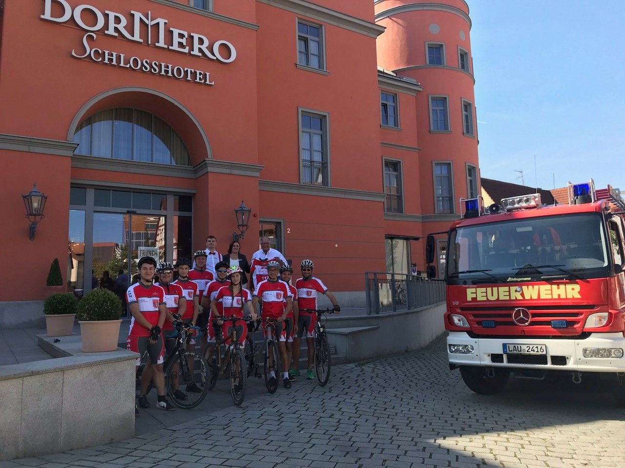 Auch über die passenden „Uniformen“ verfügt die Radsportgruppe nun seit dieser Woche. Dank einer Spende des DORMERO Schloßhotel Reichenschwand und weiterer örtlicher Gönner konnten eigens designte Radsport-Hosen und Shirts beschafft werden. Rot-Weiß, in Flammenoptik und mit dem Wappen der Wehr auf der Brust sind die Trikots ein echter Blickfang.