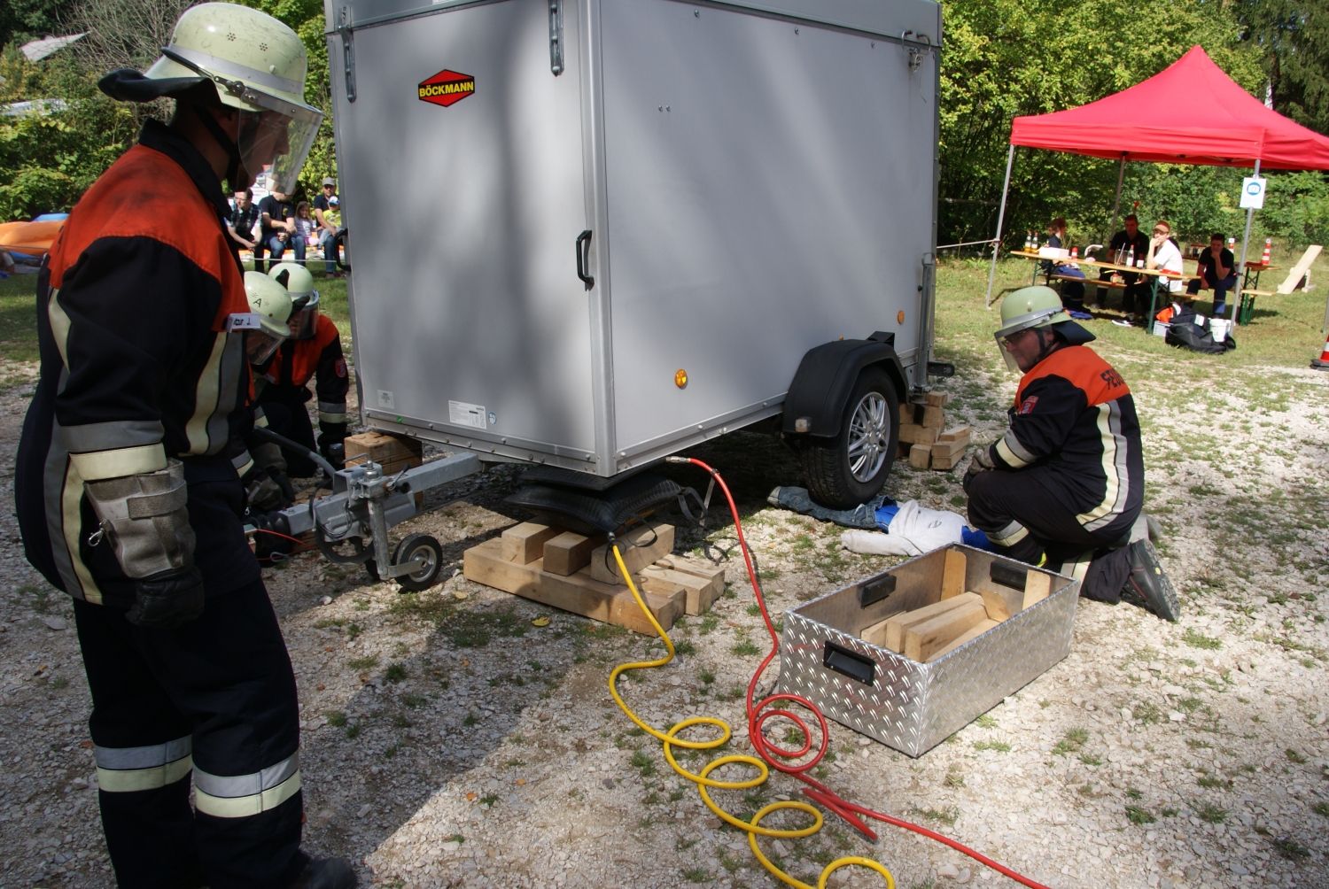 Bei einer Schauübung demonstrierten die Moosbacher Feuerwehrleute ihr Können. Angenommen wurde ein Verkehrsunfall, bei der eine Person unter einem Anhänger eingeklemmt war. Zu dem „Einsatz“ wurden die Aktiven mittels Sirene alarmiert und fuhren mit Blaulicht und Martinshorn die Einsatzstelle an. Vor Ort wurde zunächst vom Einsatzleiter die Situation geklärt, bevor im Anschluss der Anhänger sicher unterbaut wurde. Im nächsten Schritt wurden Lufthebekissen eingesetzt, um die verletzte Person zu retten. Im Rahmen der Übung konnte den Besuchern anschaulich demonstriert werden, wie professionell und schnell Personen aus einer misslichen Situation von der Feuerwehr befreit werden können.
