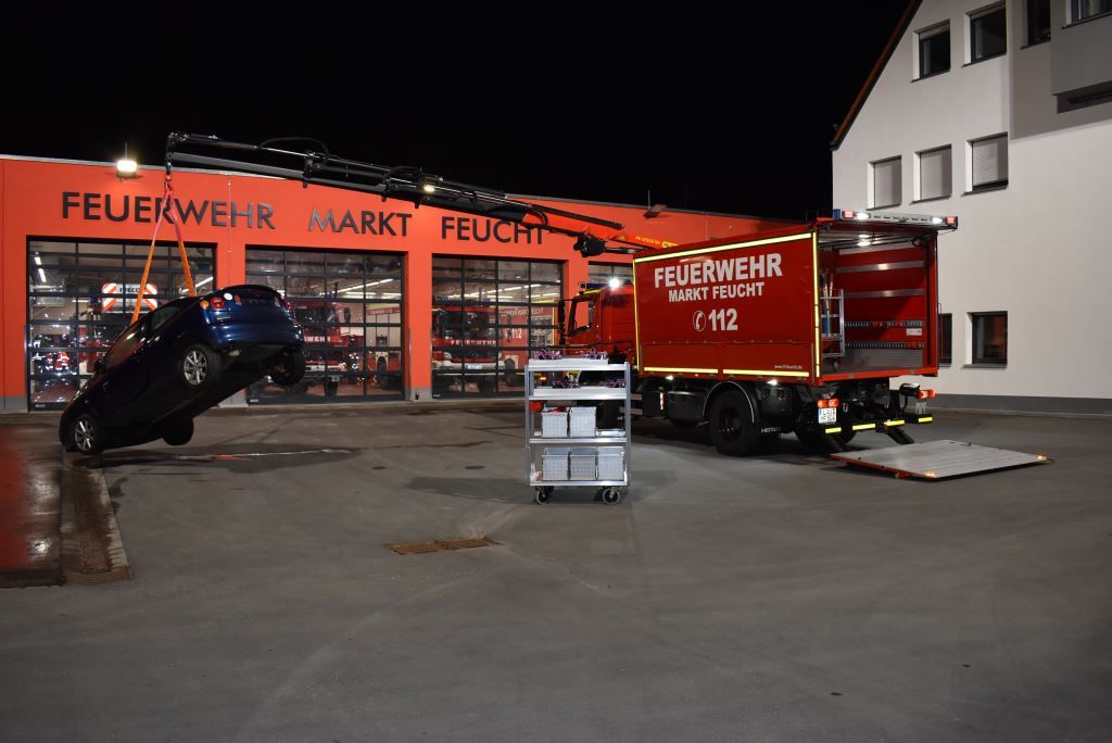Damit das Fahrzeug auch bei Dunkelheit sicher eingesetzt werden kann, ist eine Umfeld Beleuchtung auf den Seiten und am Heck angebracht. Die Ladefläche ist ebenfalls ausgeleuchtet. Zur Sicherheit im Straßenverkehr gibt es eine gelbe Heckwarneinrichtung und eine auffällige Streifen-Beklebung der Ladebordwand. Die restliche Beklebung und Beschriftung orientieren sich am „Feuchter Design“ der schon vorhandenen Fahrzeuge.