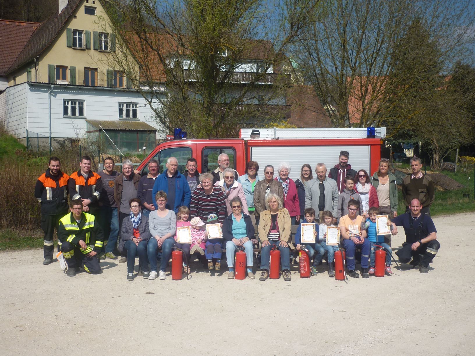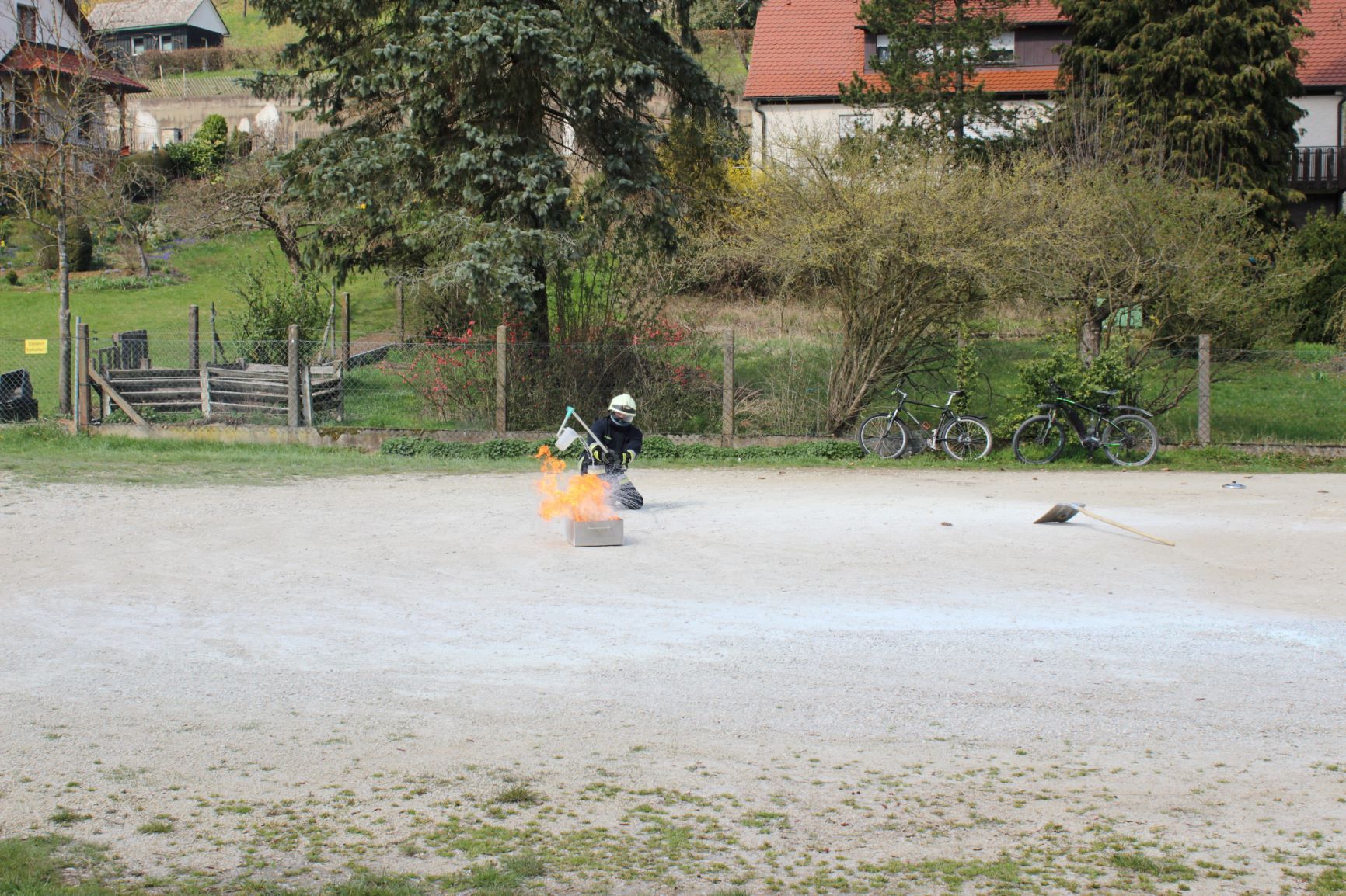 Im Anschluss wurde eine praktische Übung abgehalten, bei der jedem die Möglichkeit gegeben wurde selbst Hand am Feuerlöscher anzulegen. Das vorher gelehrte wurde nun in die Praxis umgesetzt. Egal ob klein oder groß, alle waren mit „Feuereifer“ dabei. Simuliert wurde ein Flüssigkeitsbrand, der mit einem geeigneten Löscher bekämpft werden musste. Für jeden Teilnehmer stand ein Feuerlöscher bereit um sich mit dem Löschgerät vertraut zu machen. Die Feuerlöscher wurden der Reihe nach scharf gemacht und der Brandherd erfolgreich bekämpft. Zum Abschluss des praktischen Teils wurde ein falsches Ablöschen eines Fettbrandes mit Wasser vorgeführt. Im Anschluss der Veranstaltung traf man sich am Feuerwehrgerätehaus zu Kaffee und Kuchen, wo man den Nachmittag in gemütlicher Runde ausklingen lies. Das Resüme der Teilnehmer bestätigte der Wehr eine rundum gelungene Veranstaltung.