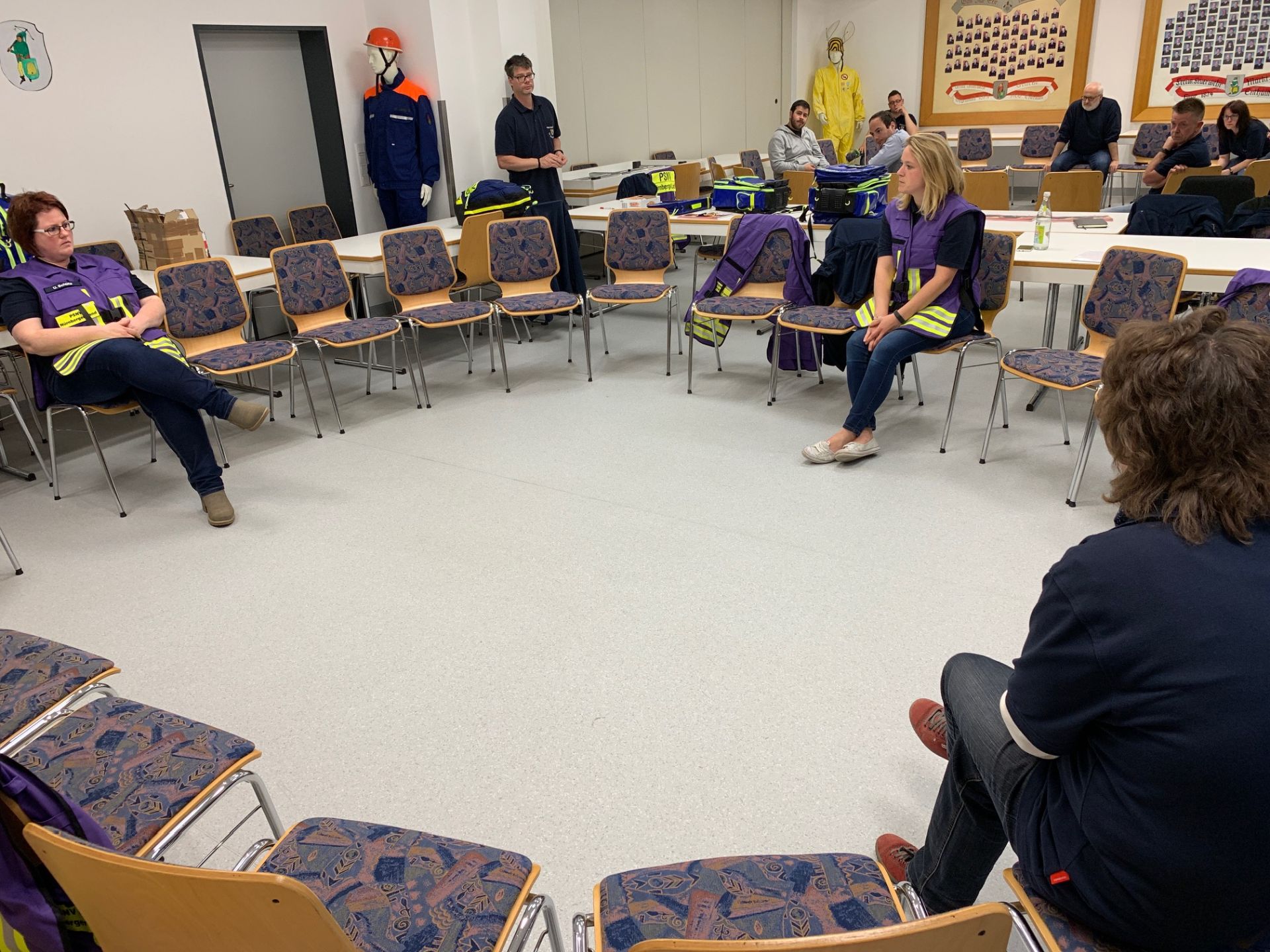Während eine Gruppe der PSNV-E am Einsatzort blieb, sich mit dem Einsatzleiter und der nachrückenden PSNV-B abstimmte, Rückzugsmöglichkeiten und den Transport für die betroffenen Einsatzkräfte klärte - bereitete der Rest der Gruppe das Nachsorgegespräch in einem geschützten Rahmen und Ort vor. Dieser Bereich wurde in der Wache der Feuerwehr Feucht eingerichtet.