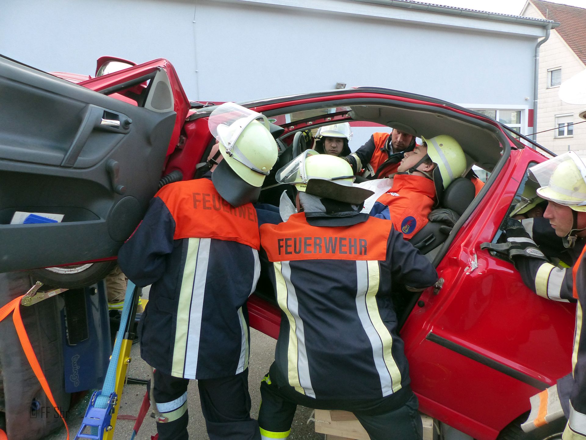 Unter der Anleitung des routinierten Ausbilders leisteten die Feuerwehrleute in zwei Gruppen reine Schwerstarbeit, um die Verletzten zu retten. Der Blick auf die Uhr ist dabei von großer Bedeutung. Trotz des Zeitdrucks ist aber auch Fingerspitzengefühl bei dem Umgang mit dem Patienten erforderlich. Am Ende des ersten Teils waren alle Unfallopfer in Rekordzeit aus den Fahrzeugen befreit.