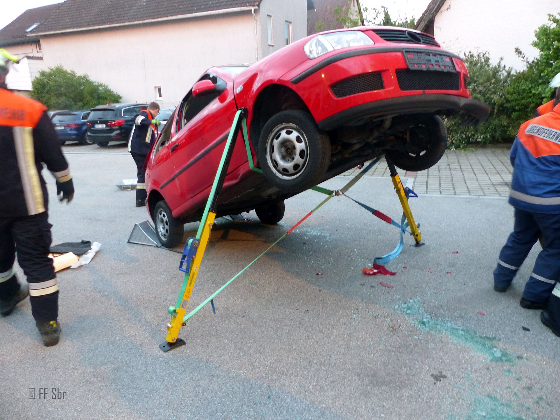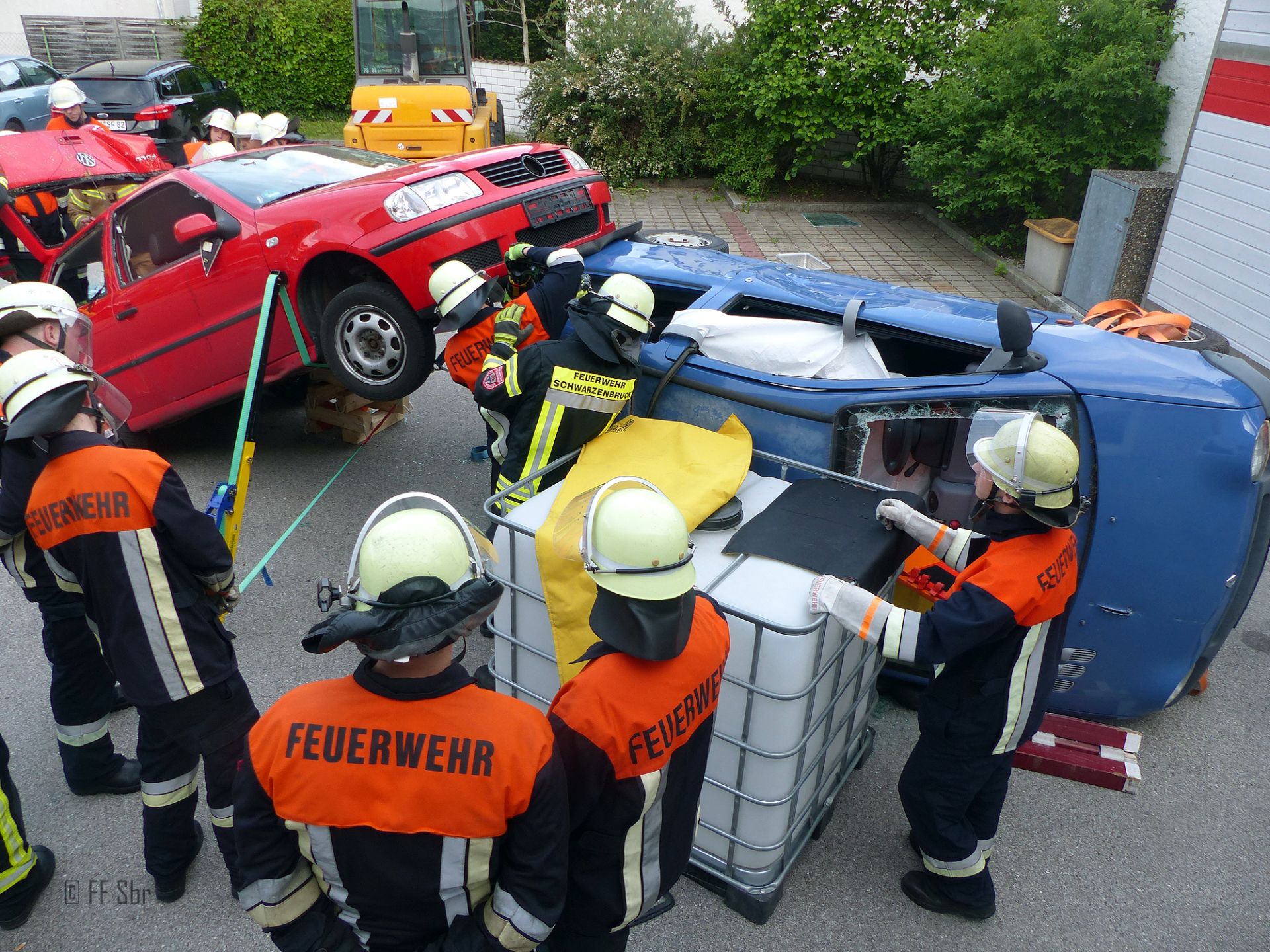 Schwarzenbruck (DB3) – Der Teamcaptain der Technischen Rettungsteams Nürnberg, Axel Topp, hat mit der Schwarzenbrucker Feuerwehr eine Übung zu nicht alltäglichen Verkehrsunfällen durchgeführt. Im Hof des Feuerwehrhauses wurde dafür ein Fahrzeug zur Seite gekippt und ein weiteres mit der Front auf das Heck des liegenden Autos gesetzt.