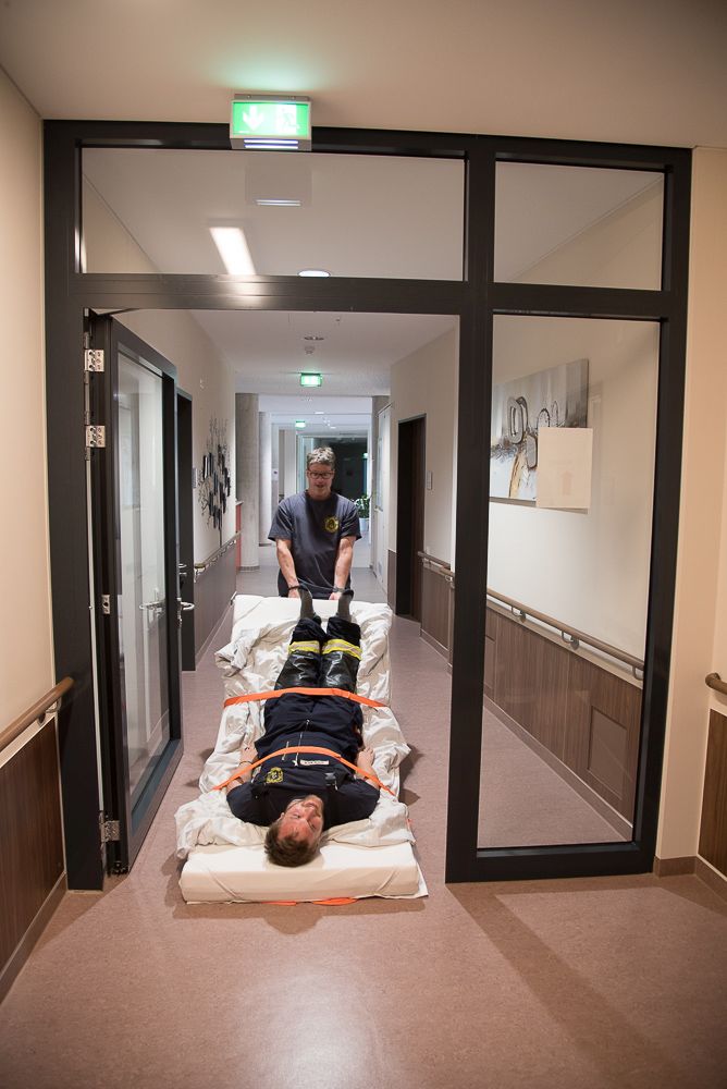 Im Modul 24.3 ging es unter der Leitung von OA Klaus Fessele und der Unterstützung von Florian Bayer und Markus Stelzer um die Rettung von Patienten. Eingangs ging OA Fessele auf die medizinischen Besonderheiten ein und erläuterte Anhand einer Beatmungspuppe den Umgang mit einer Intubierung. So wurde den Kameraden schnell klar, dass eine Rettung solcher Personen nicht durch einen Atemschutztrupp erfolgen kann. Florian Bayer zeigte noch verschiedene Rettungsmöglichkeiten zur Räumung oder Evakuierung anhand einer vorbereiteten Bilderreihe. Anhand von einem Spineboard und einem CombiCarrier (Kombination aus Spineboard und Schaufeltrage) wurden dann die Personen gerettet – eine Evakuierungsdecke, welche in manchen Häusern direkt unter der Matratze liegt, durfte natürlich auch nicht fehlen. Da in manchen Fällen auch fixierte Patienten anzutreffen sind, wurde auch die Öffnung dieser Fixierungssysteme besprochen. Als Highlight stand dann die Rettung mit einem Bergetuch auf der Fixierung durch eine Vakuummatratze an. Dazu wurden die Gerätschaften des Schwerlast RTW des BRK Nürnberg verwendet. Zum Abschluss gab es eine Erklärung des Schwerlast RTW und dessen Besonderheiten auch rund um die Beladung.