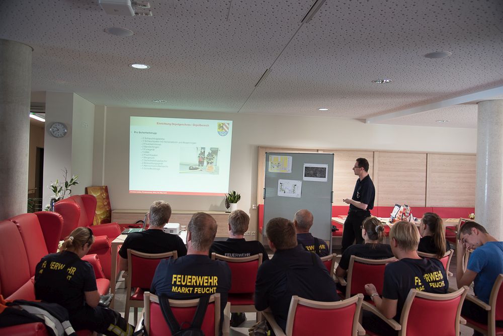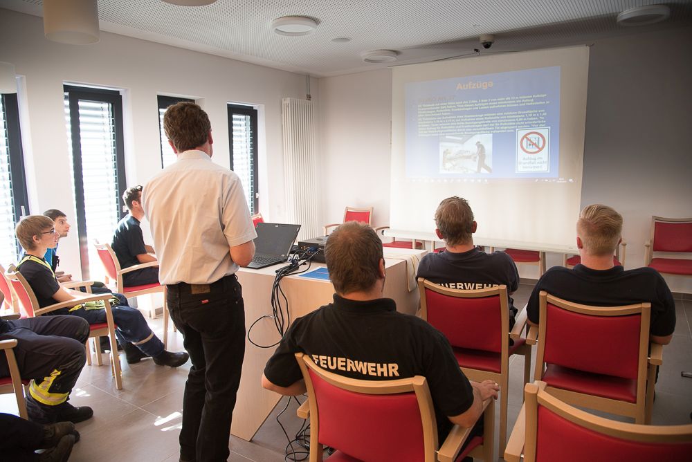 Das Modul 24.1 führten Philipp Wolshöfer und KBM Christian Lankes durch. Philipp Wolshöfer ging dabei auf die Besonderheiten von solchen Einrichtungen ein, auf die Objektplanung, auf die mögliche Anzahl der zu alarmierenden Feuerwehren und besonders auf die Ordnung des Raumes. Bei einem derartigen Objekt kommen nicht nur Einheiten der Feuerwehr, sondern auch Fahrzeuge des Rettungsdienstes, der Polizei und des THW. KBM Lankes ging dann im Speziellen auf den Atemschutzeinsatz und dessen Ablauf ein. Dabei auch auf die Herstellung eines Depots. Auch das Thema vertikale und horizontale Rettung war Thema in diesem Modul sowie die Begriffsdefinition von Evakuierung und Räumung. In diesem Zusammenhang wurde auch das Thema Rauchabzug thematisiert, welche baulichen Gegebenheiten es gibt oder auf was zu achten ist, wenn wir einen Rauchschutz installieren.