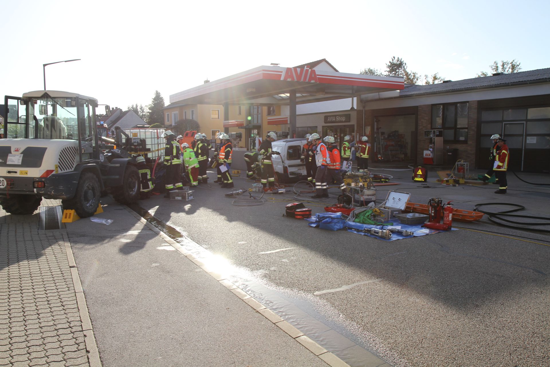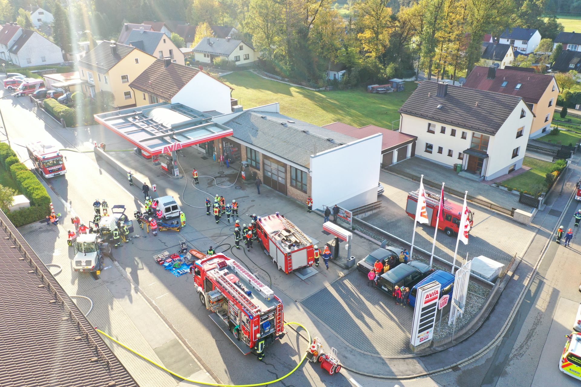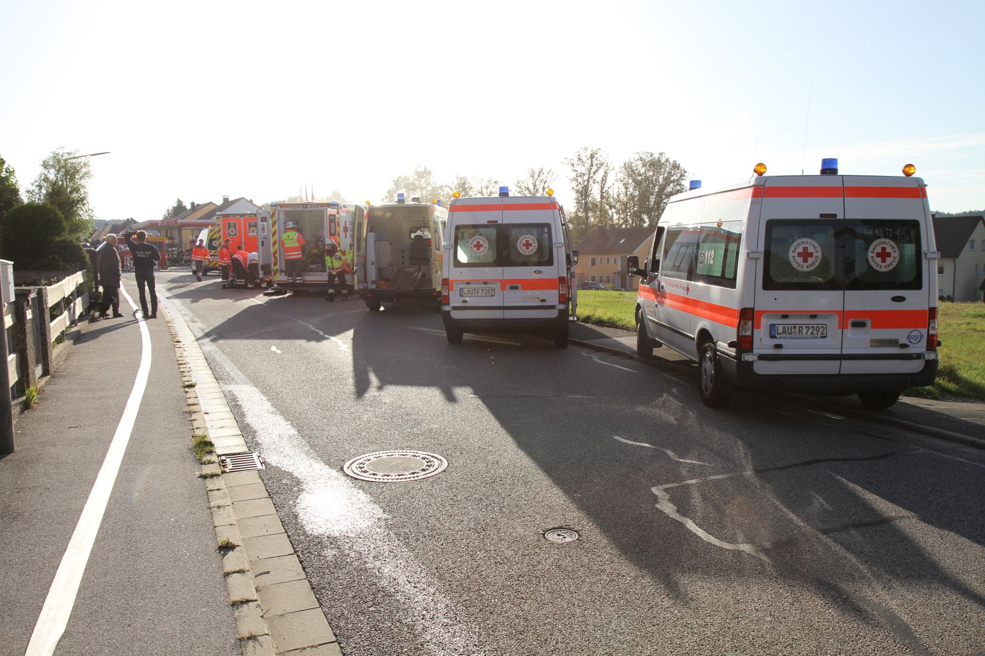 Aufgrund der Stärke der Verpuffung ist ein PKW – Fahrer, welcher sich mit seinem Fahrzeug auf Höhe der Tankstelle befunden hatte erschrocken und in einen Gabelstapler des gegenüberliegenden Chemiehandels gefahren. Ein entgegenkommendes Fahrzeug versuchte auszuweichen und ist hierdurch gegen die Begrenzungsmauer zw. Tankstelle und Burgthanner Straße geprallt.