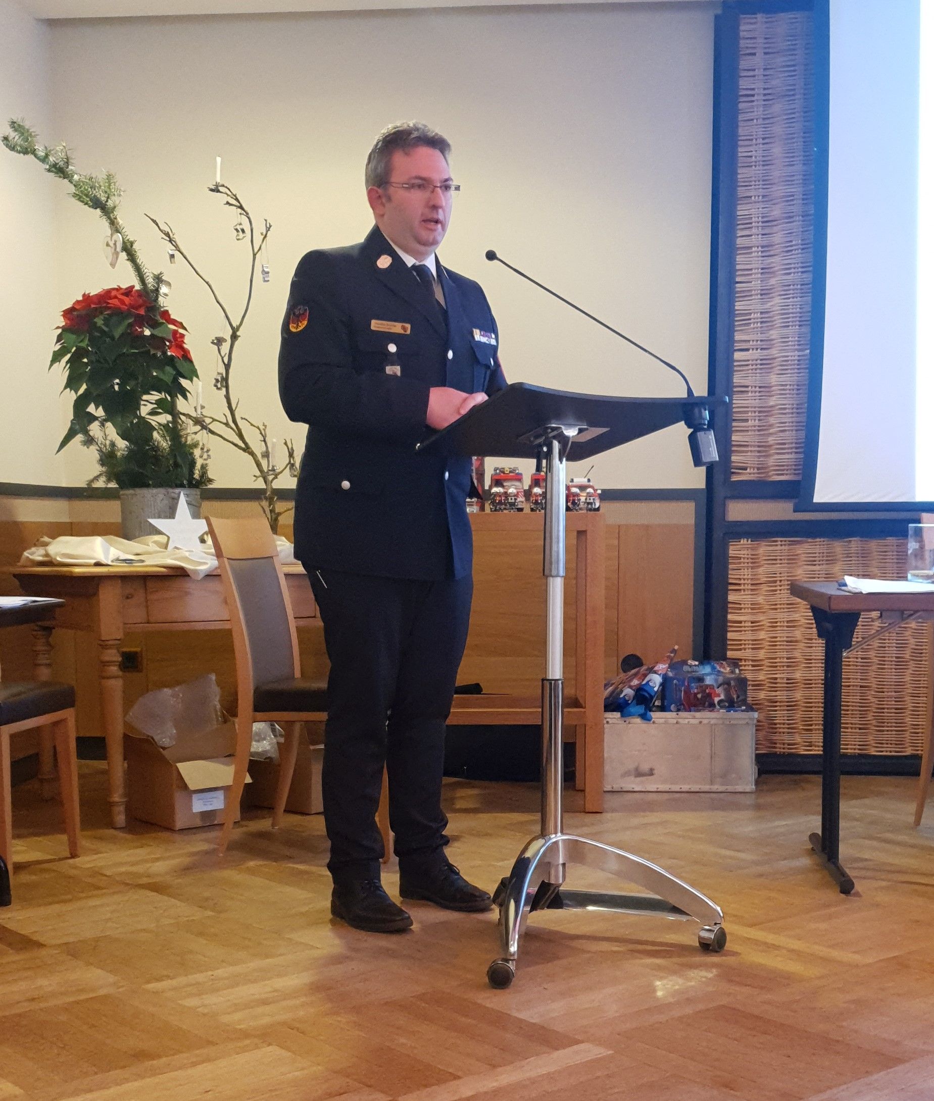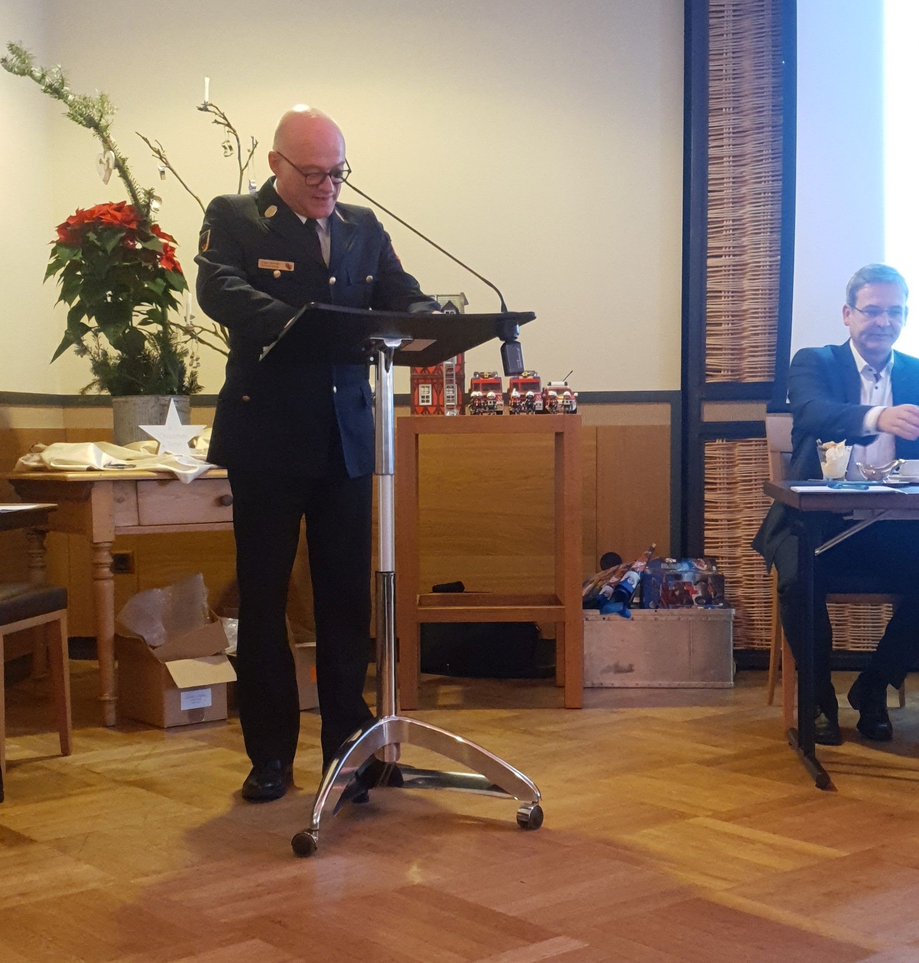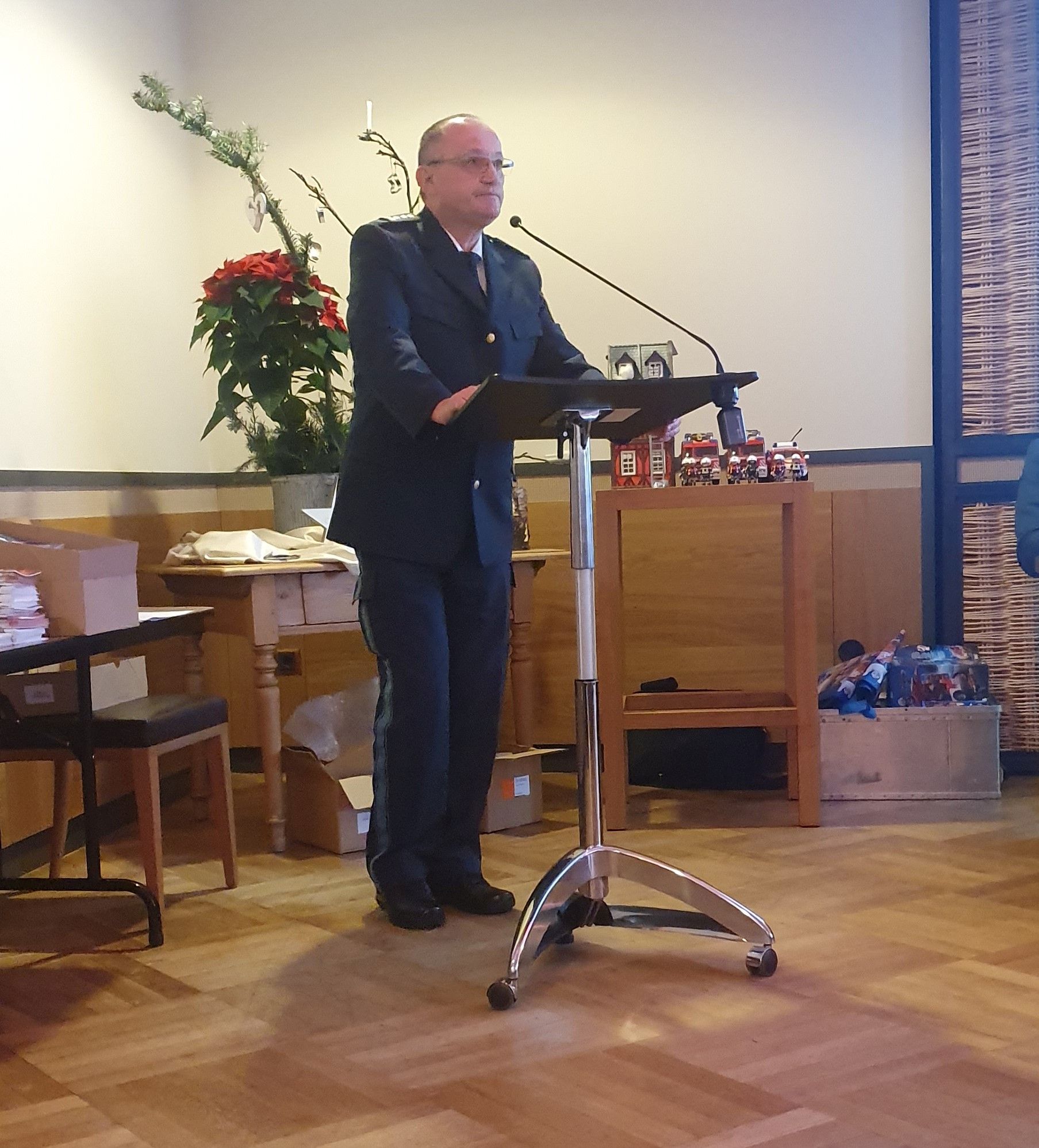 Als letzter Redner trat zum 35ten mal Kreisbrandrat Norbert Thiel vor. Er beschrieb personelle Veränderungen in der Kreisbrandinspektion zum 1.1.2020. Der Leiter der PSNV-E, Martin Winkler, wird neuer Kreisbrandmeister im Landkreis. Im Dienstbezirk 3 wird der bisherige Jugendbeauftragte KBM Christian Falk neuer Kreisbrandinspektor als Nachfolger für den bisherigen KBI Peter Schlerf, der nach langjährigem Dienst in den wohlverdienten Feuerwehrruhestand geht. Seine Tätigkeit als Jugendbeauftragter im DB3 begleitet zukünftig Florian Bayer von der FF Schwarzenbruck, der zum KBM ernannt wird. KBM Wolfgang Dümmler, der bisher den Aufgabenbereich Ausbildung im DB3 betreut hat, scheidet auf eigenen Wunsch aus. Seine Aufgabe übernimmt Phillipp Wolshöfer von der FF Ezelsdorf, der auch KBM wird. 13 neue Schwimmsauger werden von der Versicherungskammer Bayern zur Verfügung gestellt und dementsprechend verteilt. Das Erholungsheim in Bayerisch Gmain ist zurzeit ausgelastet, so bittet KBR Thiel um frühe Anmeldung. Er berichtete über die steigende Vielfältigkeit der Einsätze und dankte dementsprechend für das aufgebrachte Engagement und die gute Zusammenarbeit. Er sprach großes Lob aus und bedankte sich ebenfalls bei Hans Meixner für jahrelange reibungslose Arbeit zwischen Polizei und Feuerwehr. Zum Abschluss wünschte er ein schönes Weihnachtsfest und Gottes Segen.