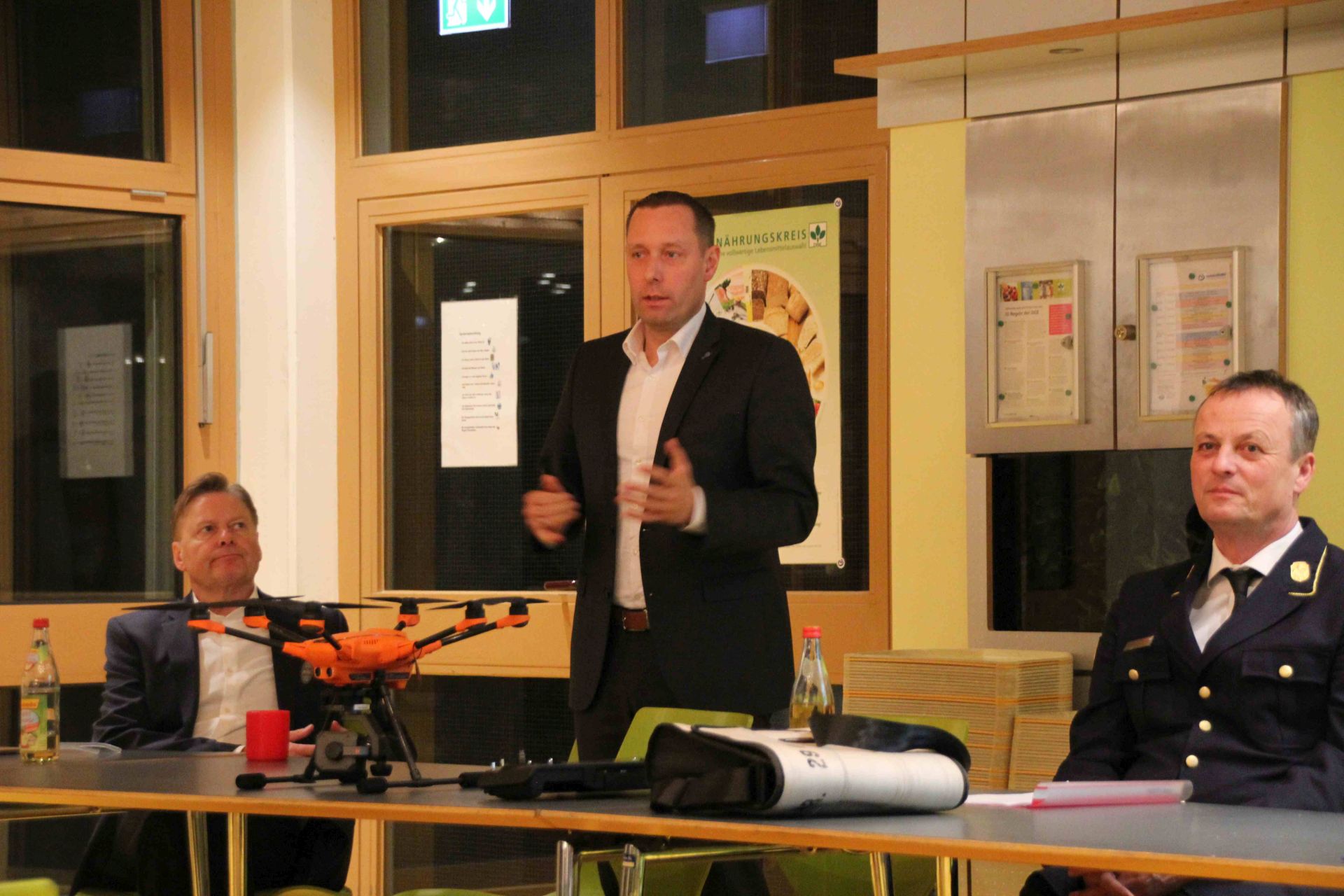 Weiterhin stellte er die neu angeschaffte Drohne für den Feuerwehreinsatz vor. Diese dient der Erkundung und Dokumentation an der Einsatzstelle, kann jedoch z.B. auch bei Vermisstensuchen zum Einsatz kommen. Für diese Aufgaben ist die Drohne unter anderem mit einer hoch auflösenden Wärmebildkamera ausgestattet. Stationiert wird sie nach der Durchführung der entsprechenden Schulungen bei der UG-ÖEL des Landkreises Nürnberger Land sein.