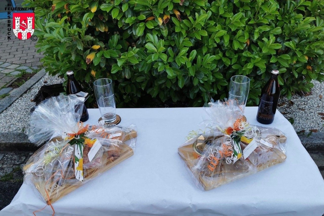 Beide Kameraden konnten nun endlich mit Geschenken und Ehrungen im Kreis der angetretenen Kameradinnen und Kameraden und unter Einhaltung der geltenden Abstands- und Hygieneregelungen würdig verabschiedet und geehrt werden.