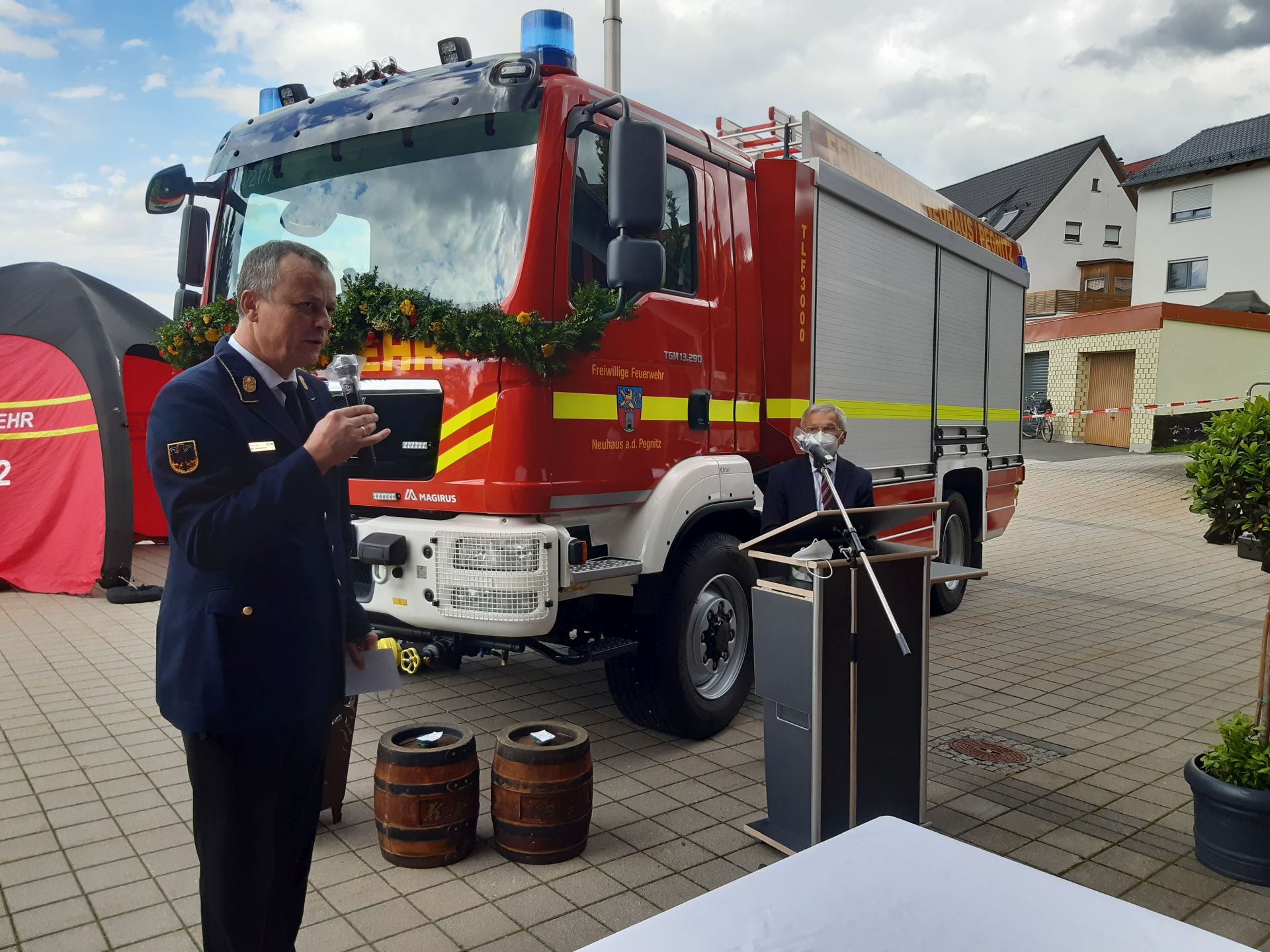 In einem kurzen Grußwort ging der Bürgermeister auf die Kosten des Fahrzeuges, die Zuschüsse vom Landkreis und vom Staat und auf die Wichtigkeit der stetigen Erneuerung der Gerätschaften bei der Feuerwehr ein. Er dankte Landrat Kroder und KBR Thiel für den Zuschuss des Landkreises für dieses Fahrzeug.
