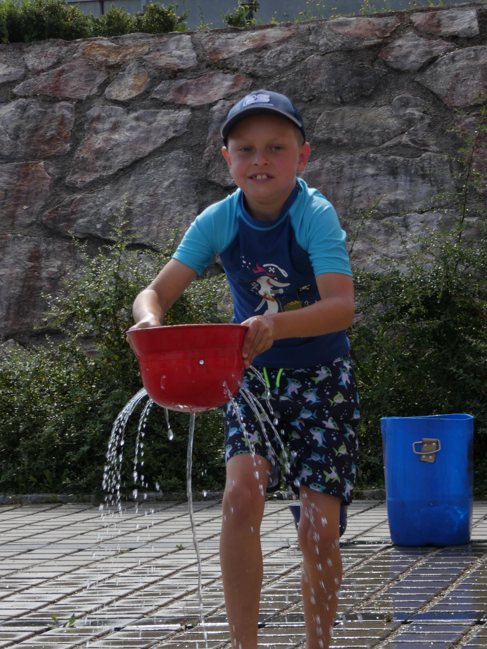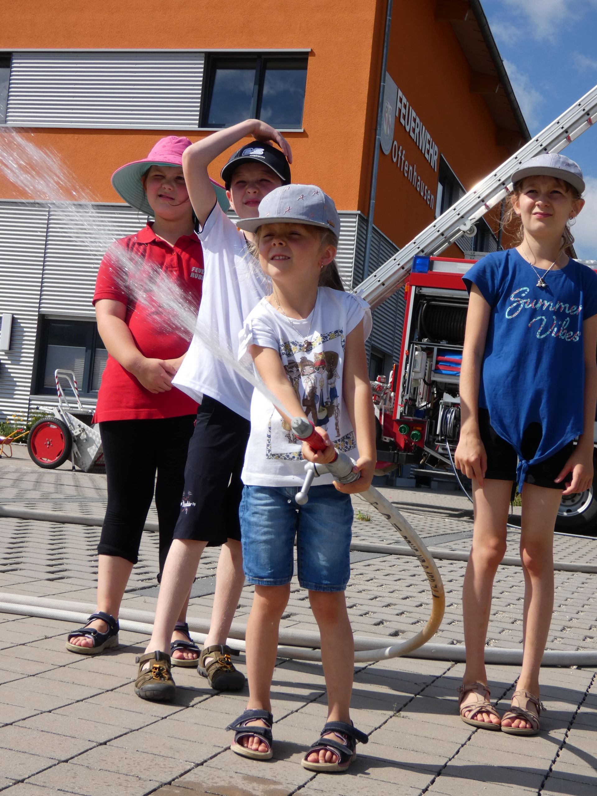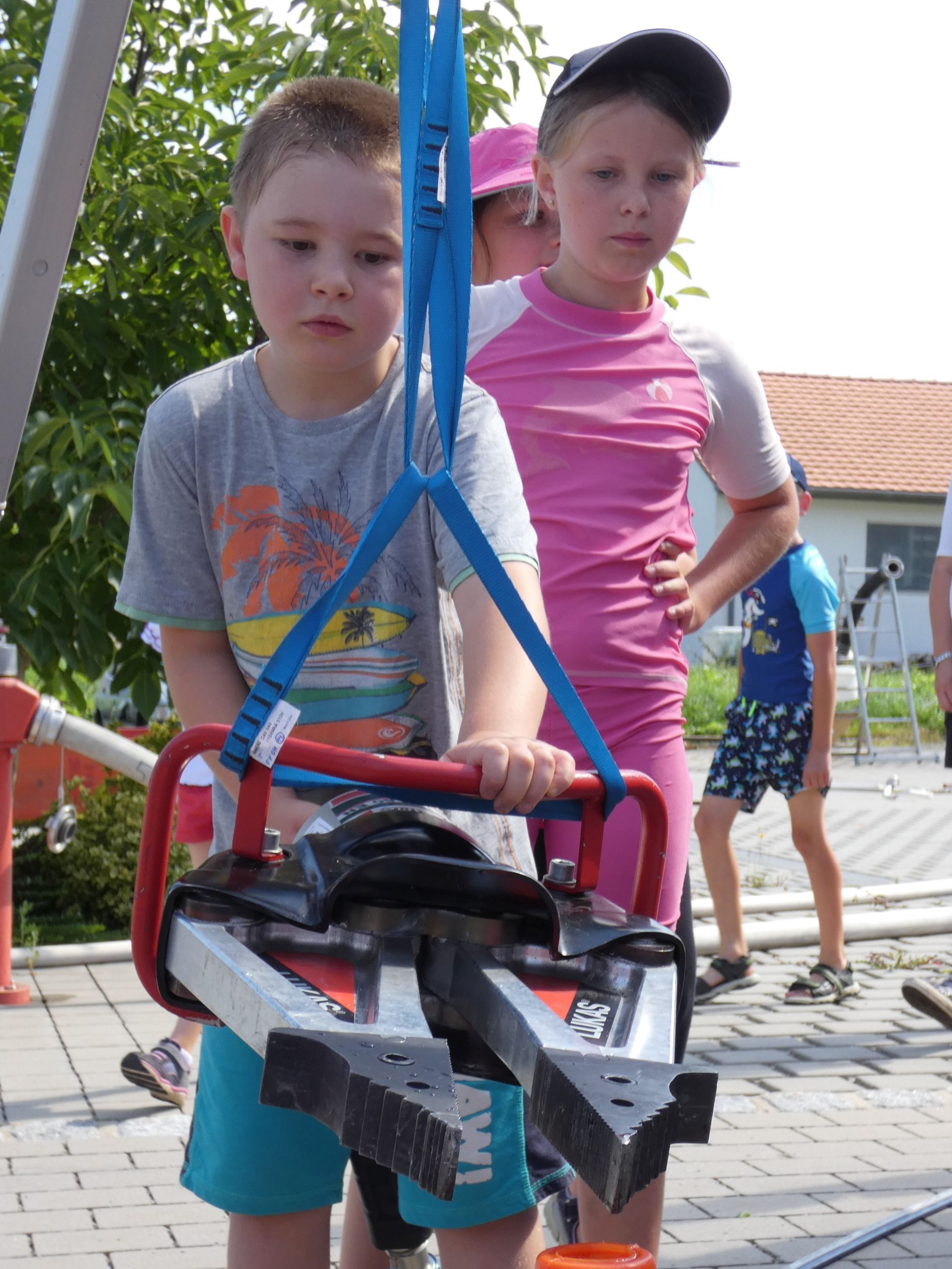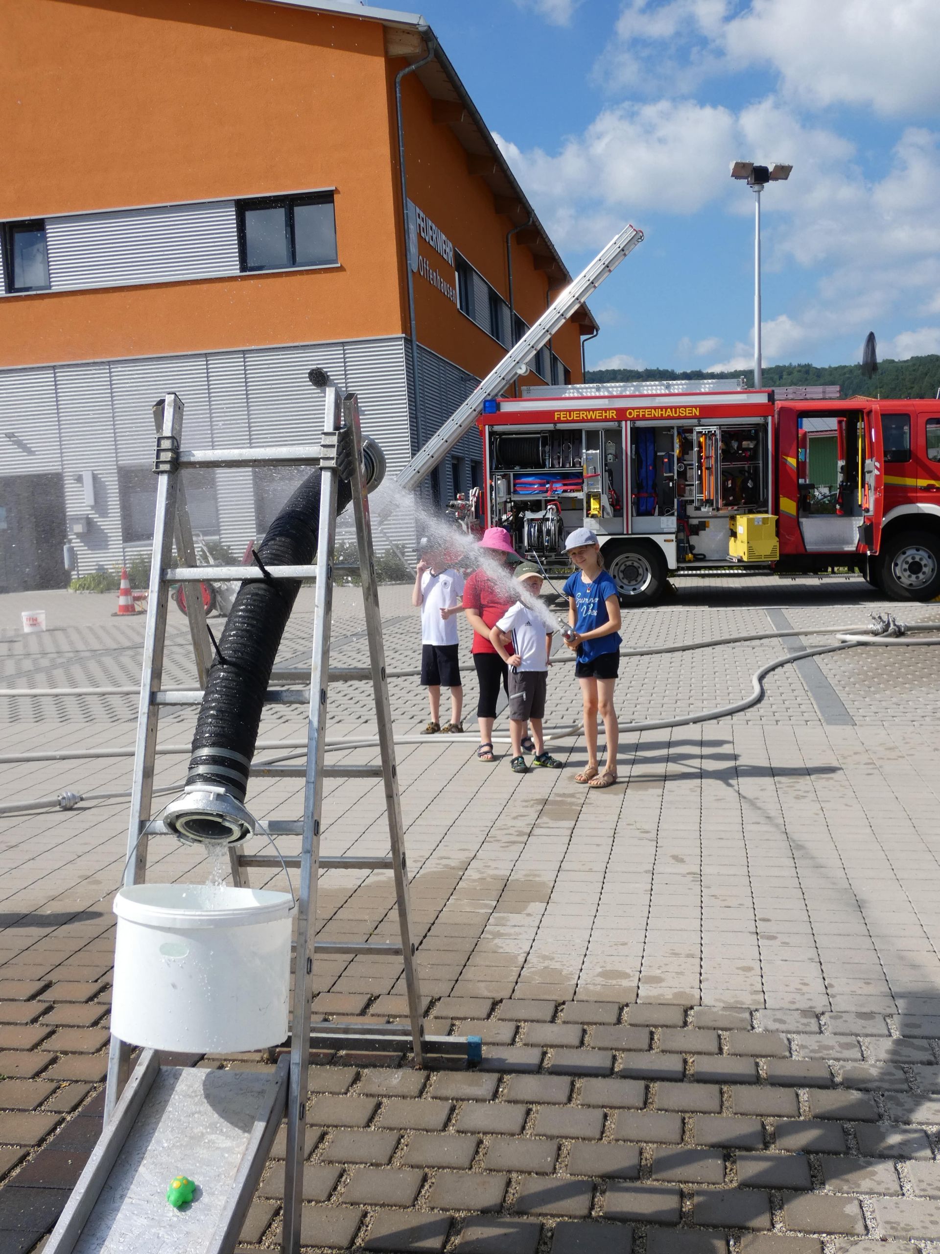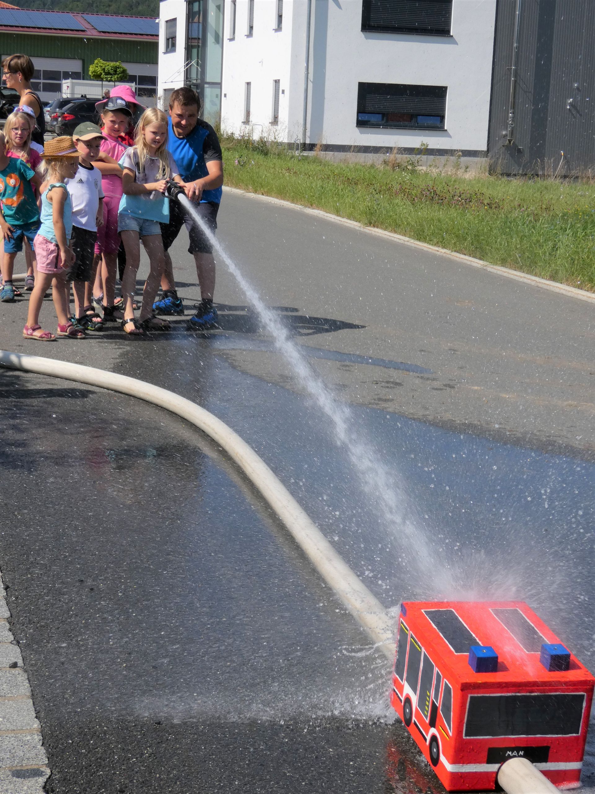 Die Augen der Kinder funkelten, als sie erfuhren, dass auch sie die Gerätschaften der Feuerwehr spielerisch benutzen durften. Durch die Betreuer wurden zehn Stationen aufgebaut, bei denen z.B. mit einem Strahlrohr Absperrhütchen von einem Tisch gespritzt oder mit dem Spreitzer, der normalerweise bei schweren Verkehrsunfällen eingesetzt wird, Wasserbomben von einem Absperrhütchen zum anderen transportiert werden mussten. Das Highlight war ein eigens angefertigtes Feuerwehrauto, das auf einem gefüllten Feuerwehrschlauch fuhr, wenn man es mit einen Hohlstrahlrohr und viel Wasser bespritzte.