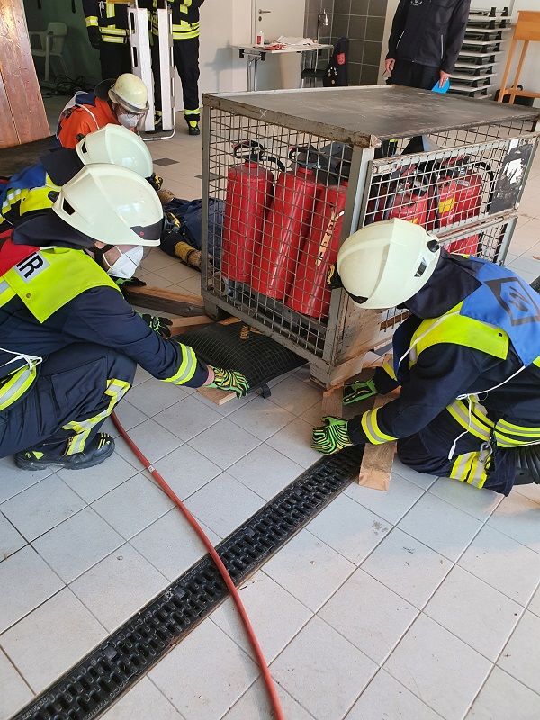 Die praktische Prüfung gliederte sich in zwei Bereiche. Zunächst wurde ein Szenario an einem Planspiel dargestellt, das es von den Teilnehmern aus Sicht des Truppführers zu lösen galt. Hierbei ging es um die Schwerpunkte “Gefahren erkennen", "Kommunikation an der Einsatzstelle" und "die Aufgaben des Truppführers“. Als finale Aufgabe musste noch eine Einsatzübung absolviert werden, bei der jeder Prüfungsteilnehmer die Rolle des Truppführers einnehmen musste. Es wurde eine Alarmierung zu einer eingeklemmten Person auf einem Firmengelände angenommen. Die Person wurde mittels Hebekissen befreit und anschließend musste Erste Hilfe geleistet werden. Im Verlauf der Übung wurden verschiedene Lageänderungen von den Prüfern eingespielt, auf diese mussten die angehenden Truppführer entsprechend reagieren.