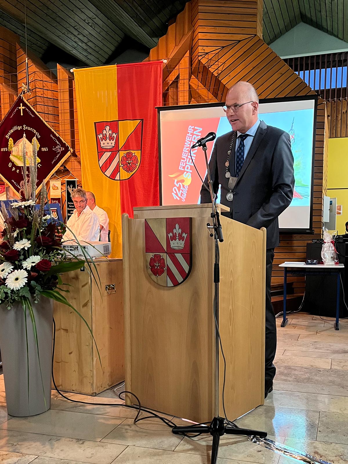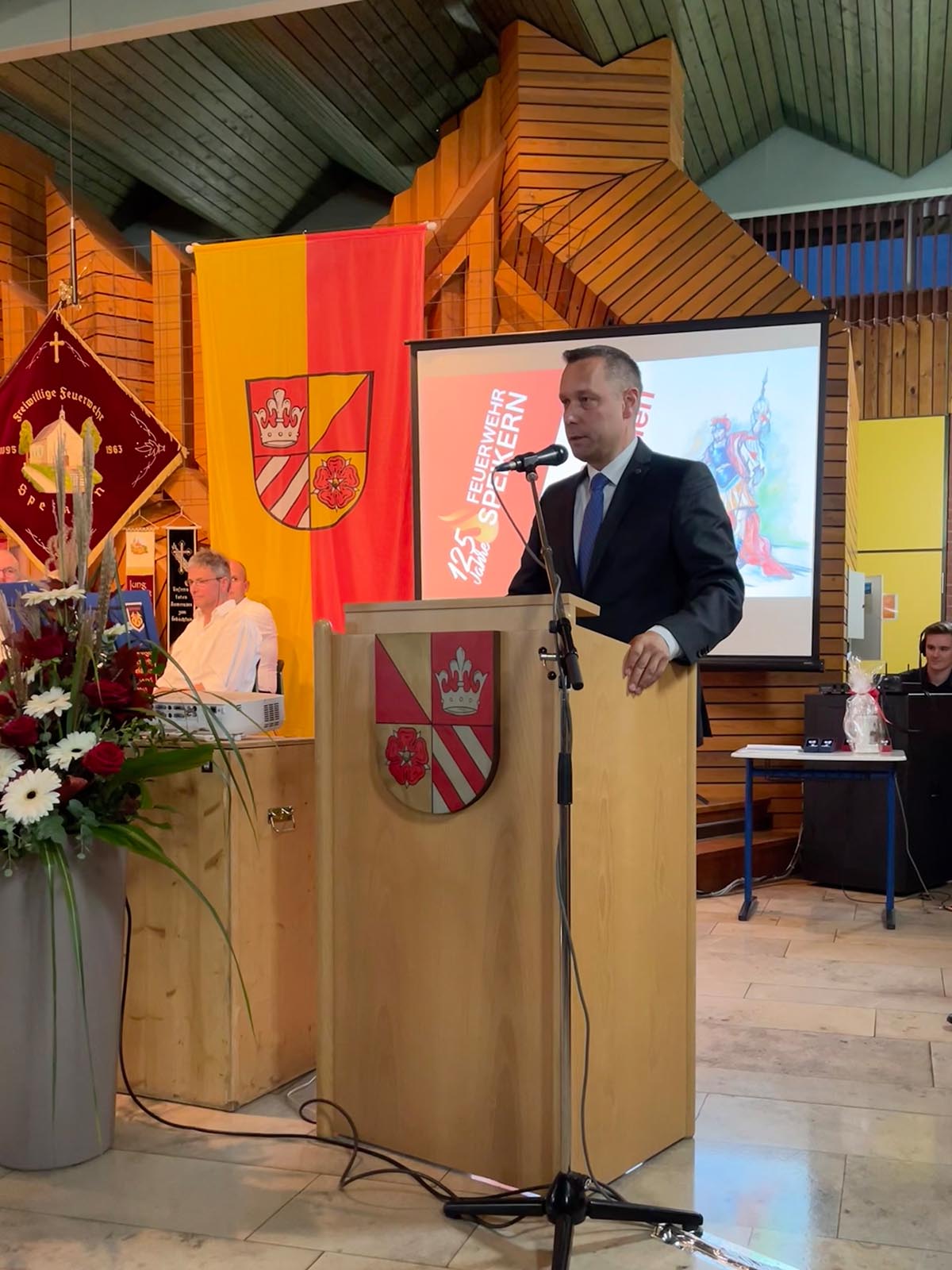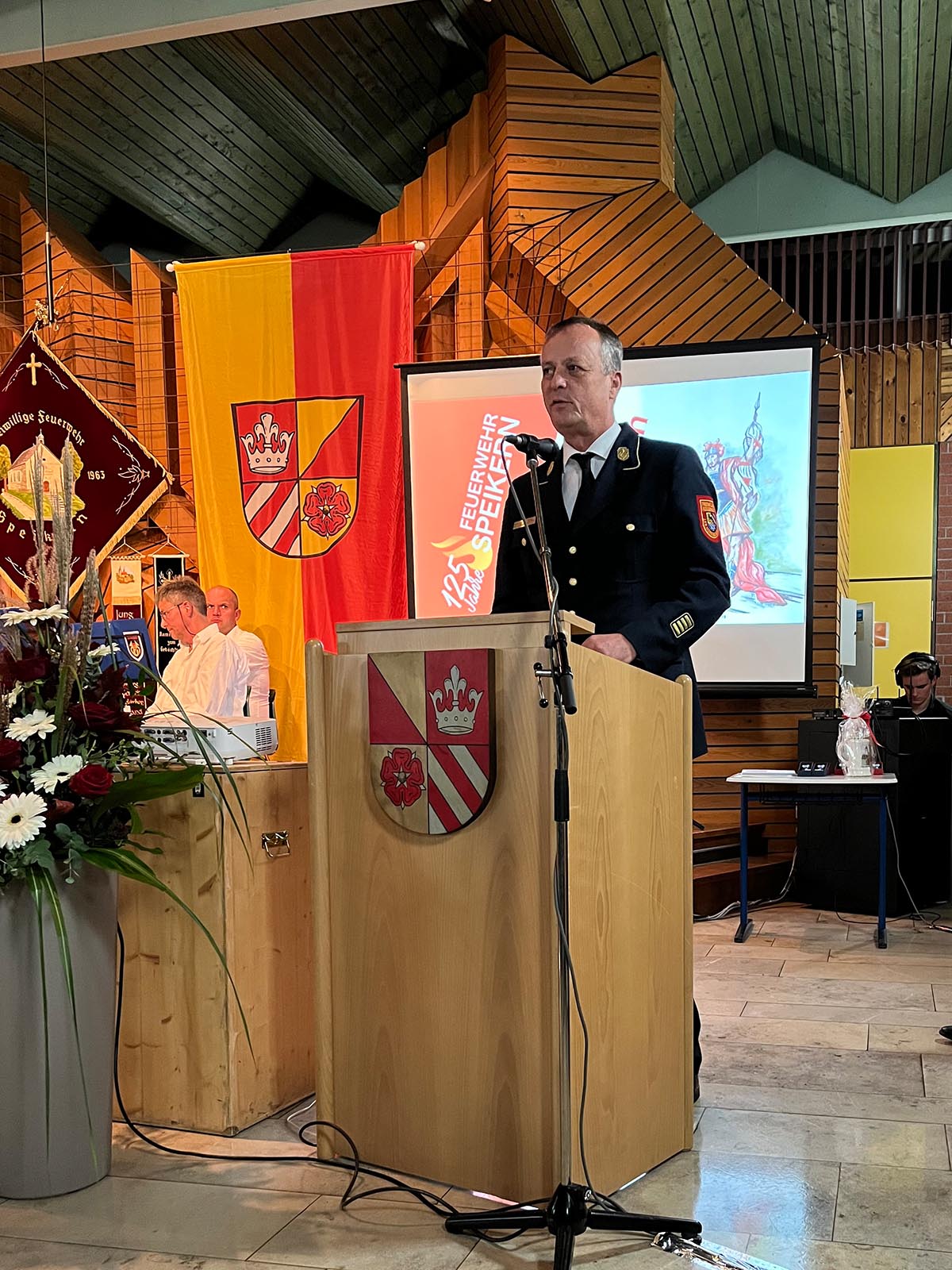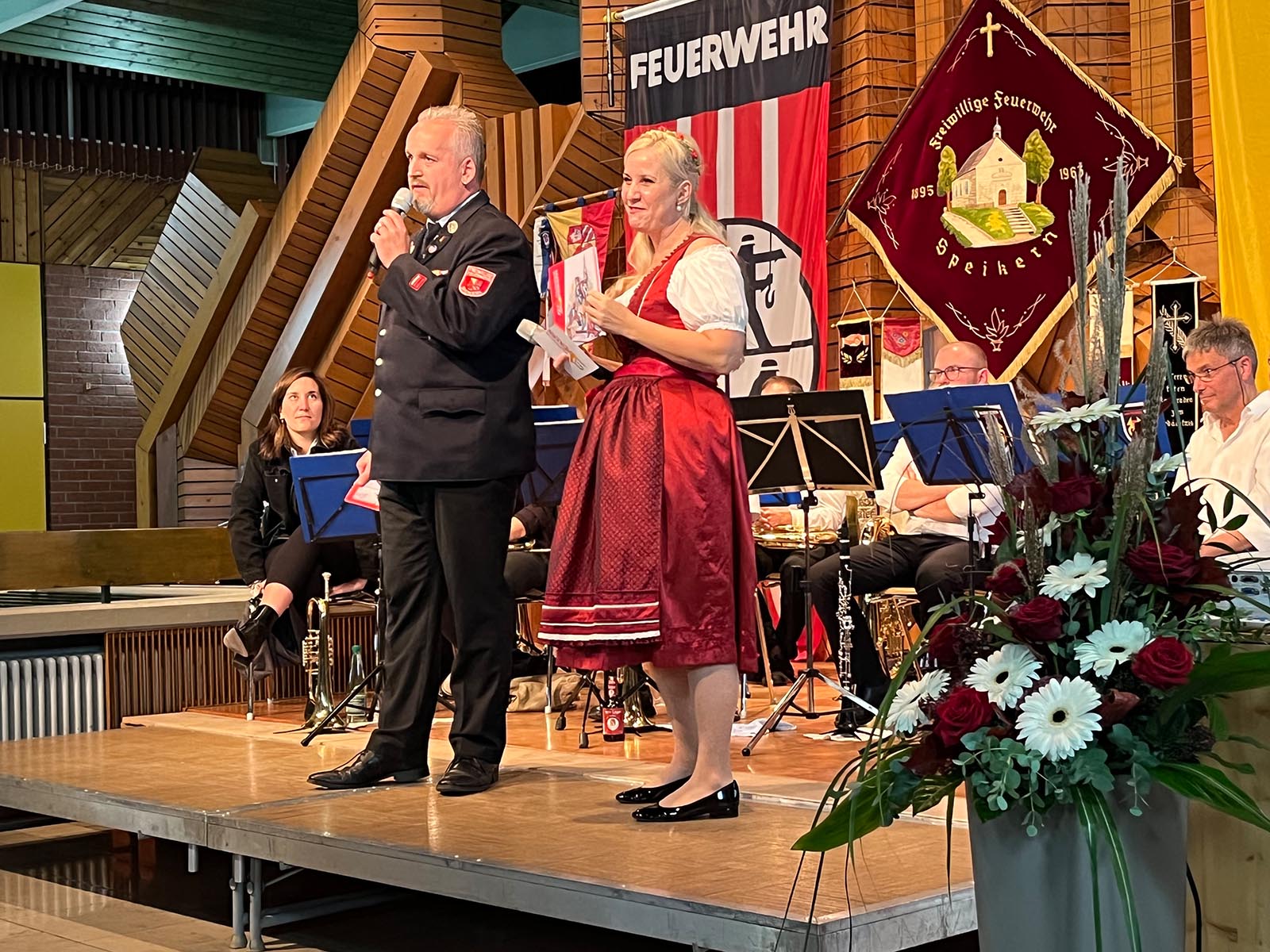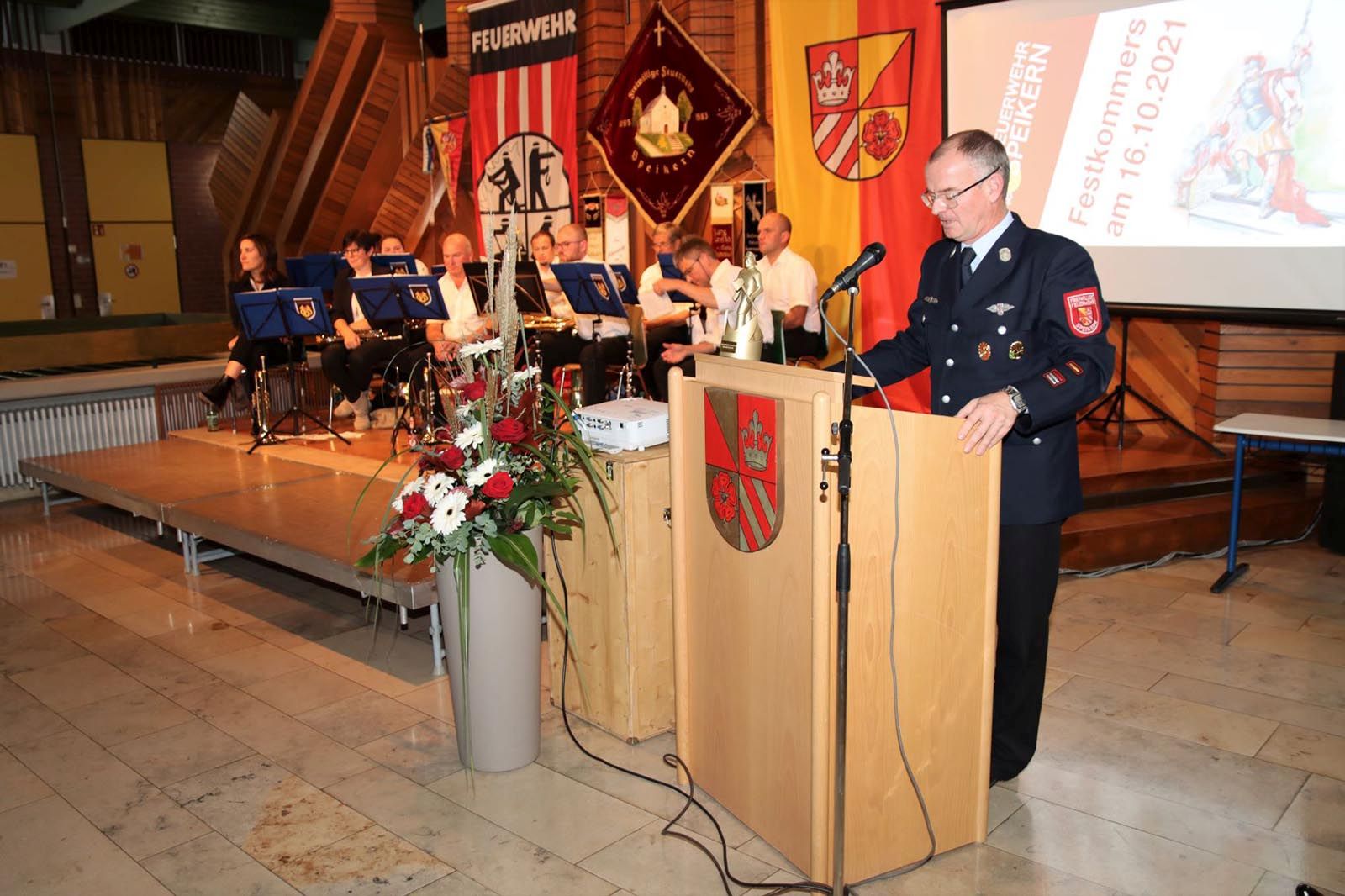 Speikern (DB2) - Am Samstagabend, den 16.10.2021 fand in der Aula der Grundschule in Neunkirchen der Festkommers der Feuerwehr Speikern statt. So konnte mit eineinhalbjähriger Verspätung zumindest im Kreise der Mitglieder und geladenen Gäste der runde Geburtstag doch noch gebührend gefeiert werden. Moderiert wurde der Abend von Pamela Knapp und Björn Teuschel.