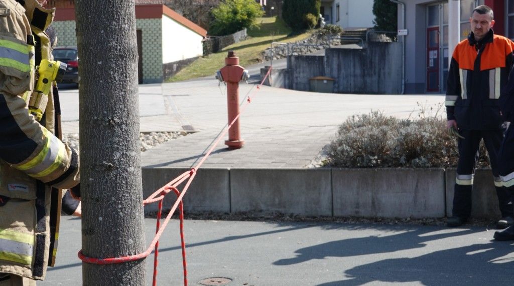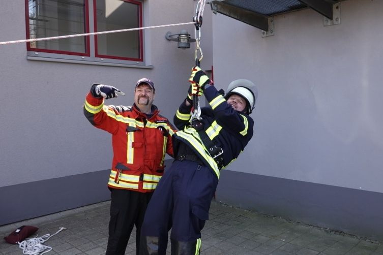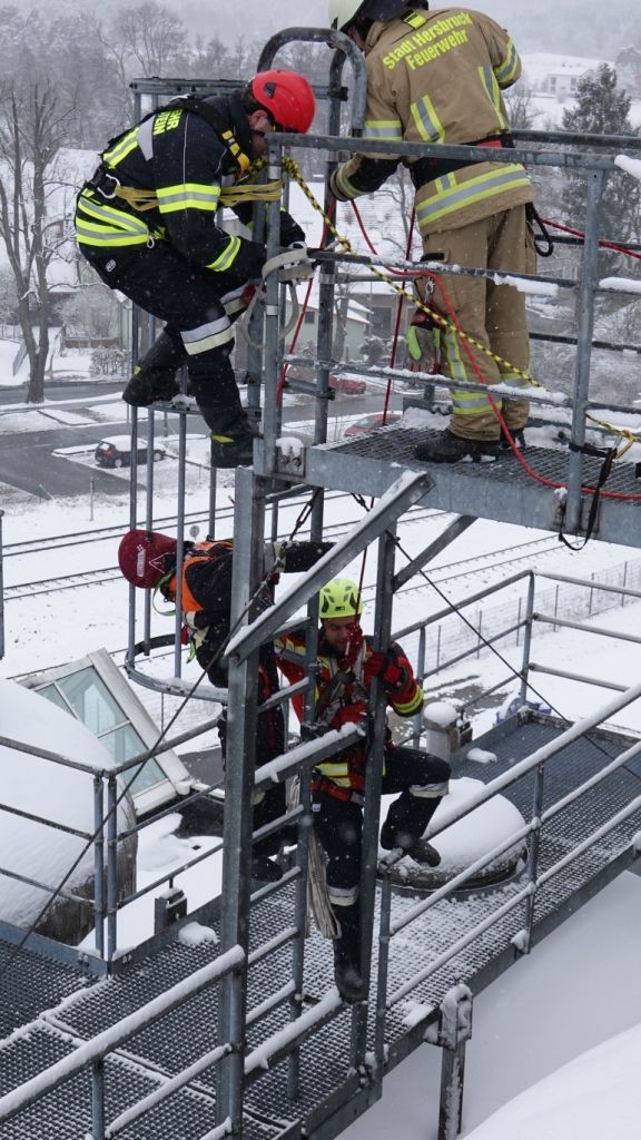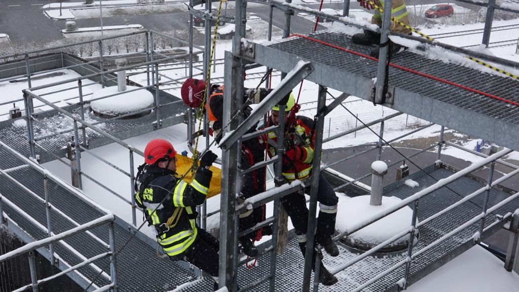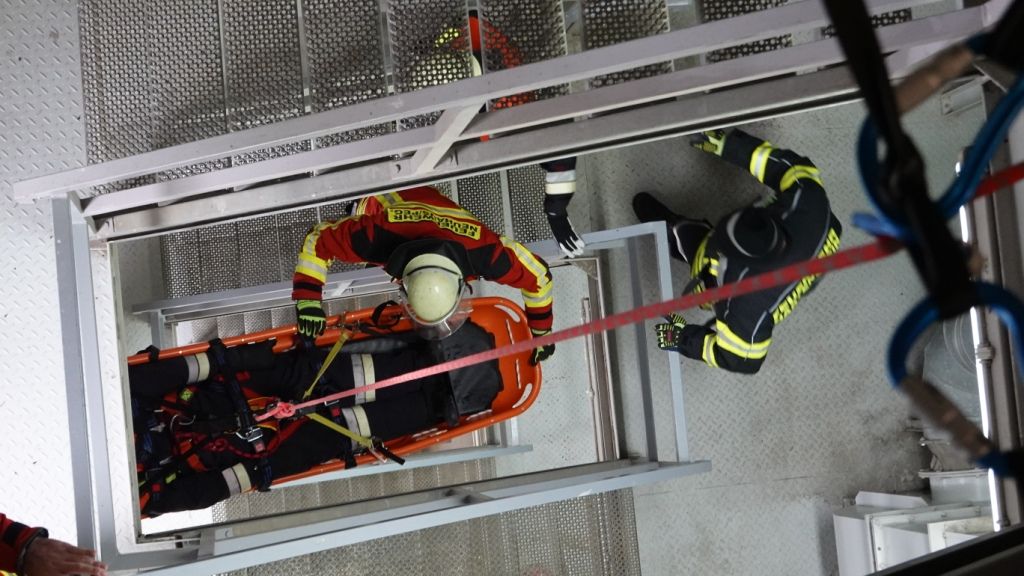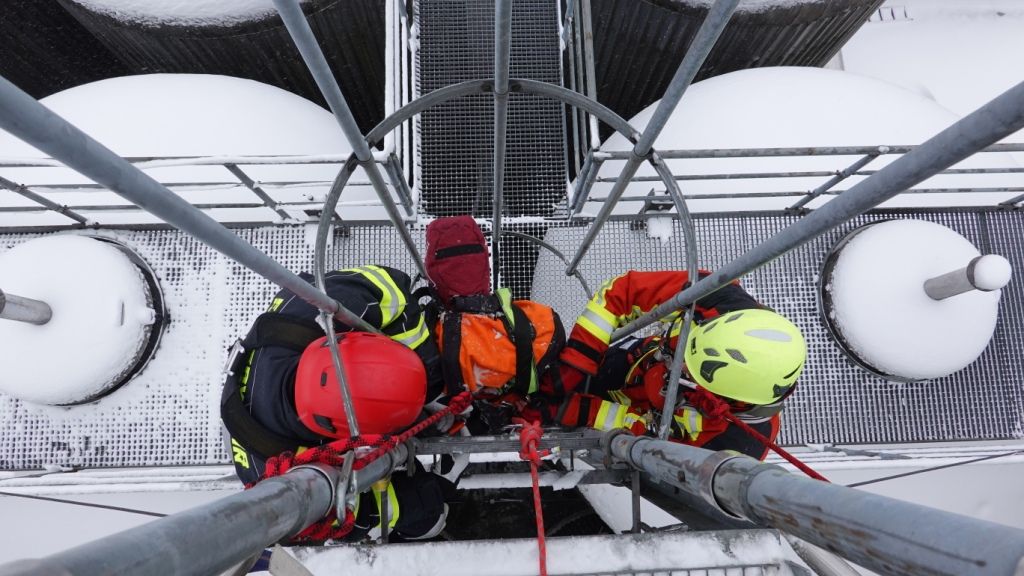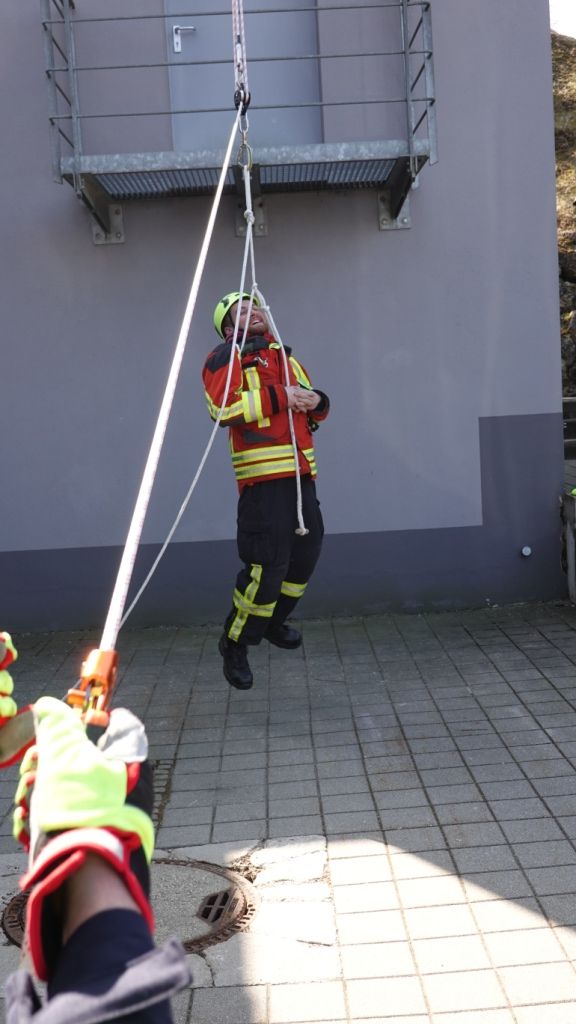 Nach Einteilung der Teams und Aufgabenbereiche durch den Gruppenführer wurde die „Rettungspuppe“ mittels Rettungswindel nach oben verbracht. Die Teilnehmer zeigten sich bei diesem Prüfungsabschnitt besonders erfinderisch. Mit den zur Verfügung stehenden Mitteln aus den Absturzsicherunssätzen bauten diese nämlich einen provisorischen „Flaschenzug“ auf, um so die Rettungspuppe mit wenig Kraftaufwand nach oben zu bringen. Dies gab von den Prüfern zusätzliche Pluspunkte für alle Teilnehmer!
