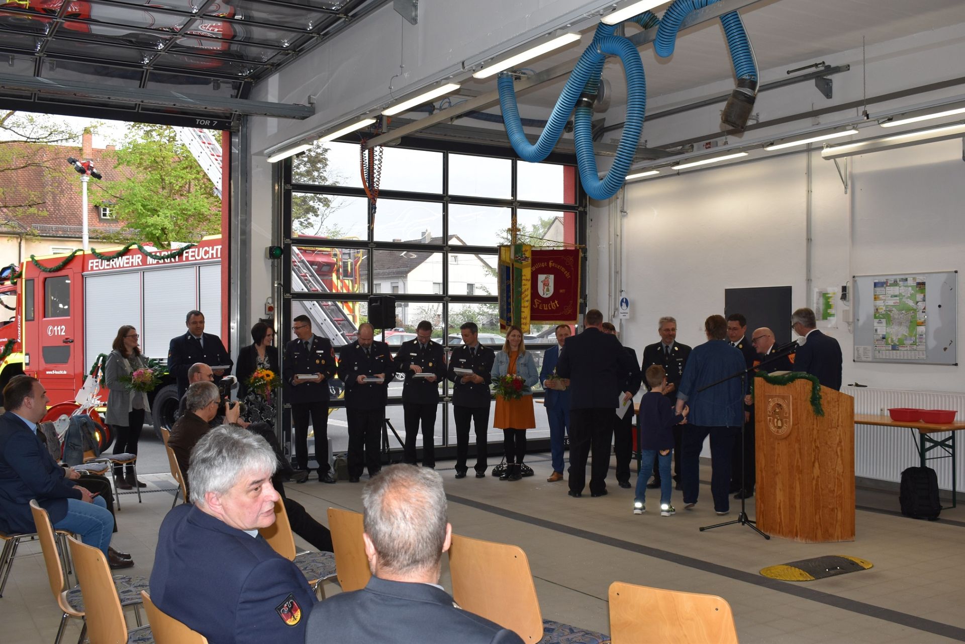 Erster Bürgermeister Jörg Kotzur, stellvertretender Landrat Helmut Brückner, Kreisbrandrat Holger Herrmann sowie der evangelische Pfarrer Roland Thie begrüßten in ihren Ansprachen die anwesenden Feuerwehrleute aus Feucht und Moosbach sowie die Vertreter des Marktgemeinderates, der Gemeindeverwaltung sowie der Kreisbrandinspektion.