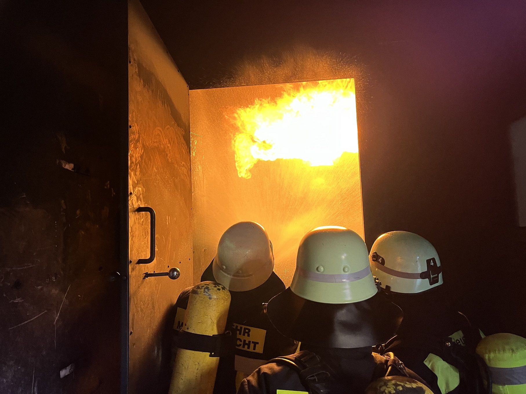 Eines der Highlights war der Besuch des Brandübungscontainers der Berufsfeuerwehr Nürnberg. Hier lernten die Teilnehmer den richtigen Umgang mit echtem Feuer und Hitze und bekamen ein Gefühl für das Wirken der eigenen Schutzkleidung, die es ermöglicht, auch in brennenden Räumen bis zu 1.000 °C zu löschen. Auch eine Rauchgasdurchzündung wurde gezeigt und bekämpft.