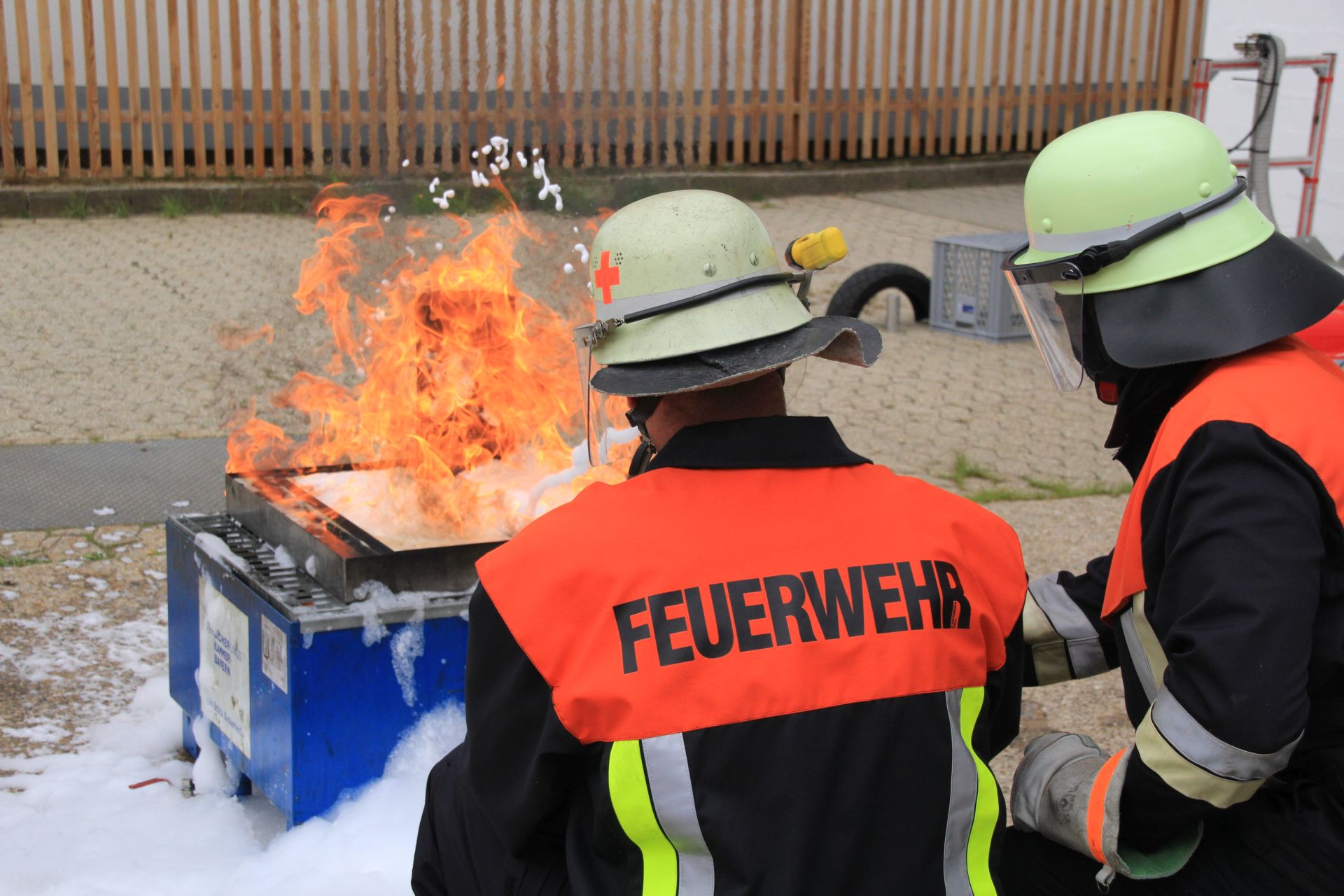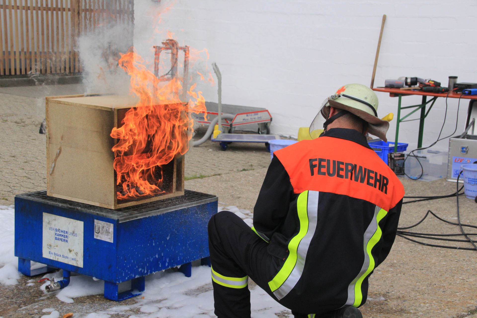 Abschließend wurde dann noch ein Zimmerbrand simuliert und der Einsatz von Netzmittel für eines verbesserte Löschwirkung demonstriert.