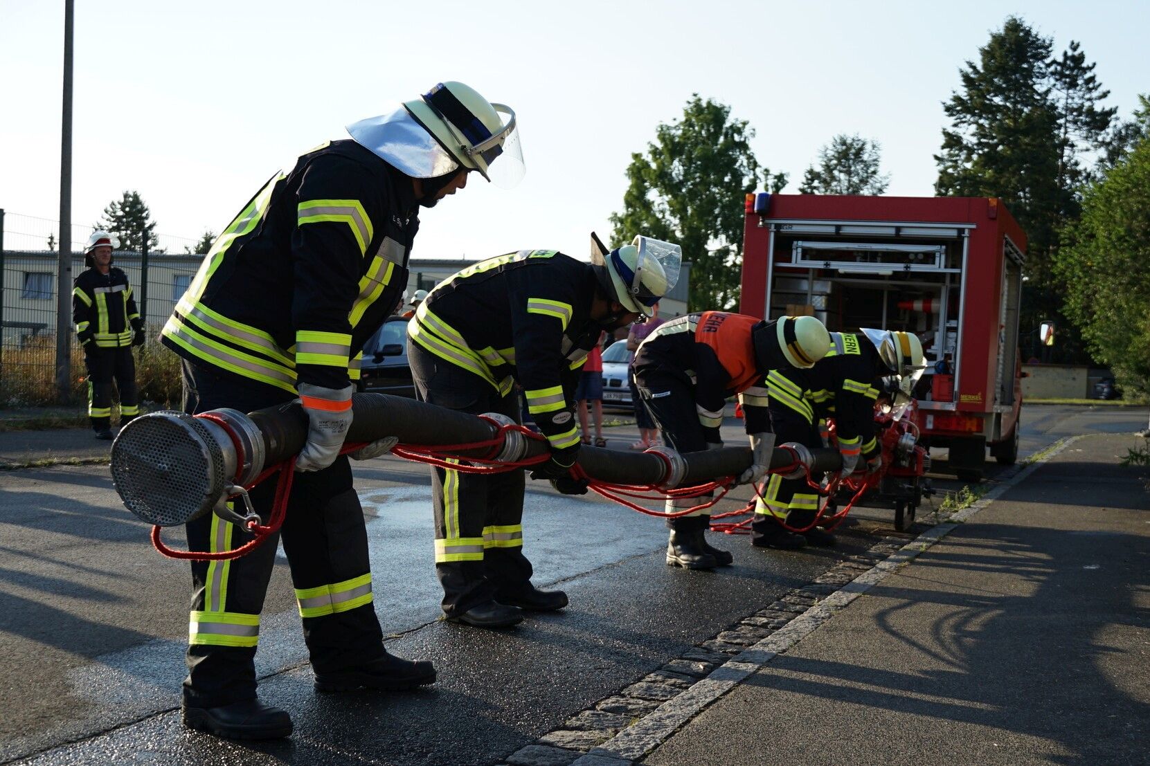 Die Prüfung bestand neben dem Löschangriff aus einem theoretischen Teil, der mittels Smartphone-App abgelegt wurde. Das war für alle Teilnehmer ein Novum, funktionierte aber tadellos. Die praktische Prüfung konnte dann fast fehlerlos und mit einer beeindruckenden Gesamtleistung abgeschlossen werden. Viel Lob gab es daher auch von den anwesenden Bürgermeistern aus Schnaittach und Neunkirchen, Frank Pitterlein und Jens Fankhänel.