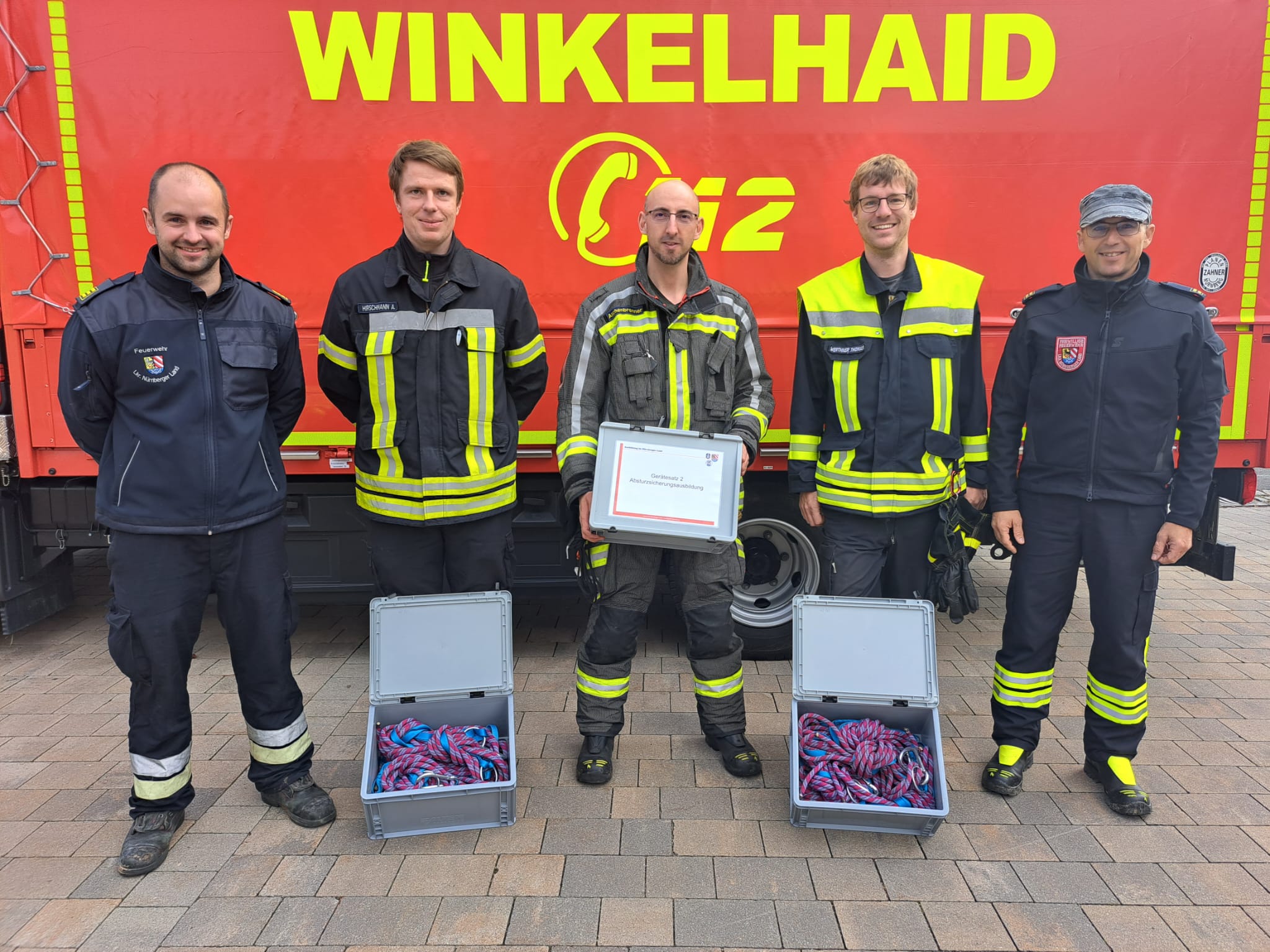 Abschließend wurde durch KBI Philipp Wolshöfer und KBM Thomas Loos jedem Dienstbezirk eine Ausbildungsbox zur Verfügung gestellt. In diesen Boxen befinden sich 10 Ausbildungspacks mit je 1 x Karabiner, 1 x O - Ring, 1x Bandschlinge und einem 1x Dynamikseil. Diese werden den Teilnehmern für den Lehrgang Absturzsicherung am ersten Ausbildungstag ausgehändigt.