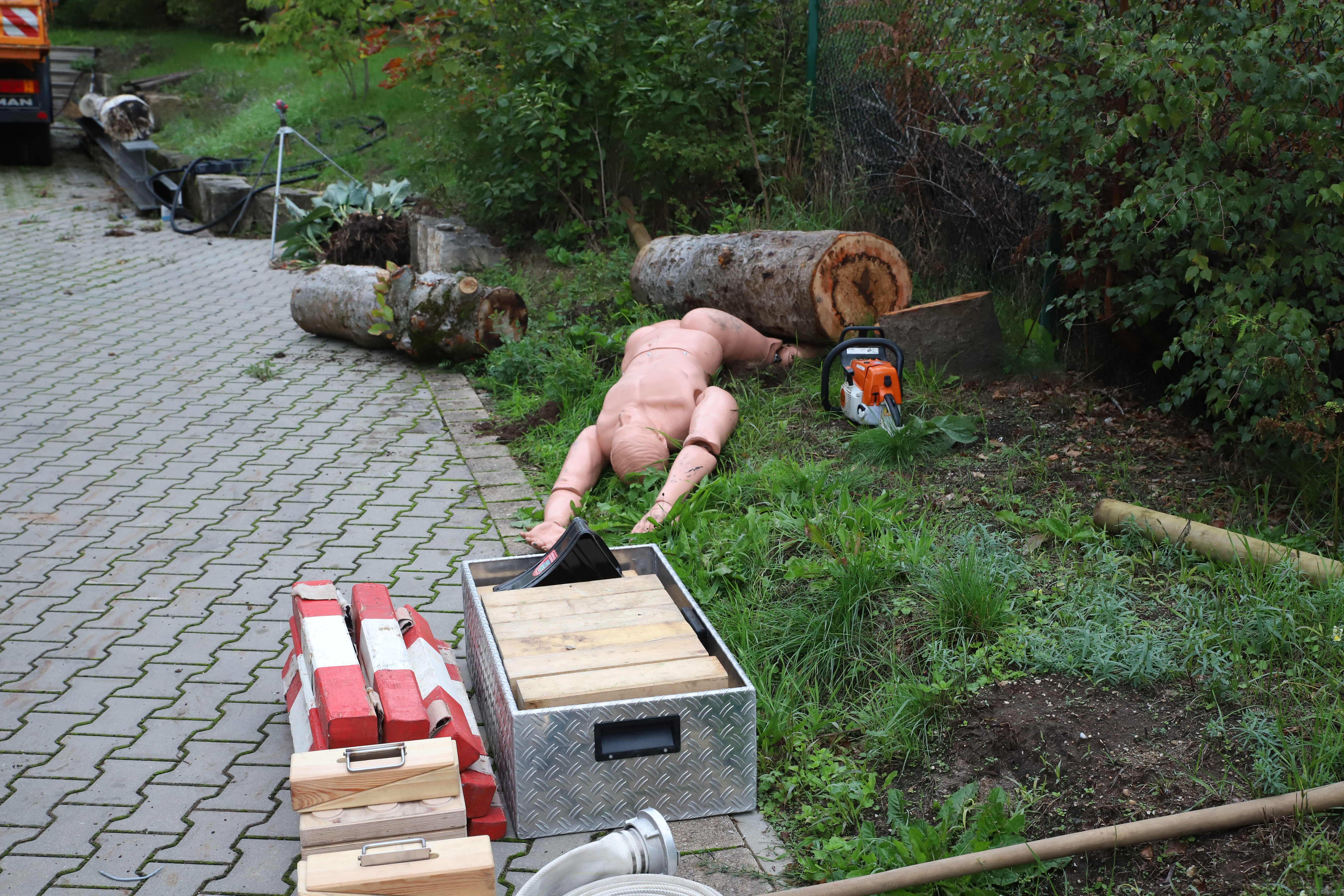 An der 2. Station beschäftigten sich die Teilnehmer dann mit dem Thema Forstunfall. Hier wurden den Teilnehmern am Beispiel einer unter einem Baumstamm eingeklemmten Person die Einsatzoptionen erläutert, die den Wehren bereits mit der Beladung ab einem TSF zur Verfügung stehen.