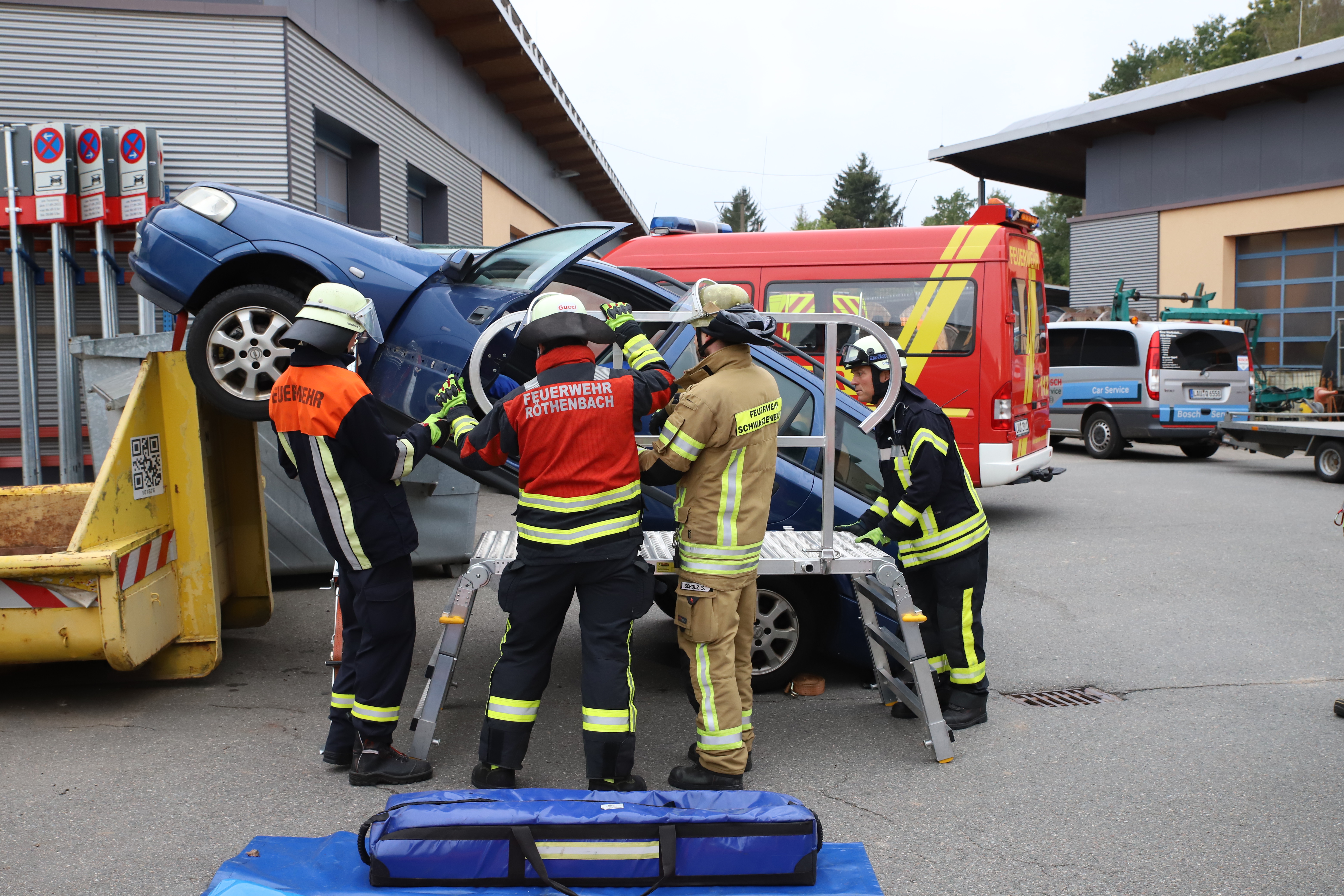 Das an Station 1 begonnene Thema „Rettung aus PKW“ wurde dann an Station 5 erneut aufgenommen. Hier ging es nun vor allem um das sichere Abstützen und Stabilisieren eines Fahrzeuges sowie das Arbeiten mit einer Rettungsplattform. Um den Teilnehmern ein anschauliches Szenario zu bieten, wurde hier ein PKW, der auf einen Container aufgefahren war, angenommen.