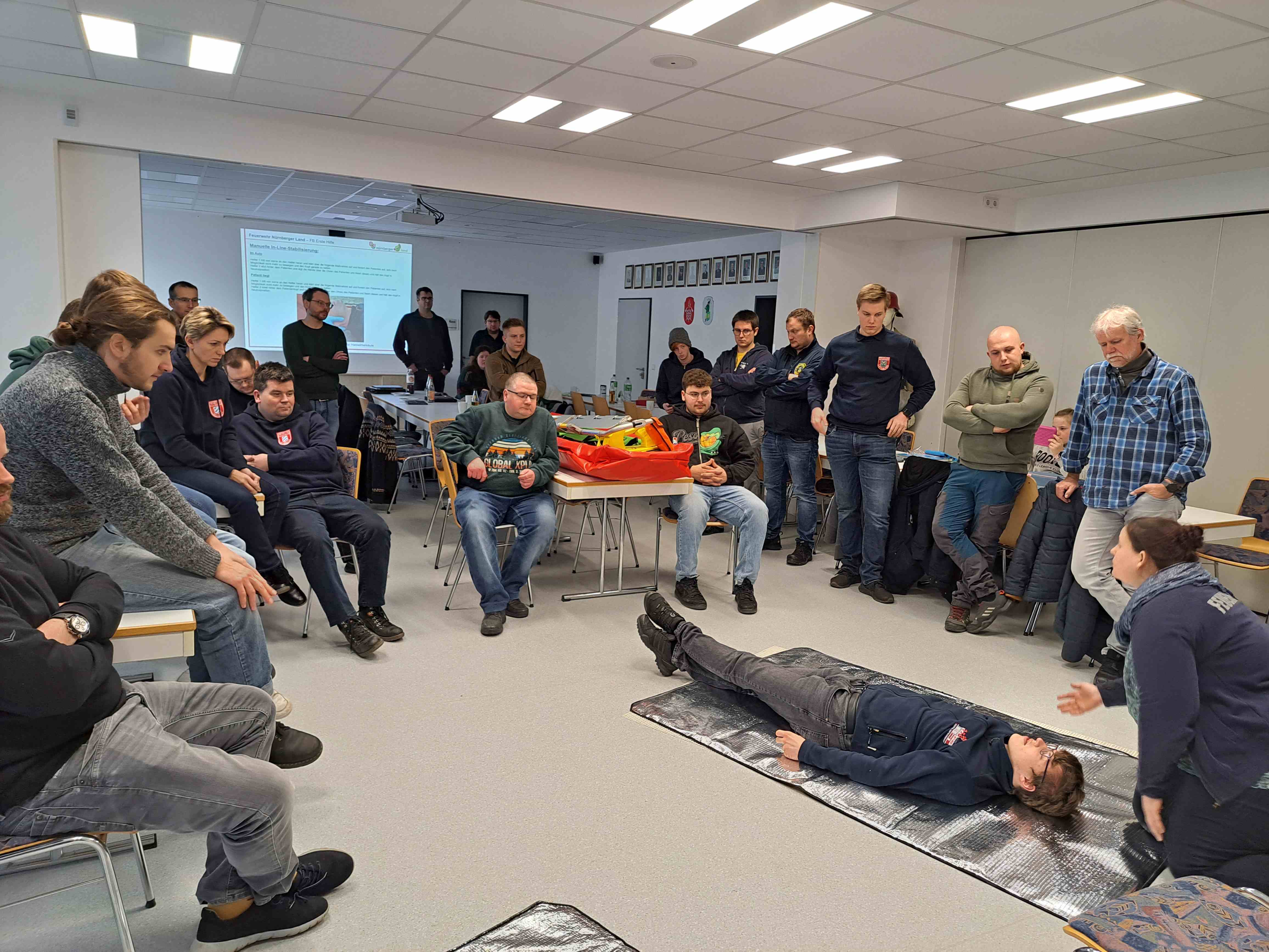 Im Fokus stehen zum einen zentrale Themen aus dem Bereich der Ersten Hilfe bei Feuerwehreinsätzen. Dabei geht es neben dem Umgang mit bewusstlosen Personen und der Herz-Lungen-Wiederbelebung auch um das Stillen von Blutungen. Aber auch thermische Notfälle sowie der korrekte Transport von Patienten – beispielsweise in unwegsamem Gelände – stellen wichtige Bestandteile der Ausbildung dar. Im Rahmen der Ausbildung wird dabei besonders auf eine sehr praxisbetonte Durchführung wertgelegt, um so durch aktives Üben einen maximalen Lerneffekt für alle Teilnehmer zu erzielen und ihnen mögliche Berührungsängste zu nehmen.