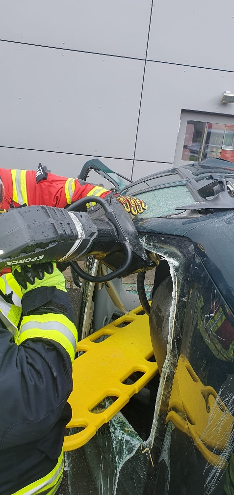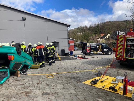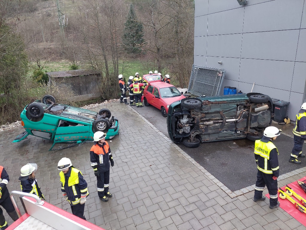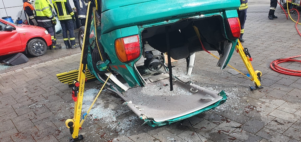 Nach einem kleinen gemeinsamen Mittagessen folgte im Anschluss der praktische Ausbildungsteil, hierfür wurden drei Fahrzeuge im Hof vorbereitet. Es wurden verschiedene Lagegegebenheiten angenommen und diese an einem PKW in Seitenlage, Dachlage und normaler Lage abgearbeitet. Durch die beiden Ausbilder konnten an jeder der drei Stationen neue Techniken sowie interessante Tipps ausprobiert und umgesetzt werden. Abschließend gab es eine kleine Feedbackrunde aller Teilnehmer, bei der festgestellt werden konnte, dass viele neuen Erkenntnisse gewonnen und bereits vorhandenes Wissen aufgefrischt werden konnte.