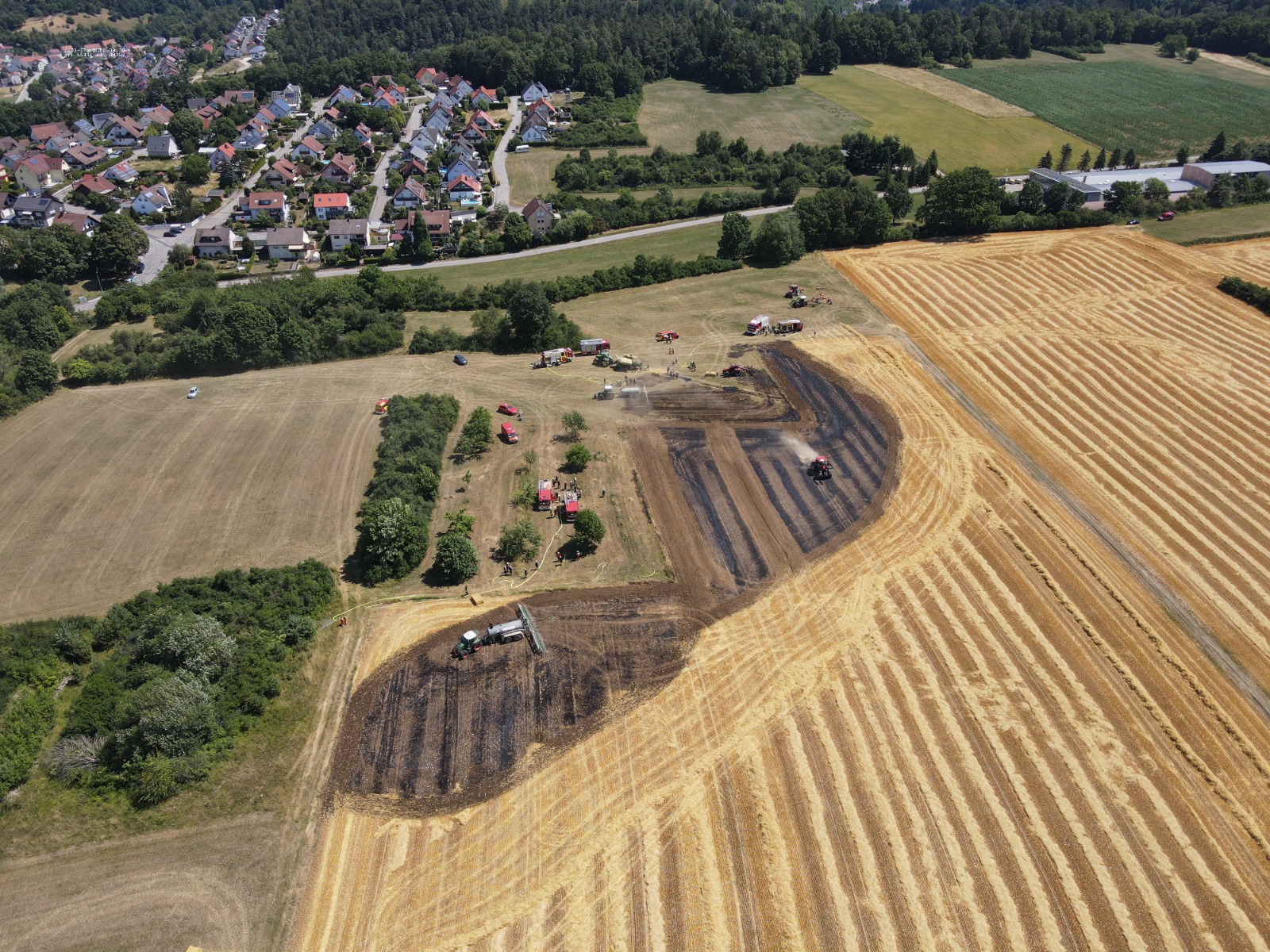 Vor Ort hatte bereits der Fahrer eines Traktors das Feuer an seiner Ballenpresse weitgehend gelöscht, jedoch hatten die Flammen schon auf angrenzende Felder und Wiesen übergegriffen. Durch den schnellen Einsatz der ersteintreffenden Feuerwehren unter Einsatzleiter Stefan Ringer, sowie dem Landwirt konnte eine weitere Ausbreitung verhindert werden.