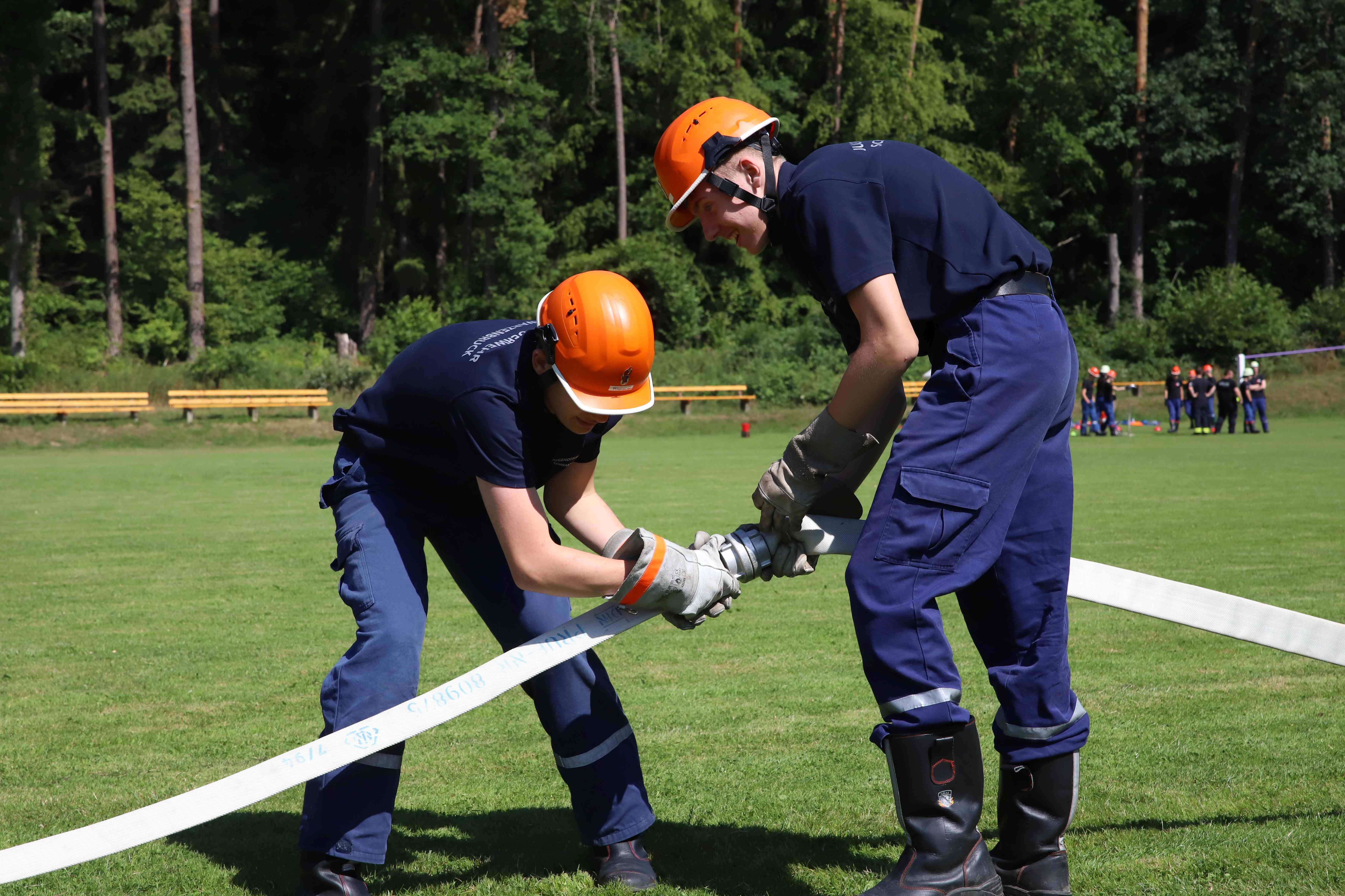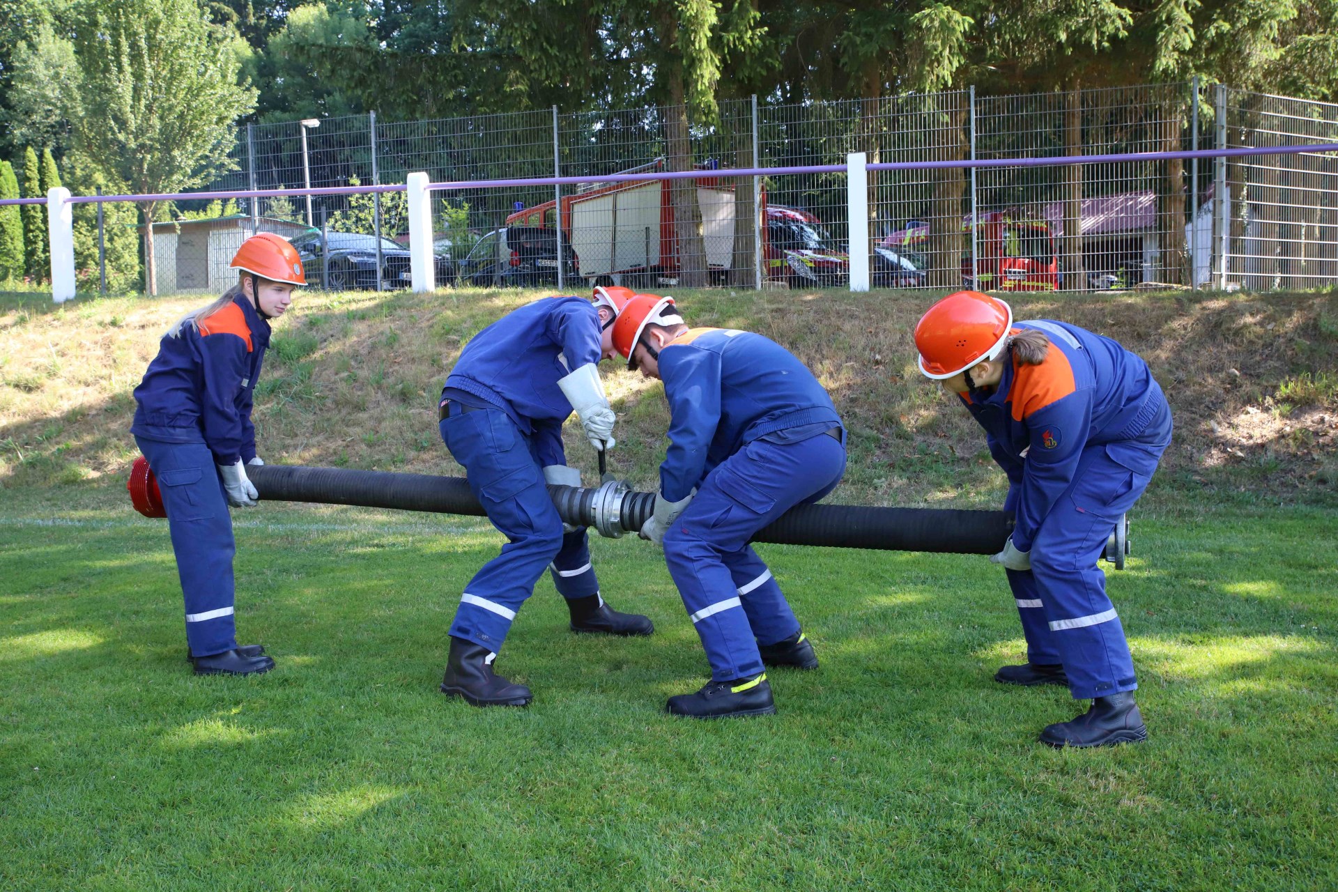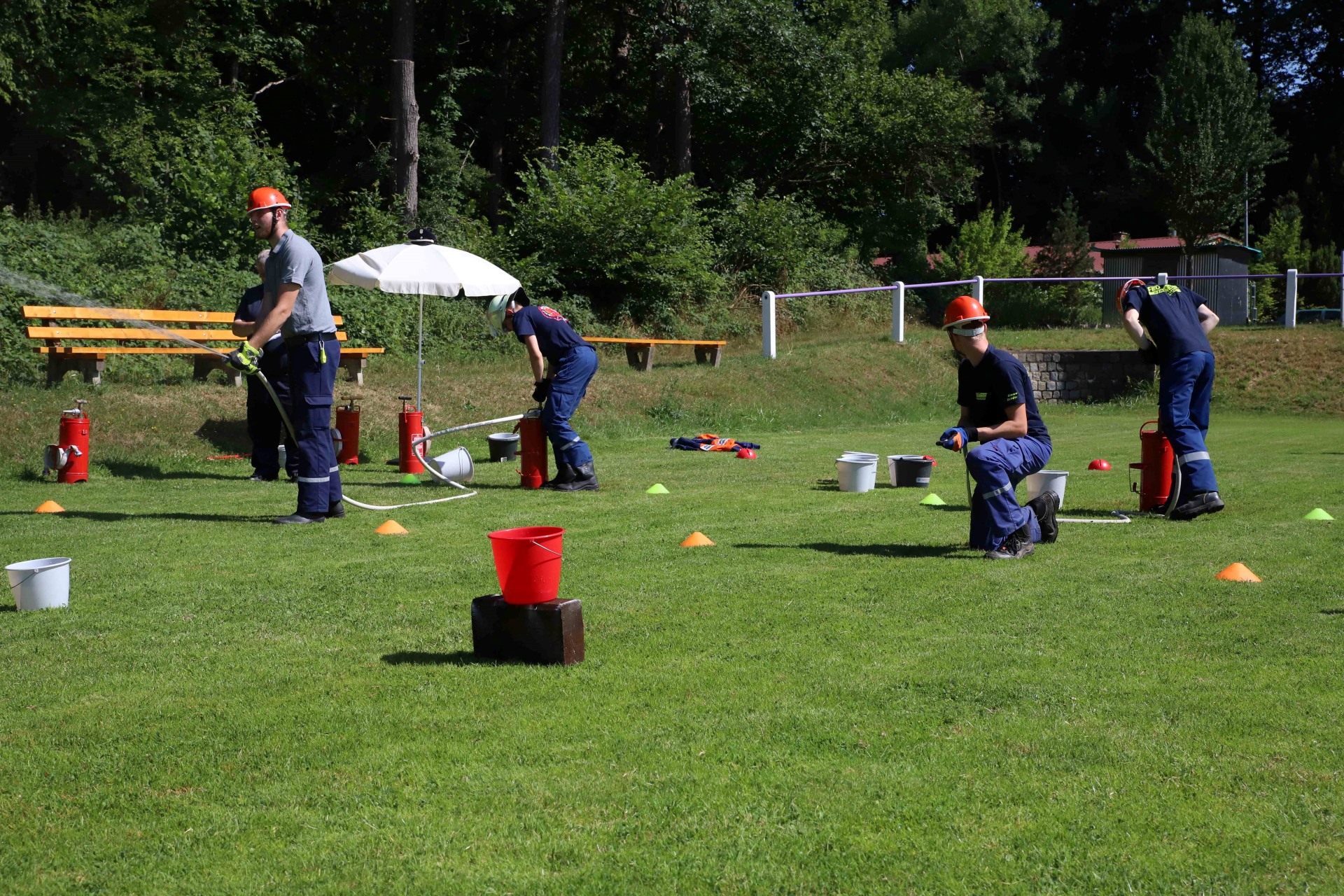 So galt es beispielsweise innerhalb einer vorgegebenen Zeit als Trupp eine 90 Meter C-Schlauchleitung zu kuppeln, mit der Kübelspritze einen Eimer umzuspritzen, eine Saugleitung zu kuppeln oder ein Strahlrohr korrekt vorzunehmen.