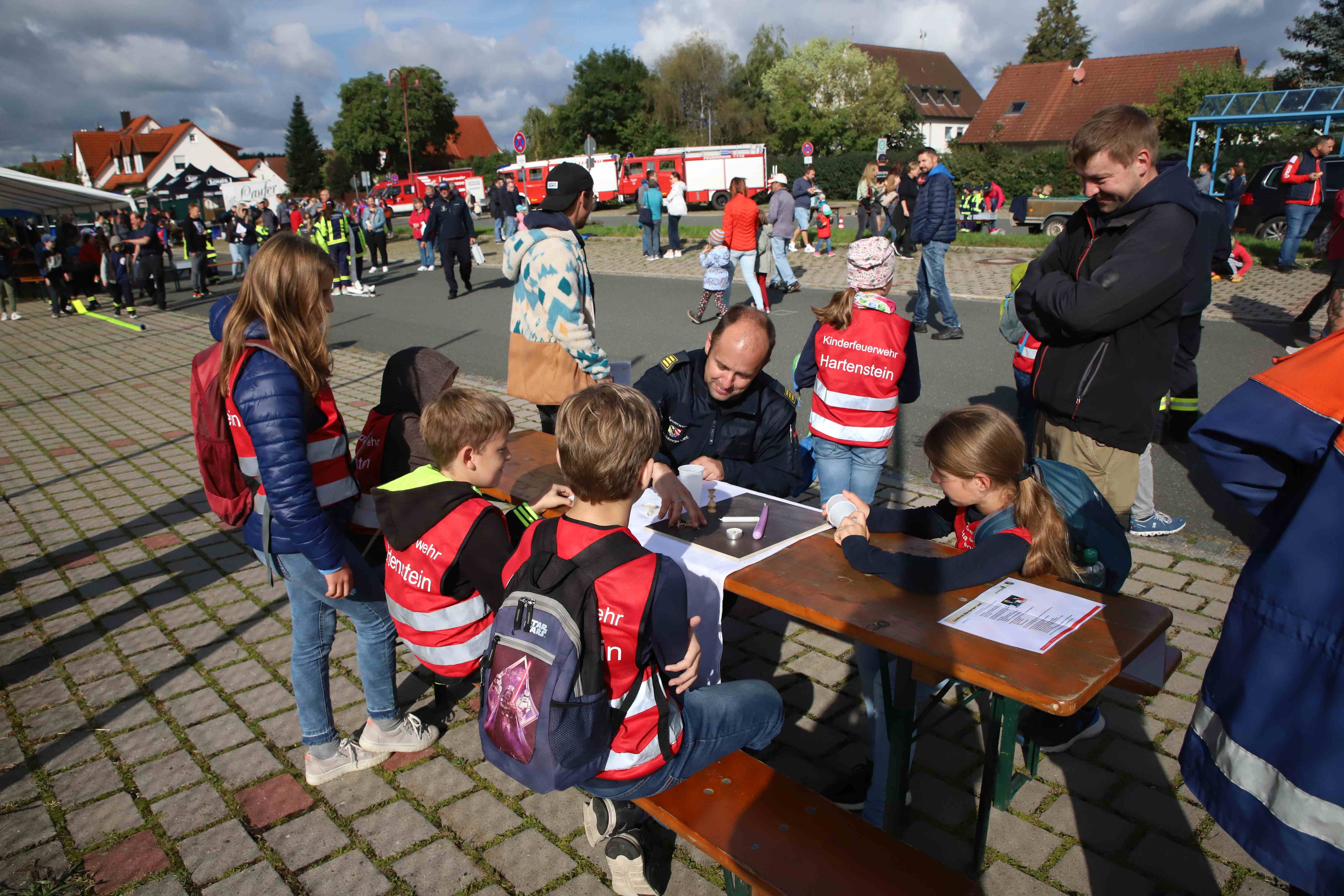 Insgesamt nahmen 189 Kinder aus 13 Kinderfeuerwehren an der Abnahme teil. Dies stellte sowohl bei der Anzahl der Kinder als auch der teilnehmenden Gruppen nochmal einen deutlichen Zuwachs im Vergleich zur gelungenen Premiere des vergangenen Jahres dar. Über diesen großen Zuspruch freuten sich auch Landrat Armin Kroder und Thomas Kraußer, Bürgermeister der Gemeinde Leinburg, sowie Kreisbrandrat Holger Herrmann und Marco Back, Verantwortlicher für die Kinderfeuerwehren im Nürnberger Land. Sie alle dankten den Verantwortlichen für ihre wichtige und wertvolle Arbeit und hoben in ihren Grußworten die Bedeutung der Nachwuchsarbeit für die Zukunft der Feuerwehren hervor.