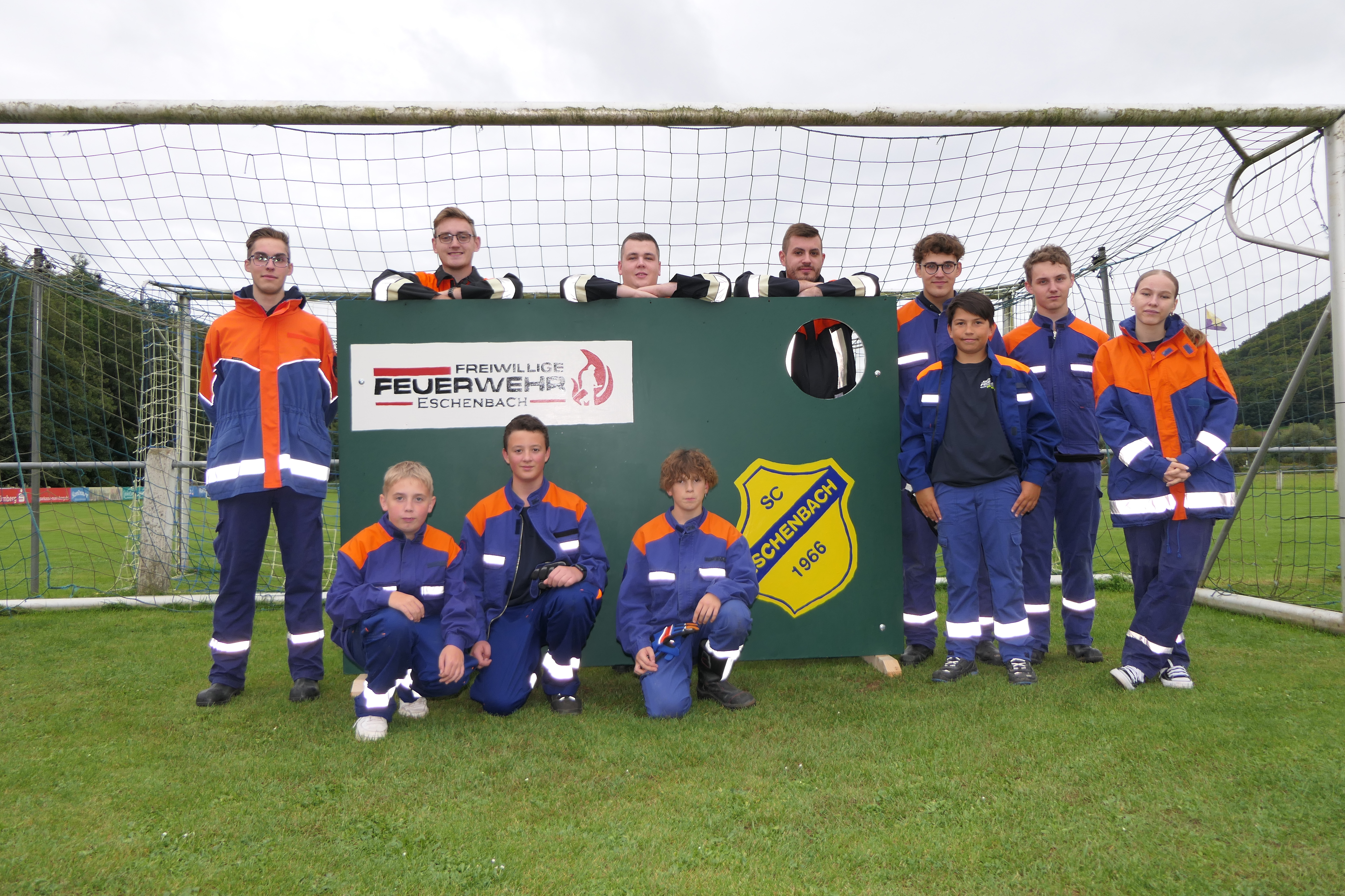 Weiterhin gab es für die ganz kleinen verschiedene Möglichkeiten sich mit dem Thema Feuerwehr zu beschäftigen wie z.B. mit Bastelbögen und Ausmalvorlagen. Gut ausgelastet war auch die Hüpfburg in Form eines Rettungswagens, der von der Rot Kreuz Bereitschaft Lauf zur Verfügung gestellt wurde. Im Rahmen der Teambildung bei der Jugendfeuerwehr Eschenbach wurde im Vorfeld der Veranstaltung eine Torwand gebaut. Diese wurde nach der Begrüßung feierlich an den stellvertretenden Vorstand des SC Eschenbach übergeben.