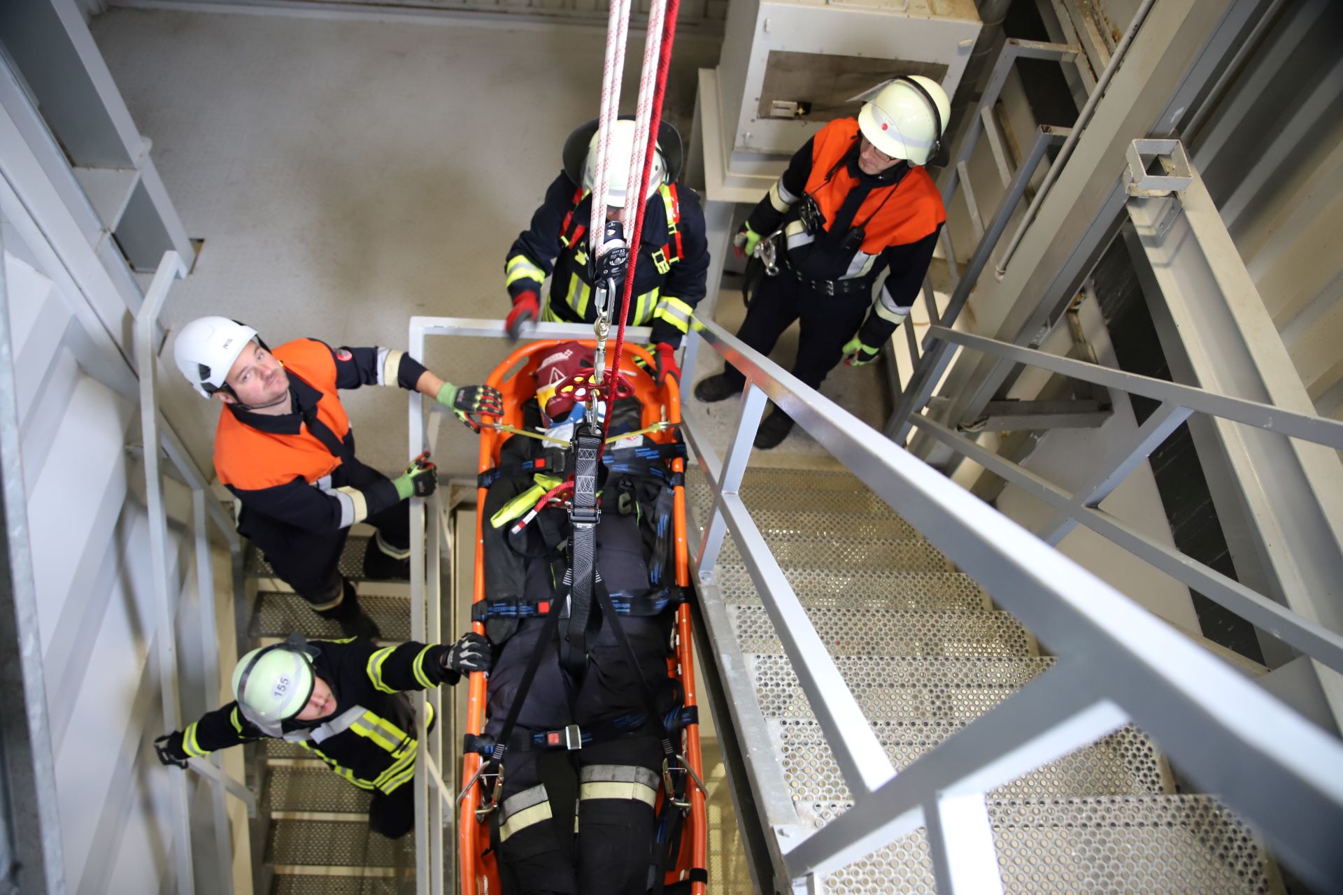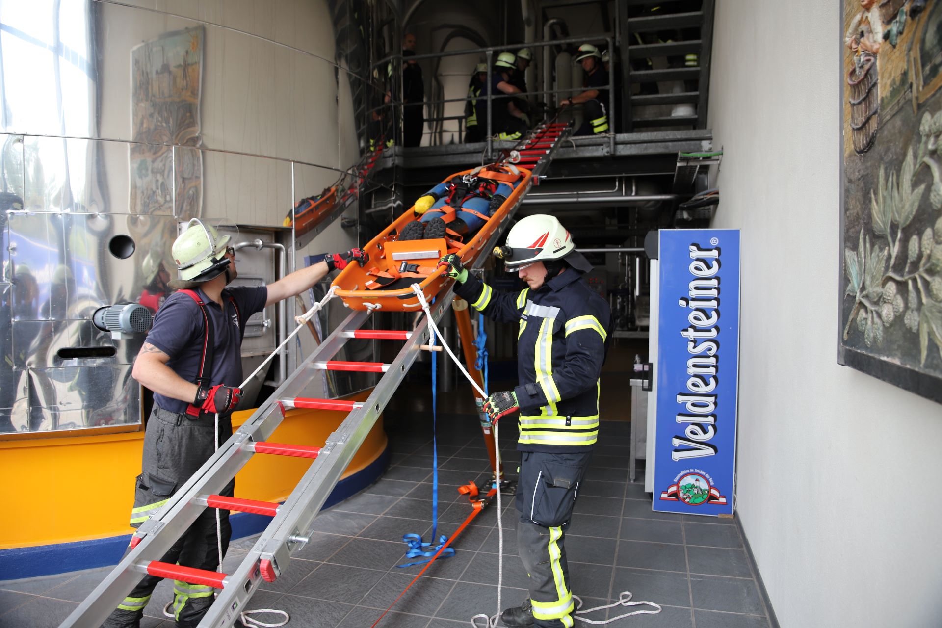 An der ersten Station wurde im Turm der Brauerei das Pendeln einer Schleifkorbtrage aus dem 6. OG durch ein Treppenhaus geübt. Hier galt es mit geeigneten Festpunkten und redundanter Sicherung einen möglichst sicheren, aber gleichzeitig auch zügigen Lösungsansatz zu finden. Ebenso wurde die Möglichkeit die Person über das Treppenauge abzulassen besprochen. Dabei zeigte sich bei den unterschiedlichen Ansätzen der Gruppe, dass, wie so oft, viele Wege nach Rom führen und es auch in der Absturzsicherung nicht den einen richtigen Weg gibt.