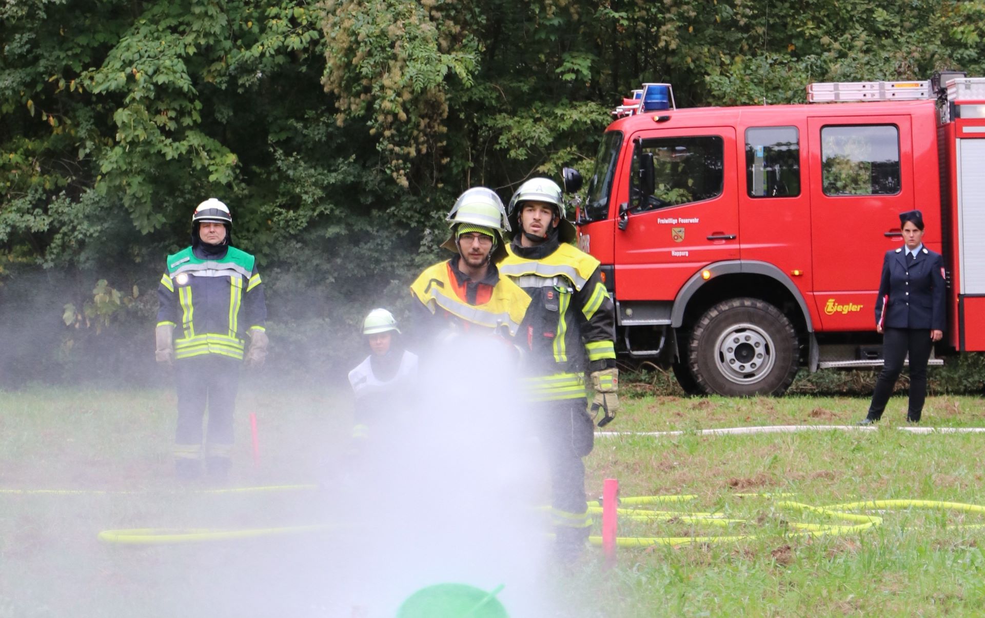 Unter Anleitung von Ausbilder und Gruppenführer Marco Müller traten die Happurger Frauen und Männer dann zur Leistungsprüfung an. Abgenommen wurde die Löschübung von der Schiedsrichterin Barbara Winter und den Schiedsrichtern Roland Gentsch (Kreisbrandmeister) und Thorsten Brunner (Kreisbrandinspektor). Sie konnten beiden Gruppen nach Abschluss ein ausgezeichnetes Prüfungsergebnis bescheinigen.