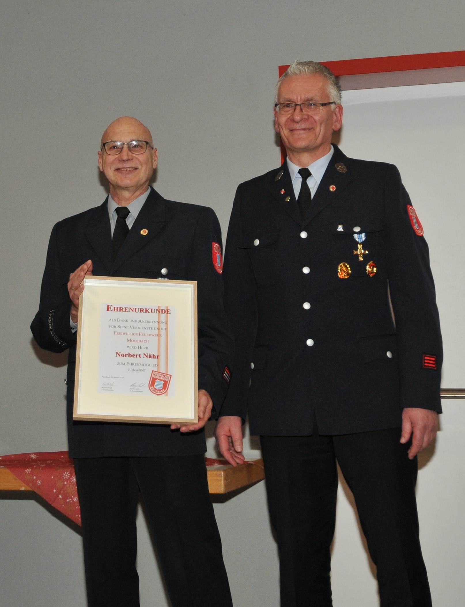 Auch der Verein konnte zahlreiche Ehrungen für langjährige Mitgliedschaft und besondere Verdienste für die Feuerwehr vergeben und Reiner Weigl ernannte Norbert Nähr zum Ehrenmitglied. Der Kamerad Leo Bauer war bereits im Sommer anlässlich seines Ausscheidens aus der aktiven Wehr zum Ehrenmitglied ernannt worden. Vom Kassier Ralf Kempa wurden die Anwesenden über die stabile finanzielle Situation des Vereins in Kenntnis gesetzt. Die Vereinsmitglieder entlasteten den Kassier und die Gesamtvorstandschaft einstimmig.