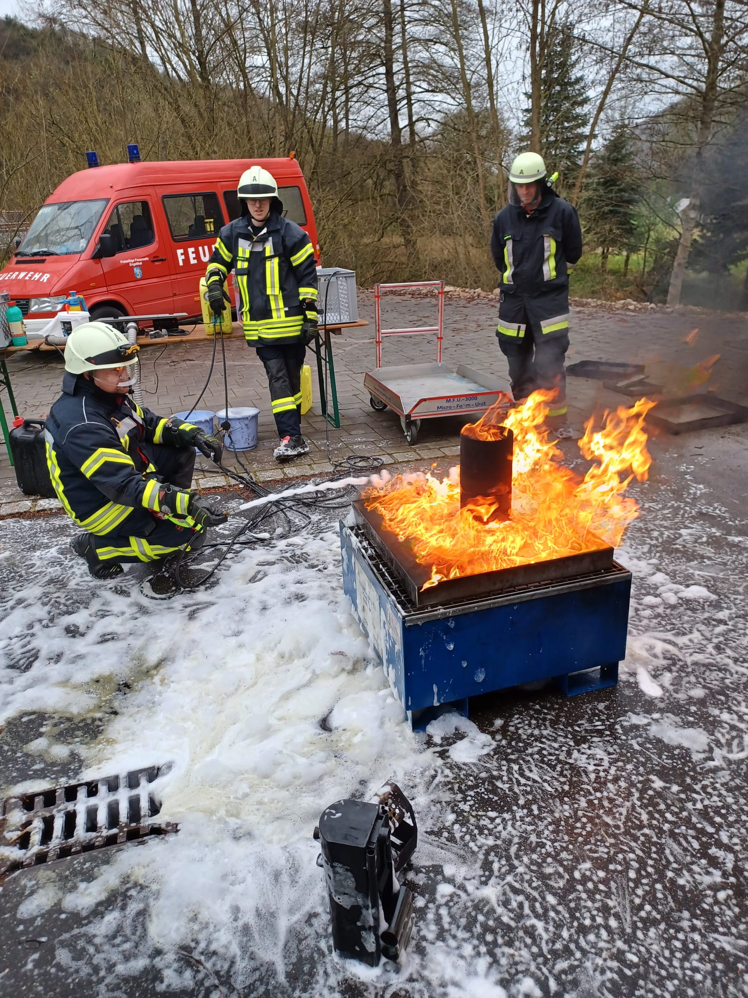 Am Freitag Abend fand der theoretische Teil statt, bei dem Franz Meierhöfer alles über das Thema Schaum erläuterte. Dabei ging er unter anderem auf die Arten von Schaum, Risiken und Gefahren beim Umgang mit Schaum, Gefährdungbeurteilung, Anwendungsmöglichenkeiten, Strahlrohrtechnik und Schaumzusammmensetzung ein.