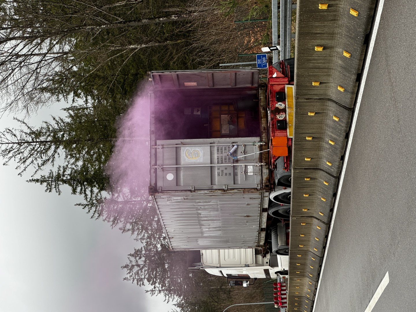 Am Ende des Tages wartete dann noch eine ABC-Lage auf uns. Ein verunfallter LKW auf einem Autobahnabschnitt hatte unbekannte Stoffe geladen. Auch hier war die Übung durch Rauch und Gestank aus dem LKW äußerst realistisch aufgebaut. Der während des letzten Einsatzes einsetzende Schnee komplettierte dann das an diesem Tag erlebte Wetter noch.