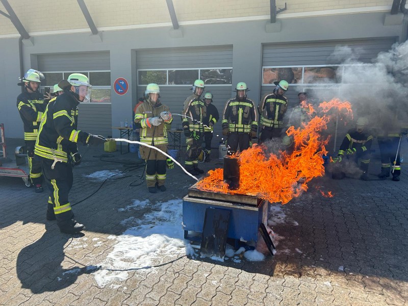 Im Anschluss wurde die Theorie dann in die Praxis umgesetzt. Mit Hilfe des Schaumtrainers konnten verschiedene Einsatzszenarien vom Flüssigkeitsbrand bis hin zum Brand eines Tanklastwagens simuliert und beübt werden.
