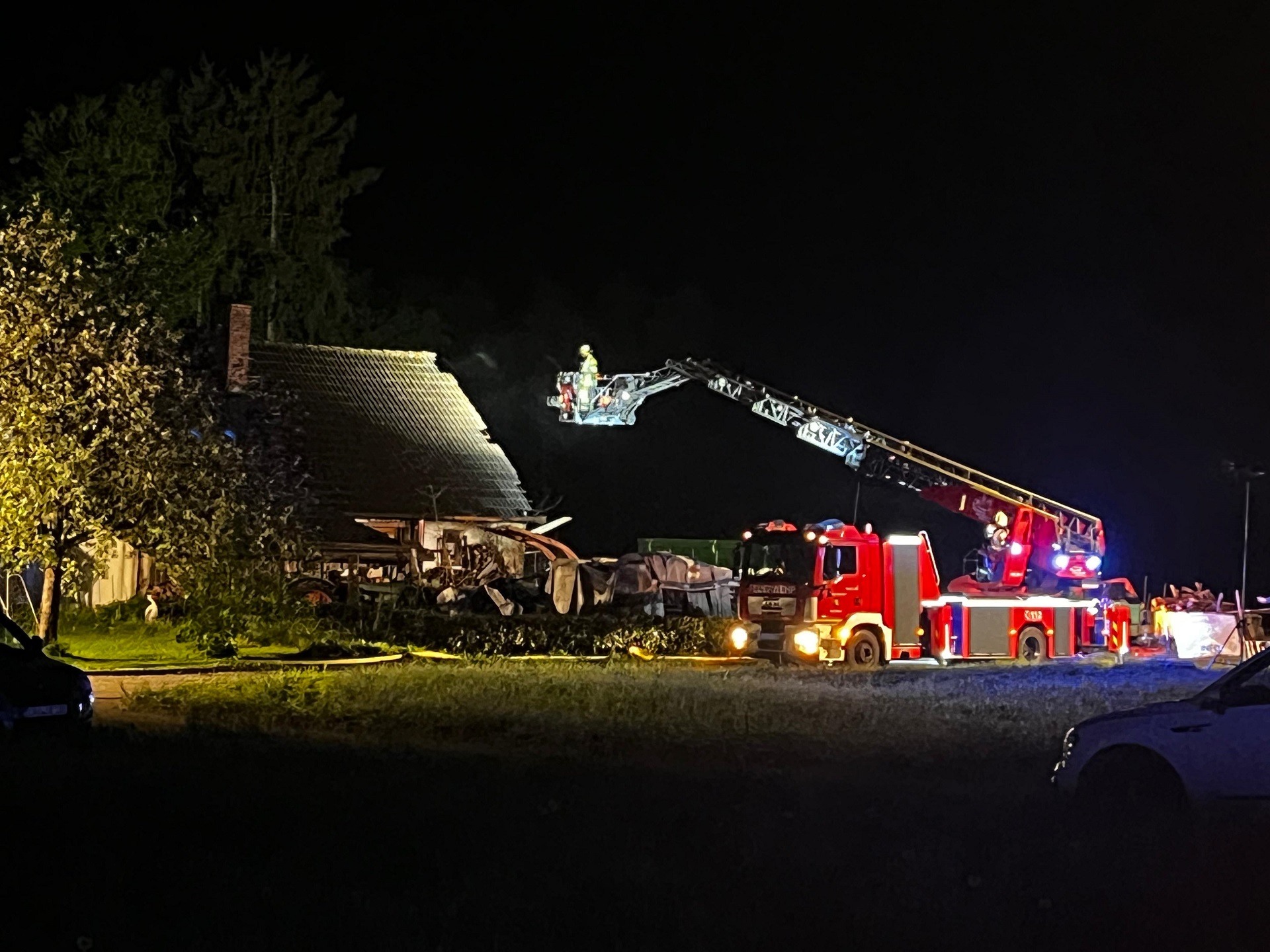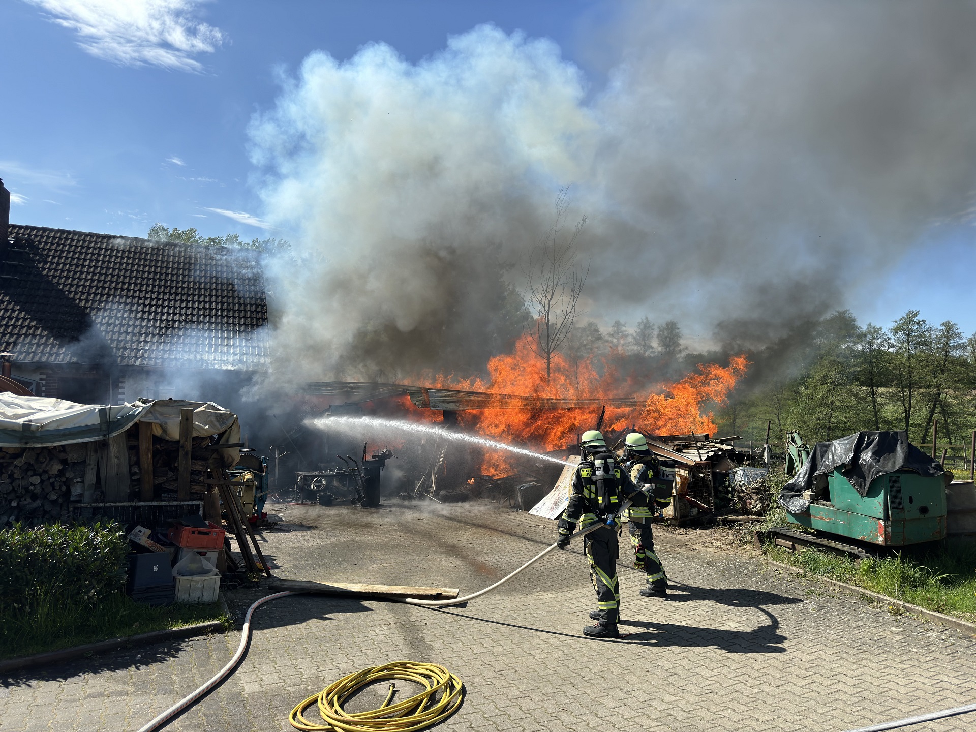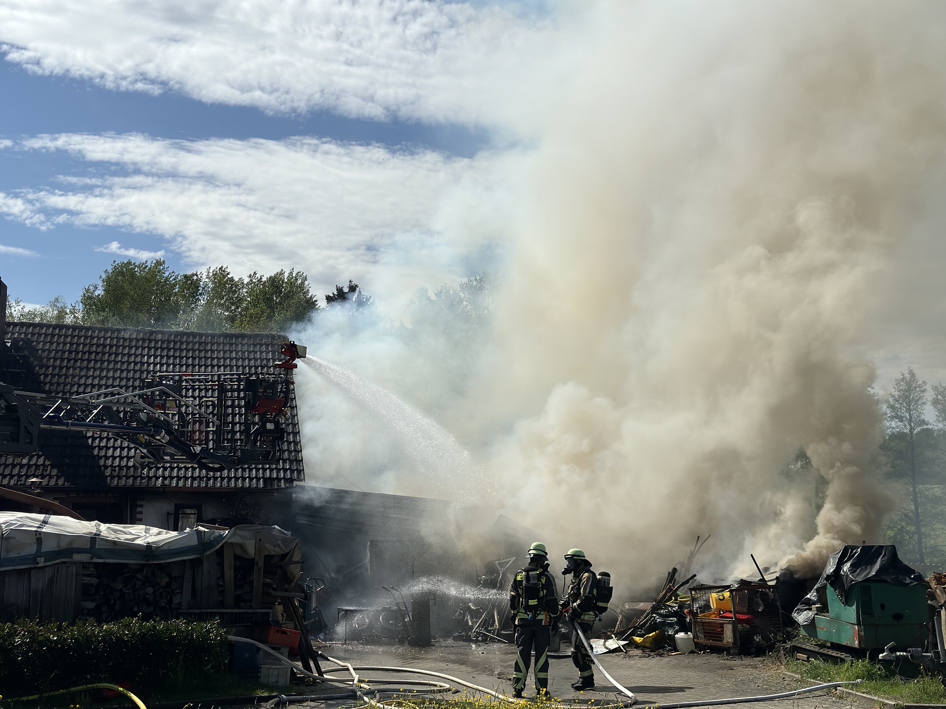 Nach einer weiteren Befragung des Eigentümers war klar, dass der Anbau als Werkstatt gedient hatte und wir mit unbekannten Mengen von Treibstoffen und Schmiermitteln konfrontiert waren. Mit dieser Information konnten wir endlich nachvollziehen, warum wir mit einem derart intensiven Feuer konfrontiert waren - und entschieden uns, weitere Verstärkung nachzufordern. Die Feuerwehren Moosbach und Feucht kamen mit Ausrüstung und Mannschaft, von der Feuerwehr Hersbruck kam der Abrollbehälter mit Atemschutzgeräten zur Einsatzstelle. Mittels einer weiteren Versorgungsleitung von der Südumgehung her förderten wir nun weitere Hunderte von Litern Löschwasser pro Minute, um dem Feuer die enorme Energie zu entziehen und nach wie vor die Nachbarschaft abzuriegeln. Denn nicht nur das angrenzende Wohnhaus war in Gefahr, sondern auch ein Pferdestall mit mehreren Boxen.