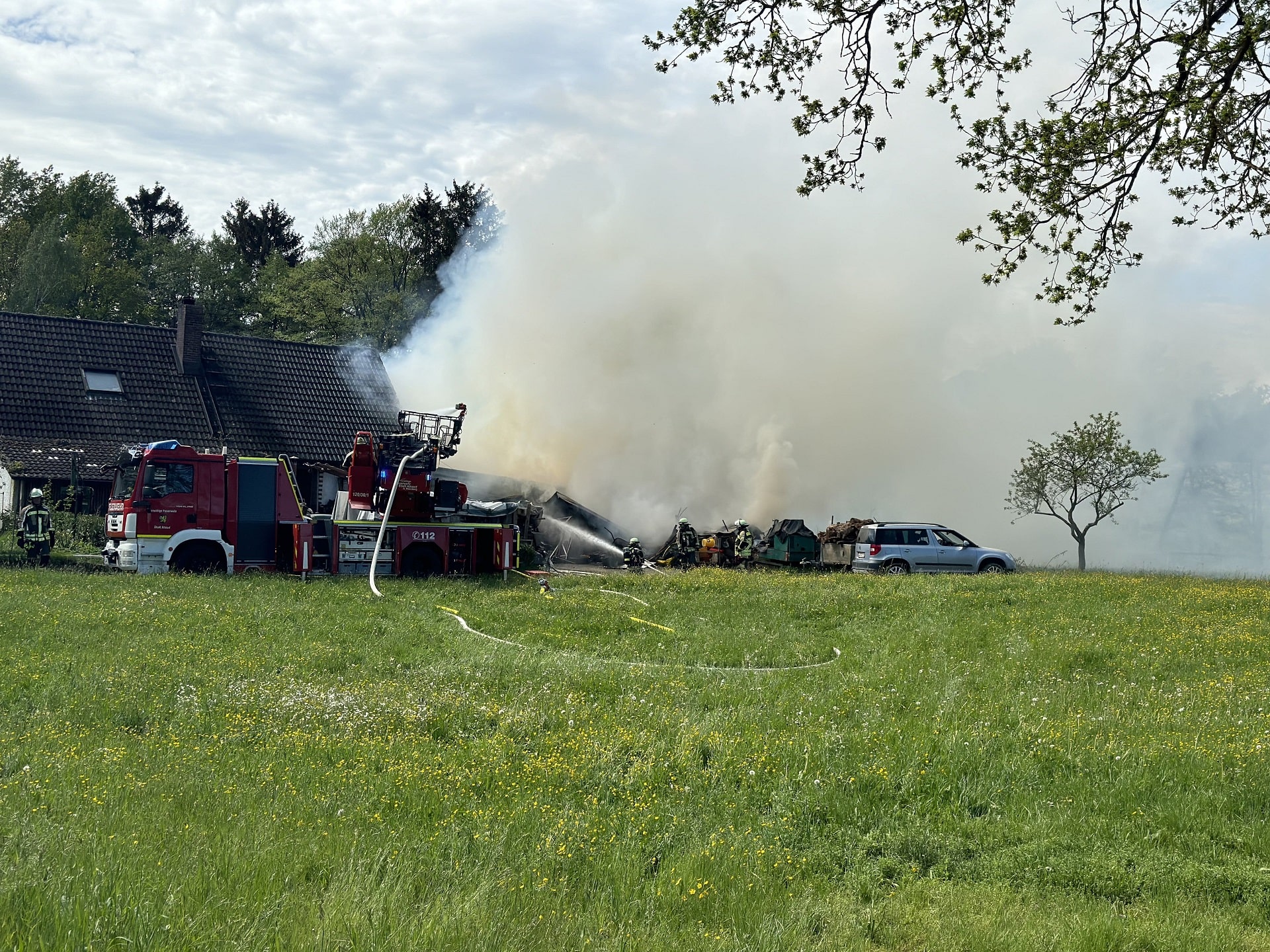 Trotz des schnellen, konsequenten und massiven Einsatzes von nunmehr drei C-Rohren und einem B-Rohr mussten wir feststellen, dass das Feuer immer heftiger wurde, wofür wir zunächst keine Erklärung hatten. Zwischenzeitlich informierte uns der Eigentümer des Hauses, dass sich zwei bis drei Gasflaschen in dem Anbau befänden. Noch während der Weitergabe dieser Information an die Angriffstrupps öffnete sich bei einer der Gasflaschen das Sicherheitsventil, und das brennbare Gas "blies ab", was die Intensität der Flammen nochmal verstärkte. Nur Minuten später wurden wir mit einer Explosion konfrontiert, deren Flammenball mehrere Meter Durchmesser hatte. Glücklicherweise waren unsere Trupps soweit in Deckung, dass niemand verletzt wurde.