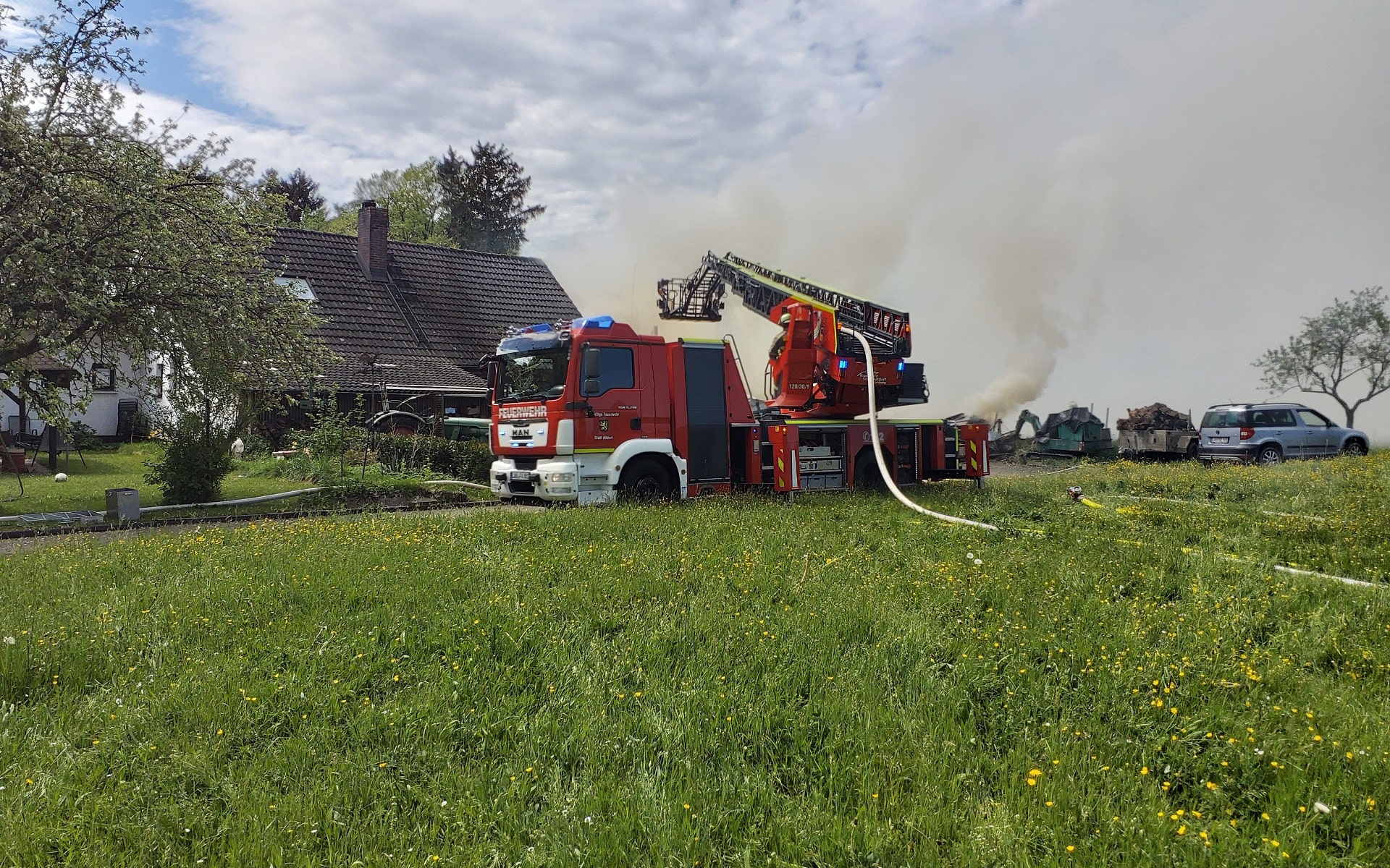 Aufgrund der ungewöhnlich schnellen Brandausweitung und des absehbaren Bedarfs an Atemschutzgeräteträgern und Ausrüstung wurde parallel die Leitstelle gebeten, über eine Erhöhung der Alarmstufe die Feuerwehren Röthenbach bei Altdorf und Winkelhaid zur Unterstützung zu alarmieren. Nur neun Minuten nach der Erstalarmierung war bereits die Drehleiter der Feuerwehr Altdorf an der Einsatzstelle, was uns zusätzlich die Bekämpfung der Flammen von oben ermöglichte. Die hierfür erforderlichen Mengen an Wasser wurden über eine längere Schlauchstrecke vom nächstgelegenen Hydranten am Wertstoffhof herangeführt.