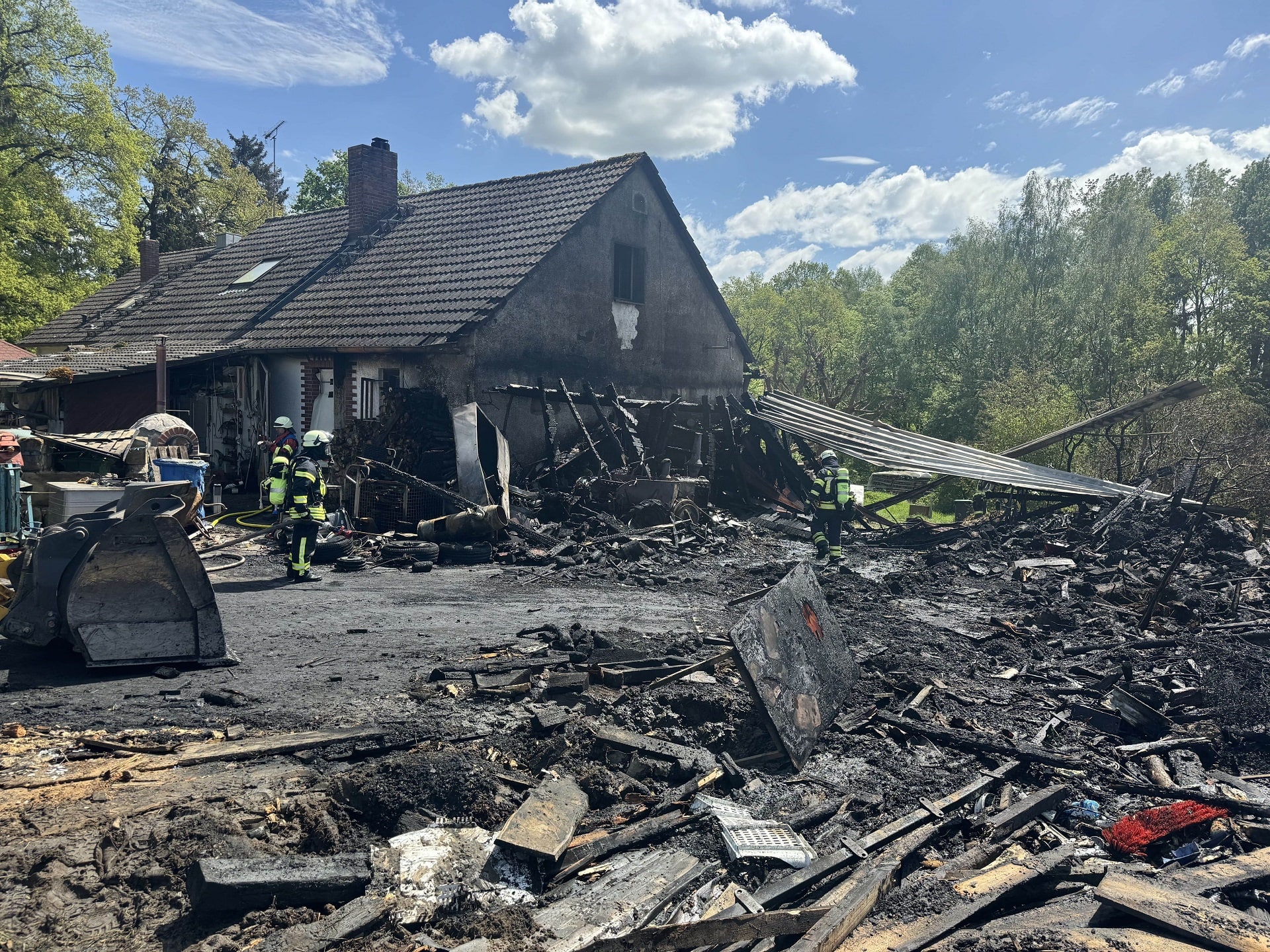 Am frühen Nachmittag war das Feuer soweit abgelöscht, dass die ersten Einheiten dankend aus dem Einsatz herausgelöst werden konnten. Nun machten uns aber die Unwetterwarnungen zunehmend Sorgen, denn wir sahen das Problem, dass einsetzender Starkregen weitere Lösungsmittel aus dem Brandschutt ausspülen und in die Schwarzach schwemmen konnten. Also wurden zwei Großraum-Container geordert und ein Großteil des Brandschutts gleich wetterfest zwischengelagert, um massiven Umweltschäden vorzubeugen. Anschließend wurden mehrere hundert Quadratmeter Folien verlegt, um das Gelände gegenüber möglicher Wassermassen abzuschirmen. Nach mehr als acht Stunden konnte die Einsatzstelle dann endlich an die Bewohner (die glücklicherweise unverletzt geblieben waren) übergeben werden, und es stand die aufwändige Wiederherstellung der Einsatzbereitschaft an.
