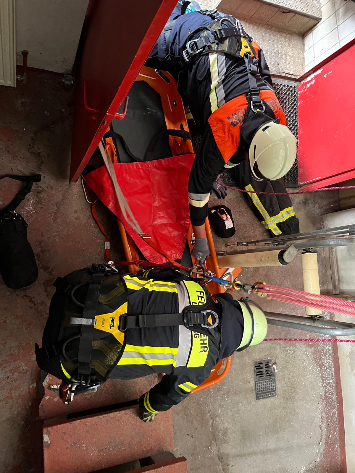 Danach konnten die Ausbilder mit dem praktischen Teil starten. Angenommen wurde, dass im Schlauchturm der Feuerwehr Altdorf eine Person in einen Schacht gefallen ist und gerettet werden muss. Hierzu wurden zweit Retter mit Hilfe des Gerätesatz Absturzsicherung und den Gerätesatz Auf- und Abseilgerät abgelassen. Um den Patienten schonend aus dem Schacht zu retten, wurde dieser in die Schleifkorbtrage gelegt und redundant gesichert. Im Anschluss wurde der Patient mit Hilfe des Gerätesatz Auf- und Abseilgerät aus dem Schacht gezogen.