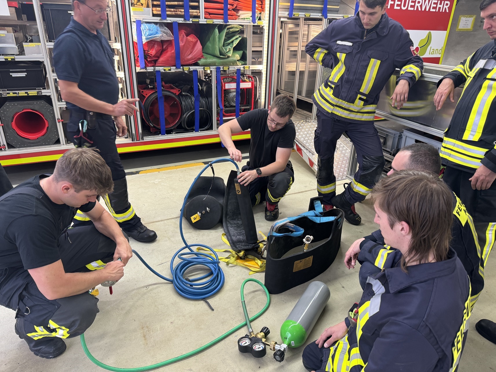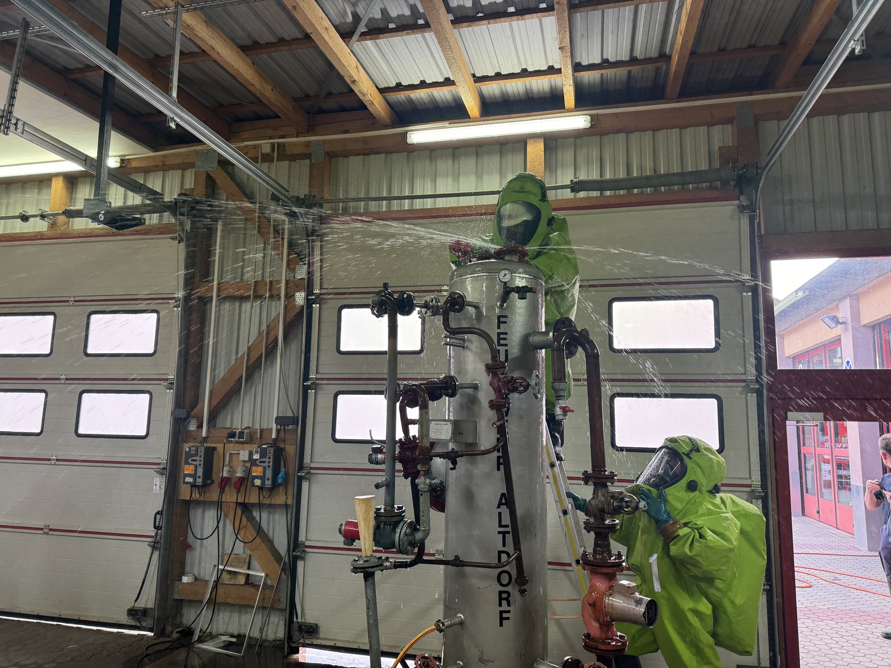 An den Ausbildungsabenden erlernten die Teilnehmer den prinzipiellen Umgang mit den Anzügen, das An- und Ablegen, sowie das Arbeiten unter den erschwerten Bedingungen, z.B. beim Abdichten von Leckagen an einem Kessel und einer Rohrleitung. Weitere Themen waren die spezielle Messtechnik für den Gefahrguteinsatz sowie die Ausstattung des Abrollbehälters Gefahrgut des Landkreises, der in Altdorf stationiert ist.
