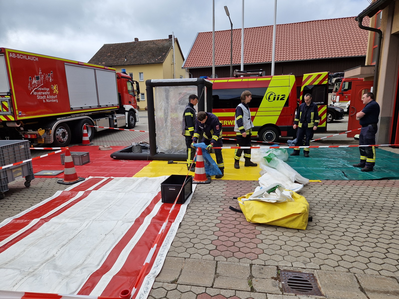 Spezialausrüstung für Arbeiten mit Gefahrgut und die zugehörigen Anzüge sind im südlichen Landkreis derzeit in Altdorf und Feucht vorhanden. Daher werden CSA-Lehrgänge bereits seit vielen Jahren gemeinsam durchgeführt.