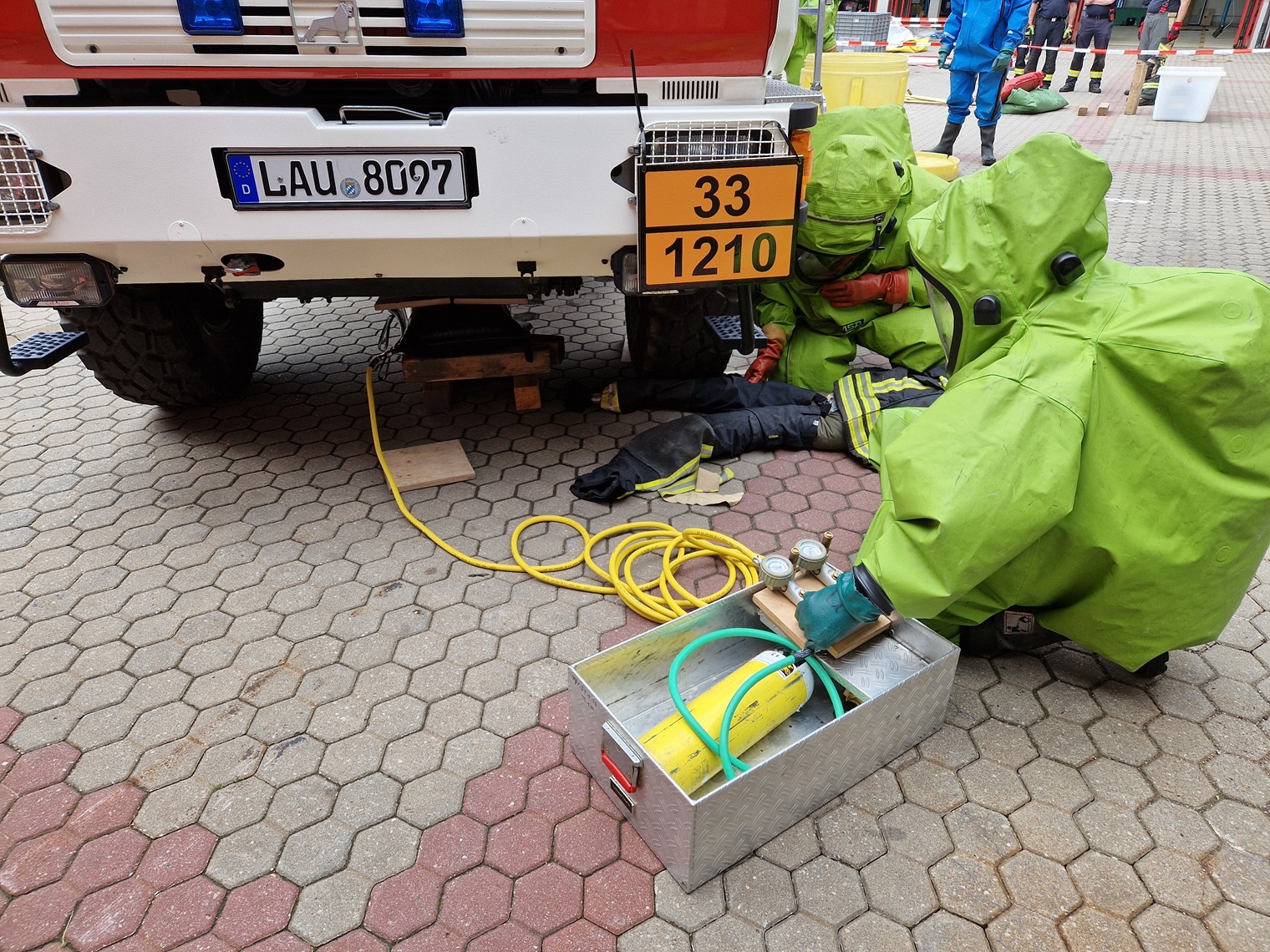Im Anschluss warteten umfangreiche Übungen auf die Teilnehmer, in denen sie unter realen Bedingungen das Gelernte in die Praxis umsetzen mussten. Hierbei wurde das Umladen und Umpumpen von auslaufendem Gefahrgut sowie eine Personenrettung durchgeführt.