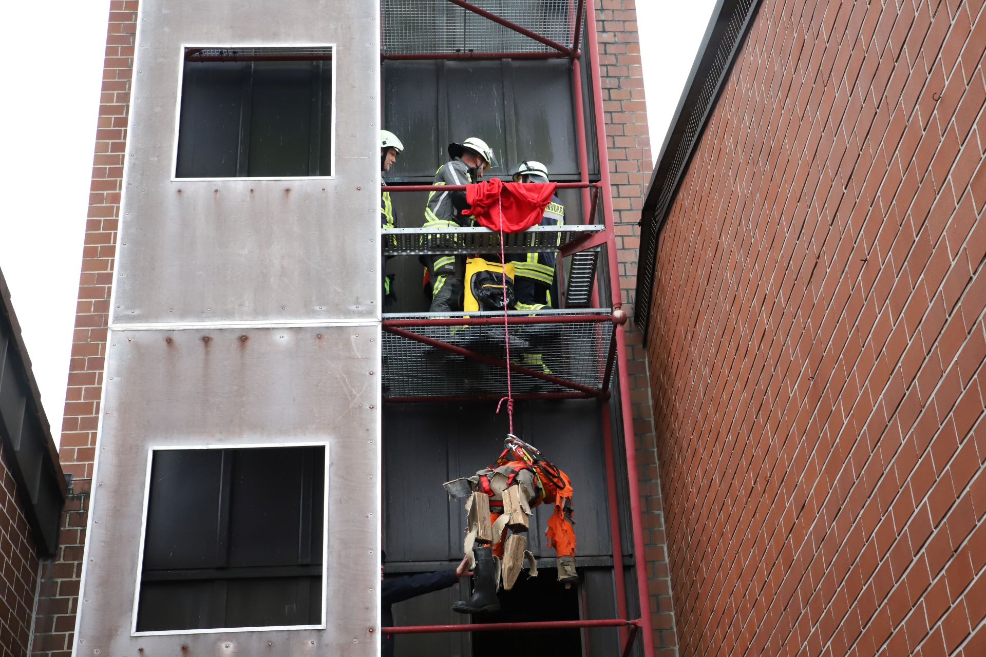 Mit der Sicherung über eine Drehleiter befasste man sich an der nächsten Station. Dies kommt besonders bei Arbeiten auf Dächern oder in absturzgefährdeten Bereichen zum Einsatz, bei denen keine anderen Sicherungsmöglichkeiten bestehen. Die Drehleiter kann hier dann eine wertvolle und wichtige Unterstützung darstellen und für die nötige Sicherheit der Einsatzkräfte sorgen.