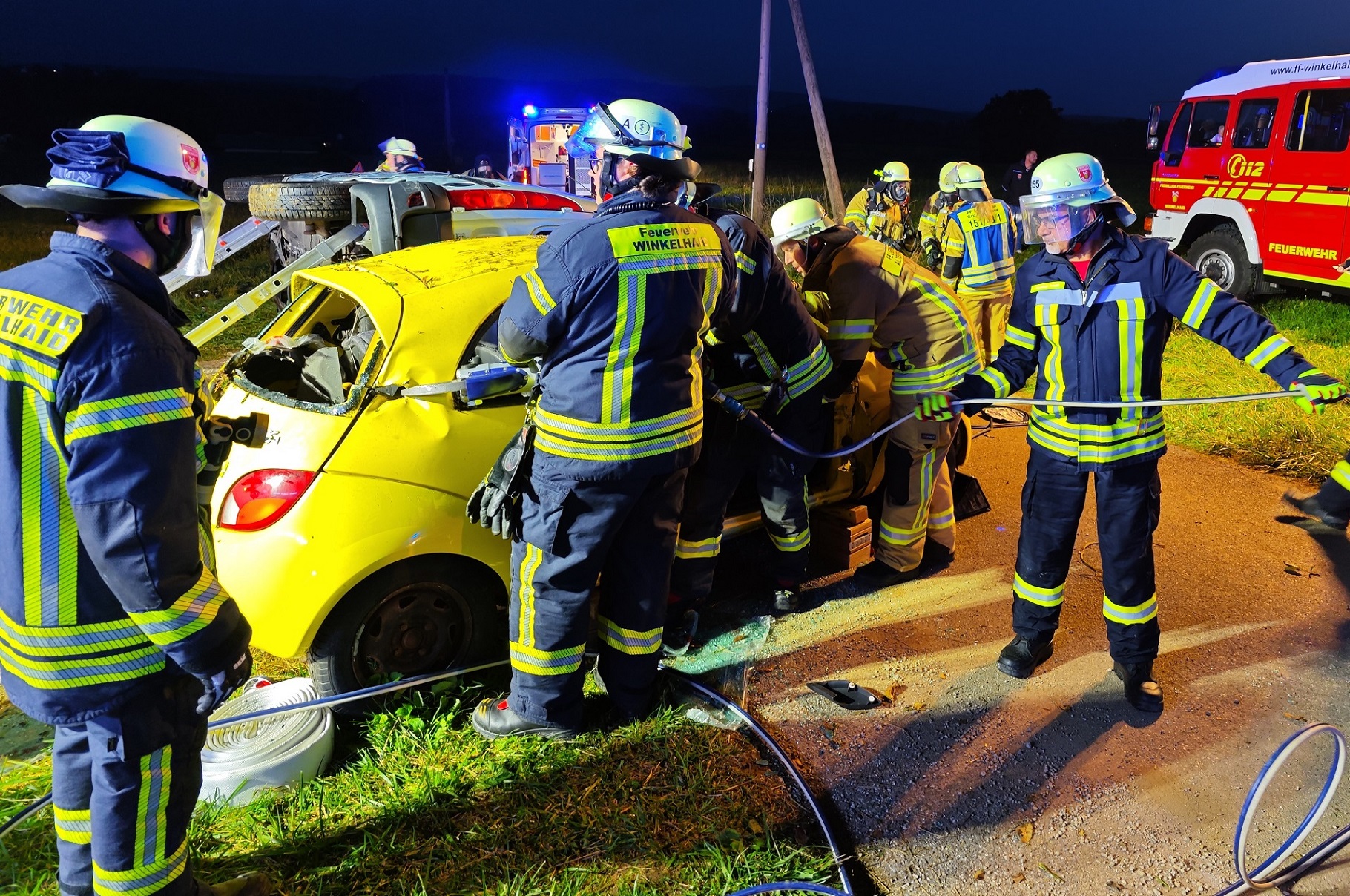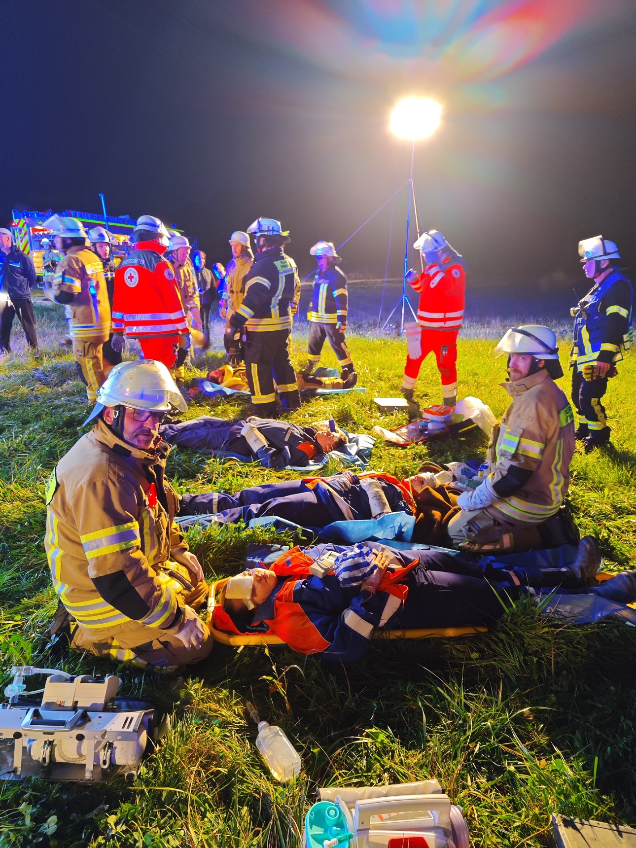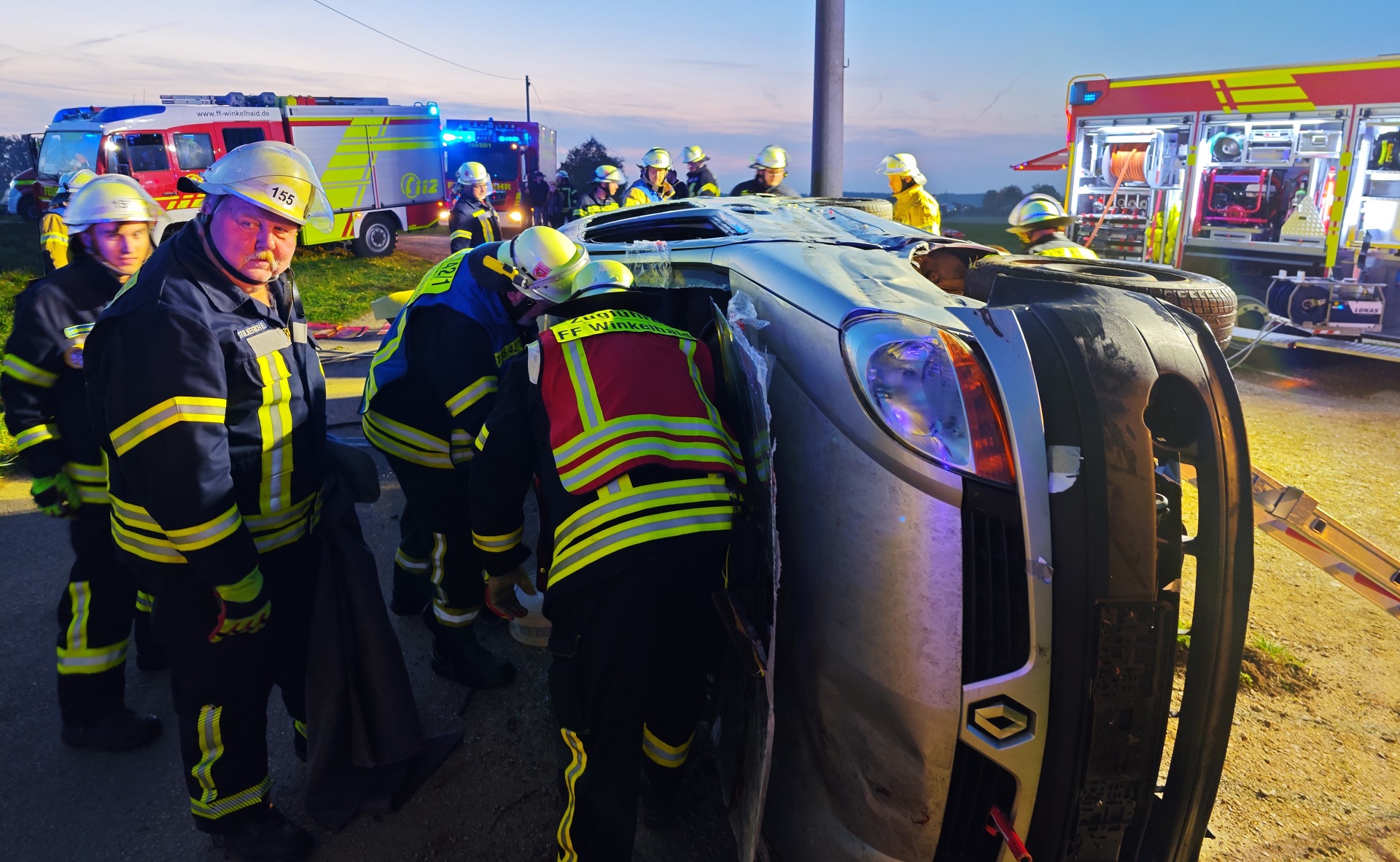 Vor Ort stellte sich den Kräften aus Altenthann bei einer ersten Erkundung folgende Lage dar: Kollision von 2 PKWs, ein PKW liegt auf der Seite, in beiden PKWs befinden sich jeweils 2 Personen, die teils ansprechbar teils bewusstlos sind, eine Person konnte sich selbst befreien und lief verirrt umher und ein Fahrzeug beginnt zu brennen. Es ist wichtig, in solchen Situationen schnell und besonnen zu handeln. Die Sicherheit der Verletzten und der Einsatzkräfte hat oberste Priorität. Als erste Maßnahmen wurde daher die Einsatzstelle großräumig abgesichert und unter schweren Atemschutz mit der Brandbekämpfung begonnen. Parallel begann die Erstversorgung bzw. Betreuung der verletzten oder bewusstlosen Personen sowie die Vorbereitung zum Ausleuchten der Einsatzstelle. Zur besseren Versorgung der Verletzten Fahrzeuginsassen wurde außerdem ein Sammelplatz eingerichtet, der durch weitere Kräfte der BRK-Bereitschaft Feucht-Schwarzenbruck verstärkt wurde. Die nachrückenden Kräfte aus Winkelhaid wurden vom Einsatzleiter eingewiesen und begannen mit der Befreiung der Fahrzeuginsassen. Die beiden Personen im auf der Seite liegenden Fahrzeug konnten von den Einsatzkräften schonend durch die zuvor entfernte Frontscheibe aus dem Fahrzeug gerettet werden. Im zweiten beteiligten Fahrzeug befanden sich 2 eingeklemmte und bewusstlose Personen. Diese wurden durch die Kräfte aus Winkelhaid mittels hydraulischer Rettungsgeräte über den Kofferraum aus dem Fahrzeug befreit. Von Seiten der Kreisbrandinspektion waren KBI Florian Bayer sowie KBM Verena Ullrich und Christian Lankes vor Ort. Ein großes Lob an alle, die an der Übung teilgenommen haben, und ein besonderer Dank an die BRK-Bereitschaft Feucht-Schwarzenbruck für ihre Unterstützung und das realistische Schminken der „Unfallopfer“. Solche gemeinsamen Übungen sind wichtig, um für echte Notfälle vorbereitet zu sein.